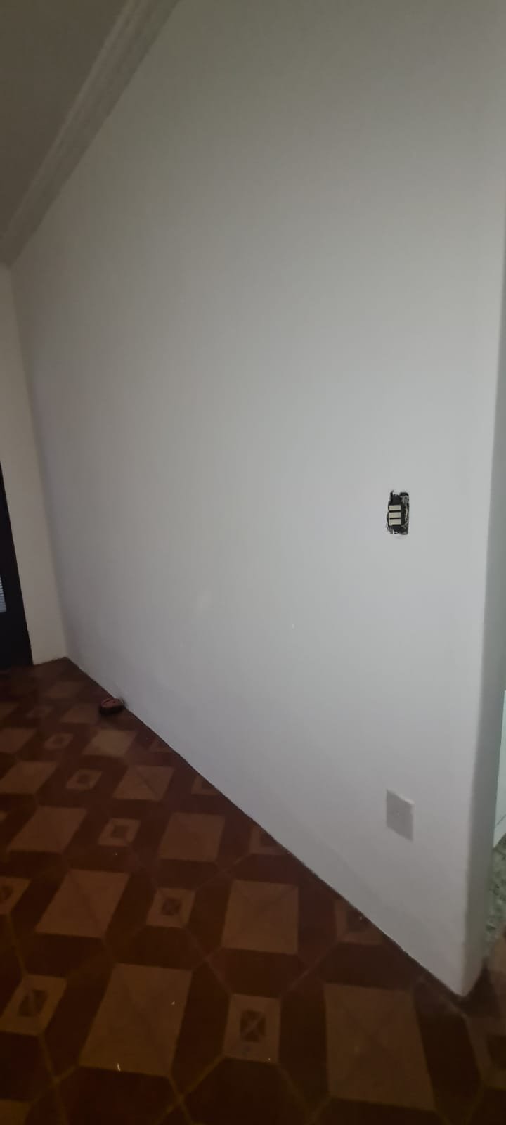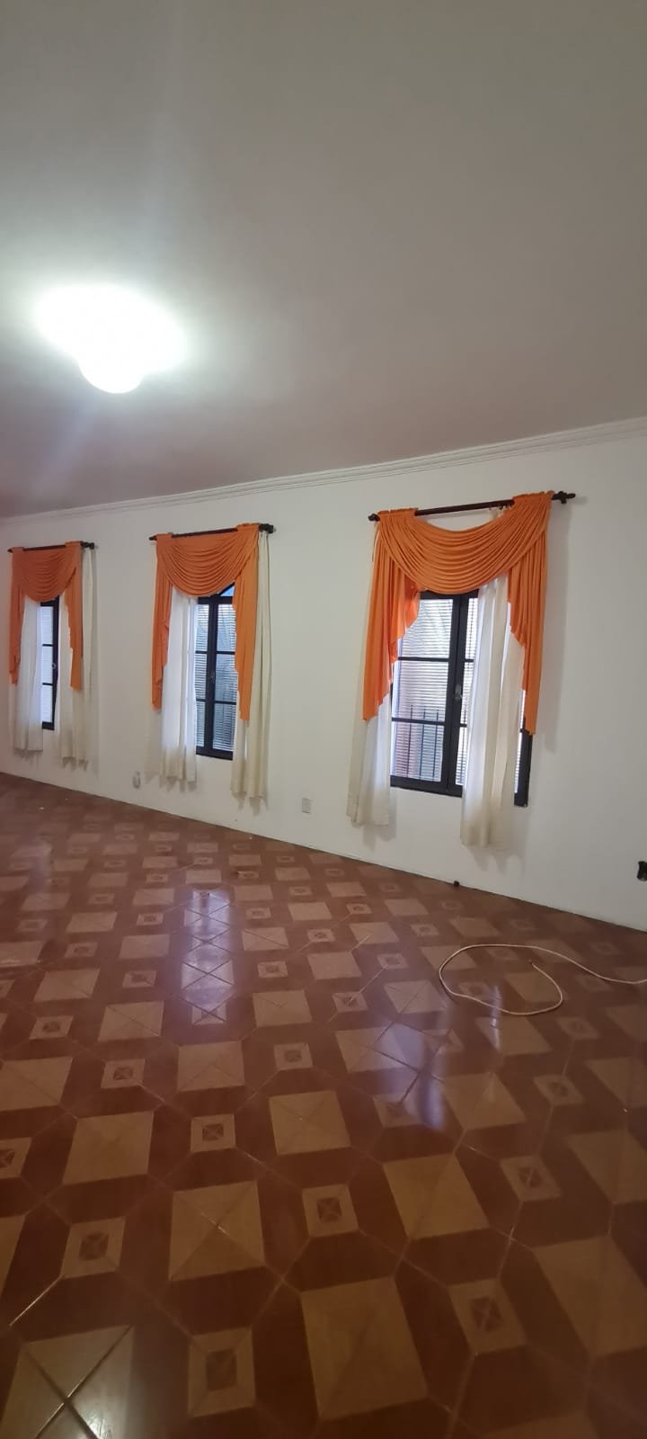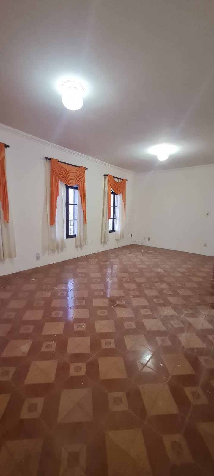 Sala:- Piso cerâmico frio na cor marrom com desgaste e 01 trincado demais em ordem, 06 tomadas em ordem, 03 interruptores em ordem, paredes na branco recém pintadas em ordem, 03 janelas com grades e vidros canelados em ordem, 03 cortinas e suporte na cor marrom em ordem, teto recém pintado na cor branco neve e gola de gesso em ordem, 01 parede com textura na cor laranja recém pintada em ordem, cabos de internet e telefone em ordem, porta de ferro com vidro canelado tranca pegando demais em ordem, fechadura, maçaneta chave em ordem, 02 lustres de vidro e lâmpadas led em ordem.