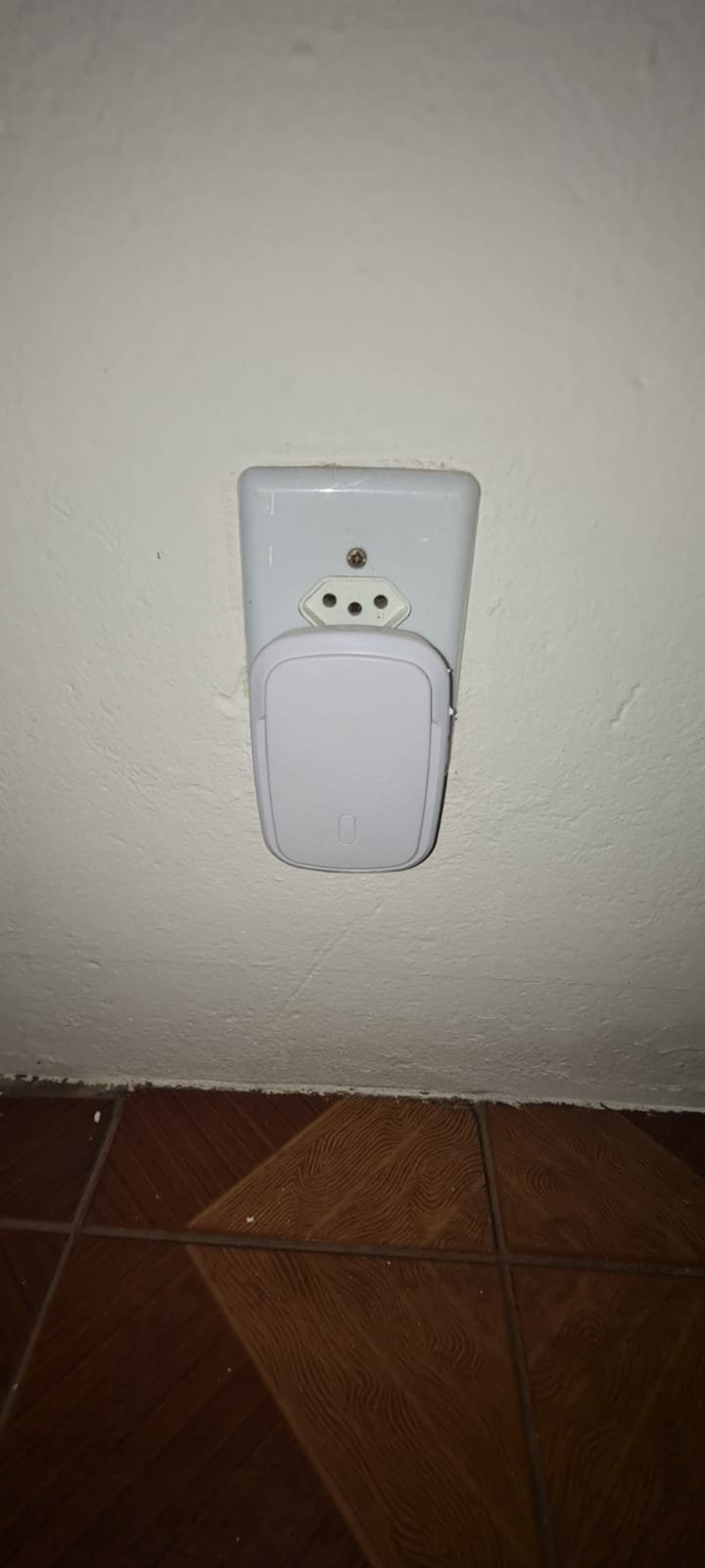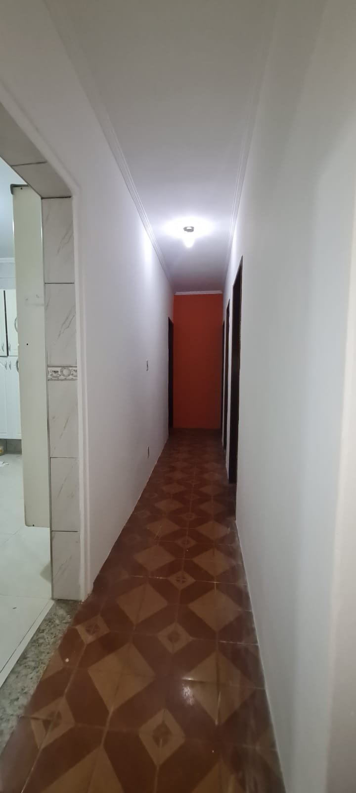 Corredor:- Piso cerâmico na cor marrom em ordem, paredes na cor branco recém pintado em ordem, 01 parede textura na cor laranja recém pintada em ordem, 02 tomadas com espelho em ordem, 01 lâmpada de led com spot em ordem,