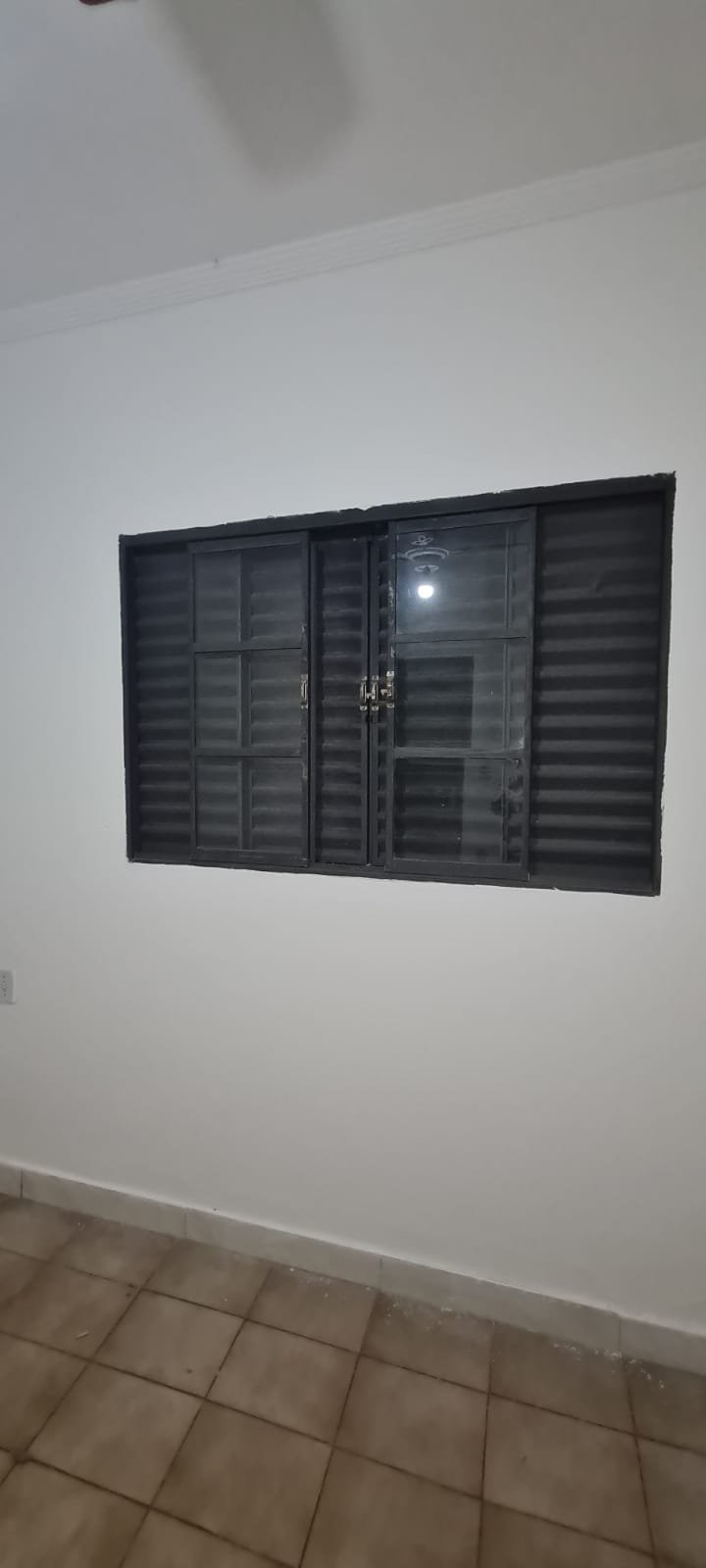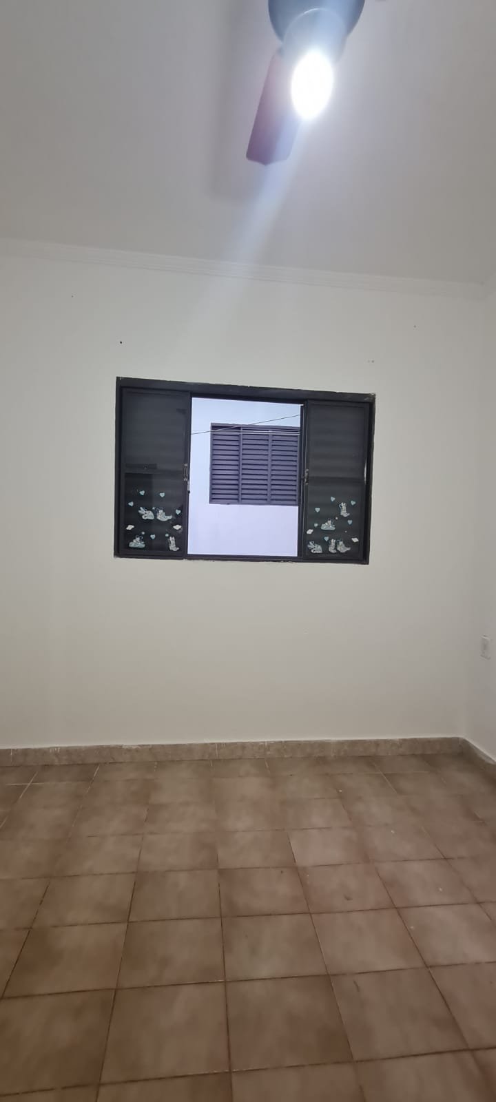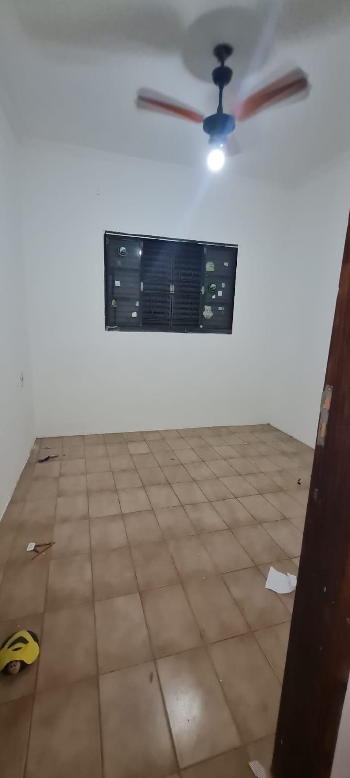 2-QUARTO:- Porta de madeira na cor branco recém pintado em ordem, porta de madeira com maçanetas, dobradiças em ordem, parede na cor branco recém pintado em ordem, teto pintado na cor branca em ordem, 03 tomadas em ordem, ventilador de teto não esta funcionando o restante em ordem, 01 lâmpada led em ordem, 01 interruptor para ventilador e luz em ordem, janela de ferro na cor cinza e grade em ordem, vidro canelado em ordem, piso cerâmico na cor bege em ordem.
