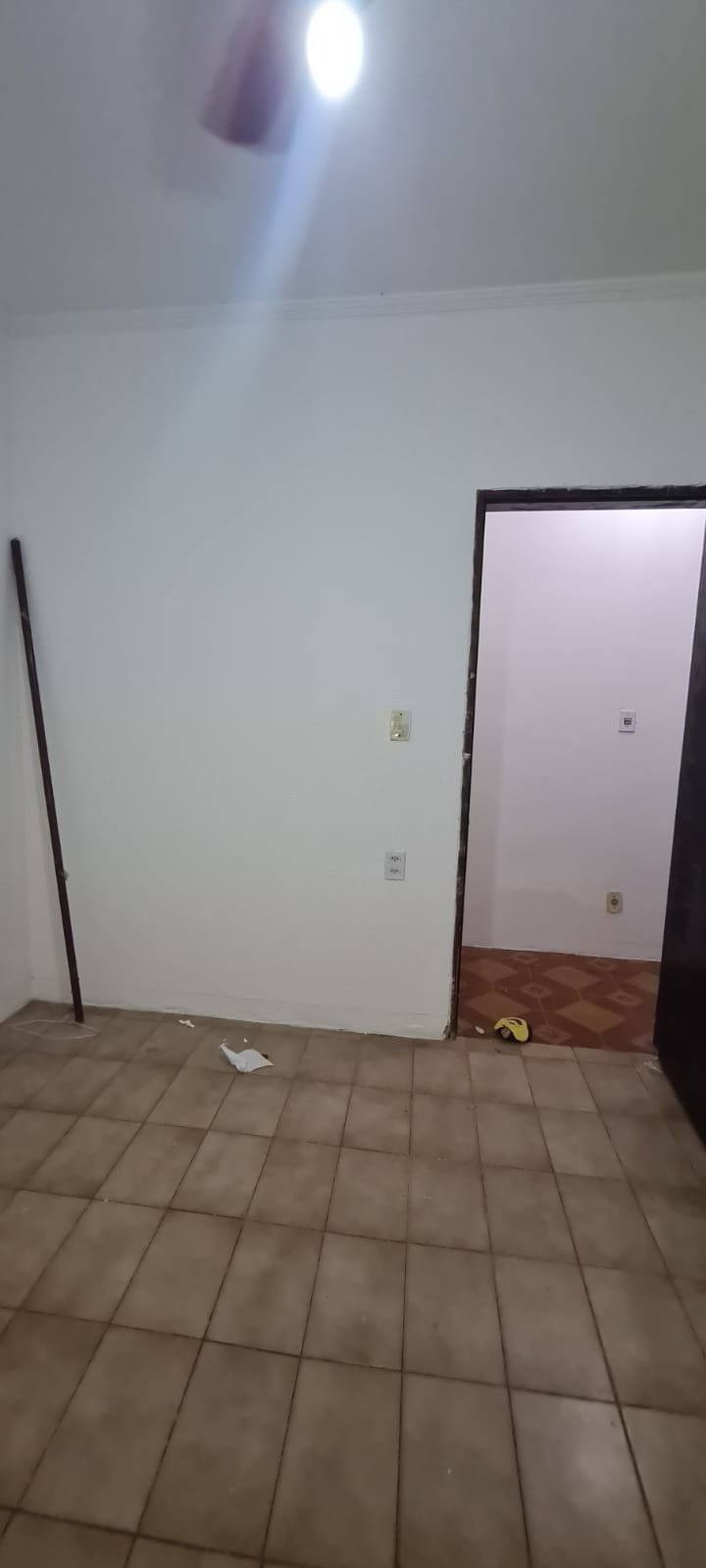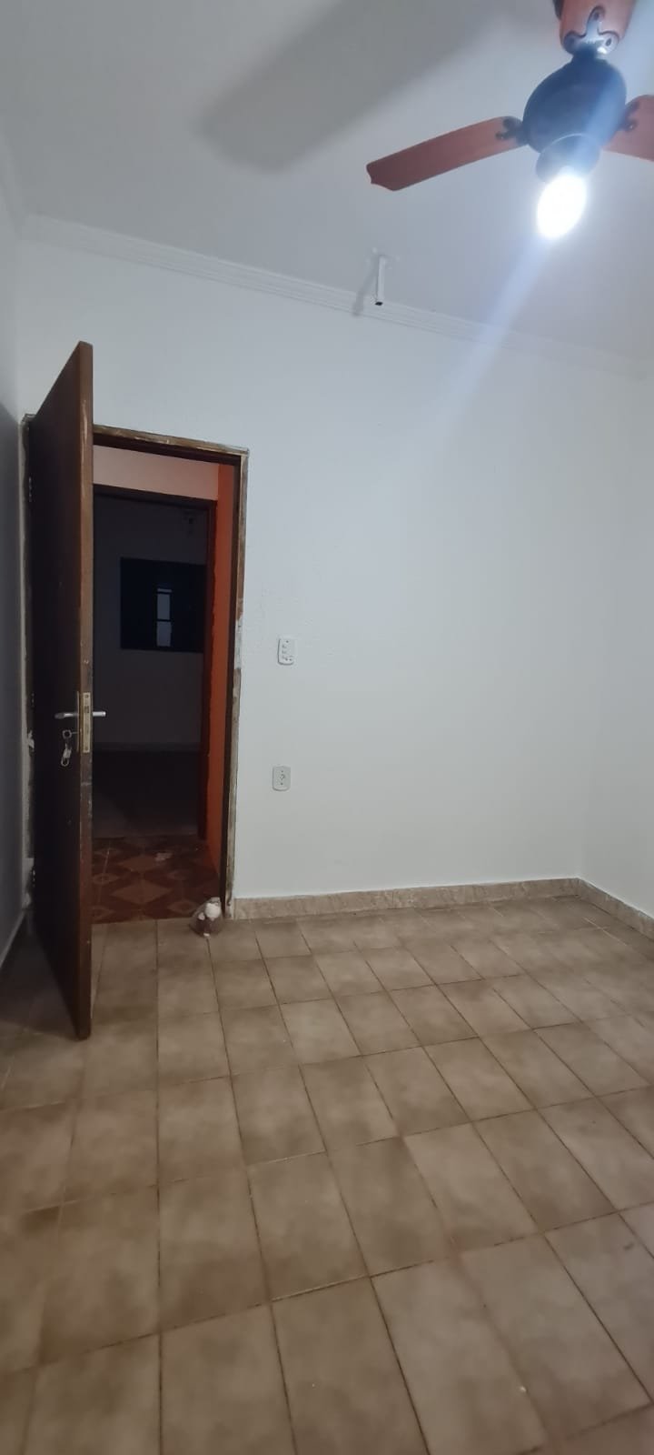 1- Quarto:- Porta de madeira na cor marrom com desgaste natural, fechadura, maçaneta sem marca em ordem, paredes na cor branco recém pintadas em ordem, teto branco com gola de gesso em ordem, 01 ventilador de teto com lâmpada fria em ordem, 02 tomadas em ordem, 01 interruptor para ventilador e luz em ordem, janela de ferro na cor cinza e grade em ordem, vidro transparente em ordem, piso cerâmico na cor bege em ordem.