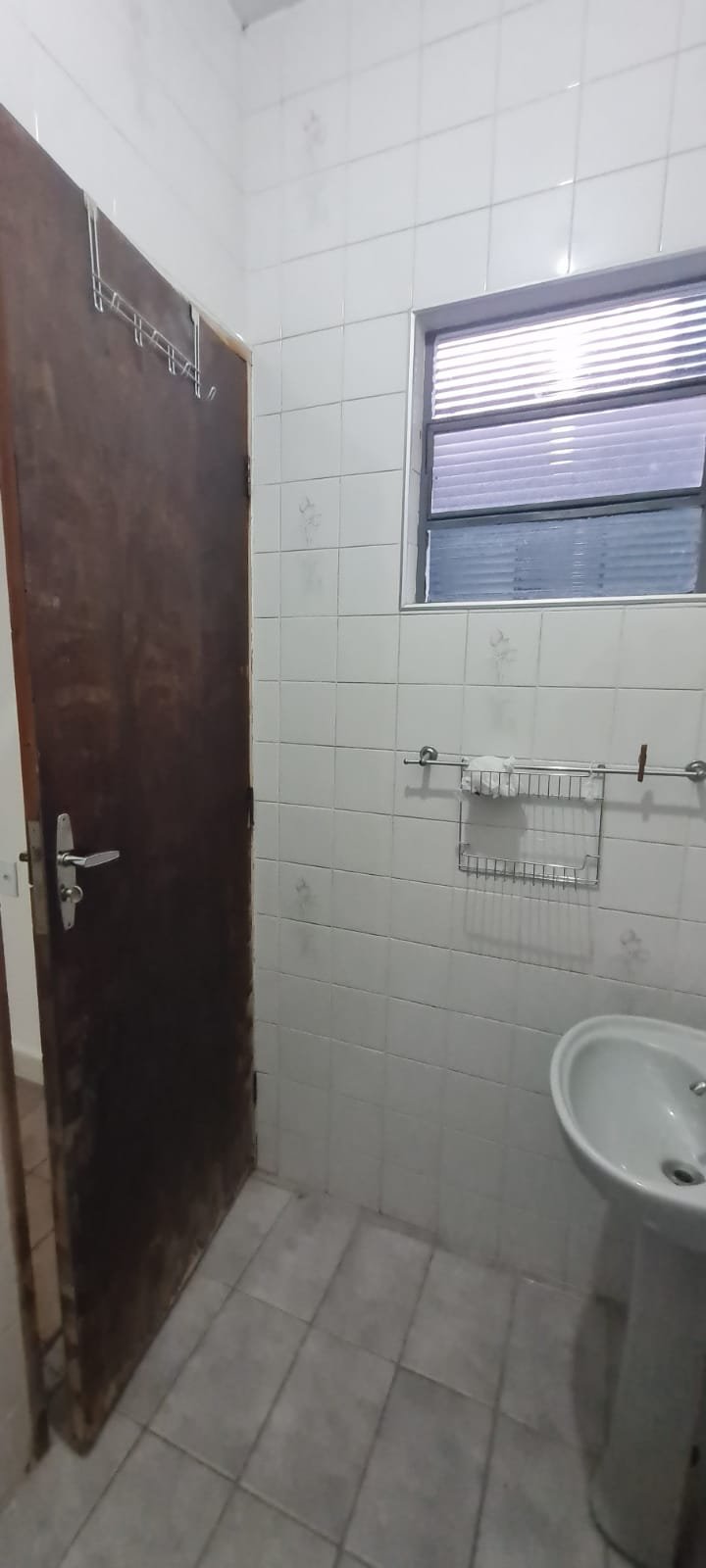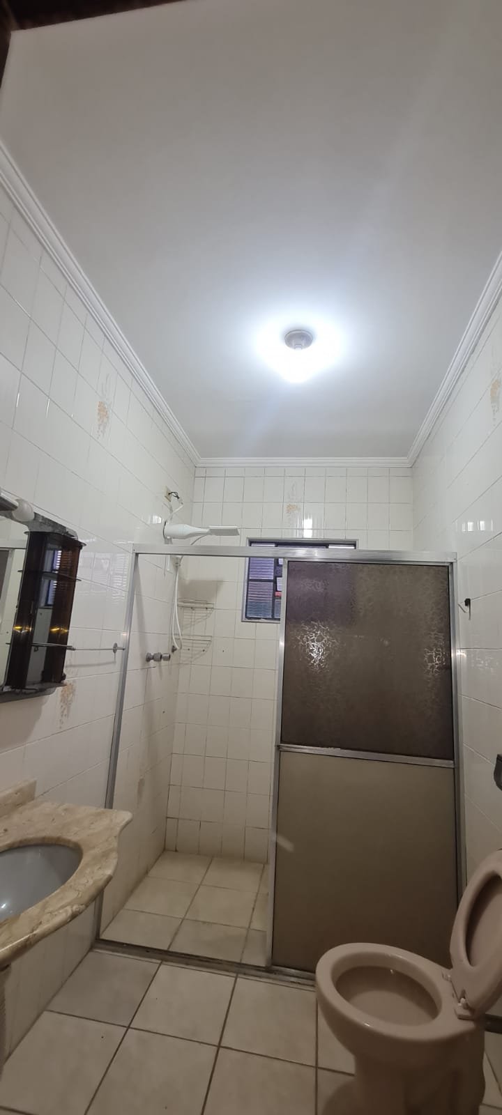 WC Suíte:- Porta de madeira marrom com desgaste natural do tempo o restante em ordem, fechadura, maçaneta e chave acoplada em ordem, pia cerâmica sem marca em ordem, torneira sem marca em ordem, azulejo até o teto na cor branco com detalhes desenhos em ordem, suporte de toalha de alumínio para rosto e banho em ordem, suporte de papel higiênico em ordem, piso cerâmico na cor bege em ordem, teto na cor branco em ordem, armário com espelho embutido de alumínio com manchas e desgaste natural demais em ordem, conjunto sanitário da marca ideal standard na cor bege em ordem, descarga da marca hydra em ordem, 01 tomada em ordem, 01 interruptor em ordem, chuveiro da marca Lorenzetti em ordem, vitro com vidro canelado em ordem,