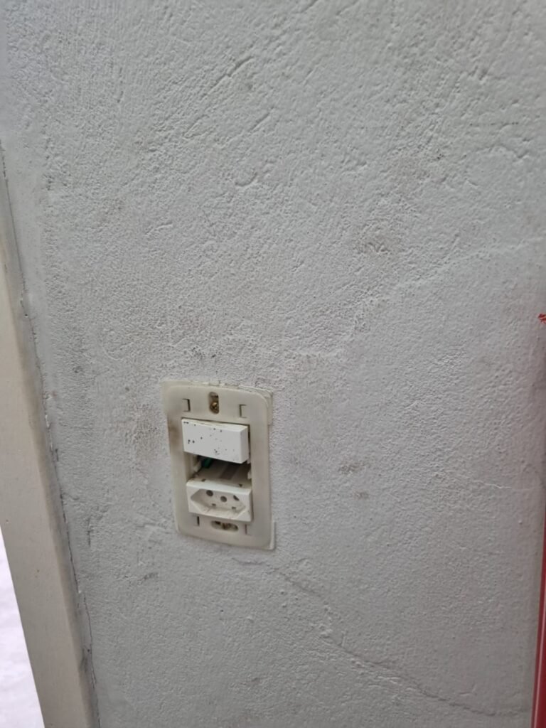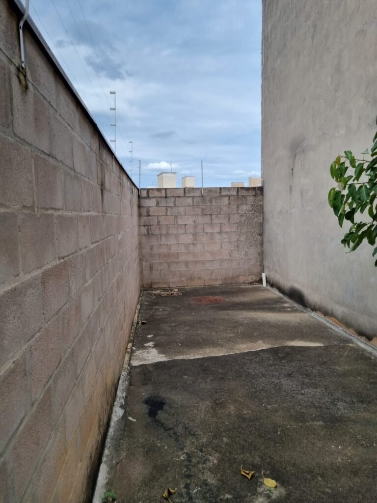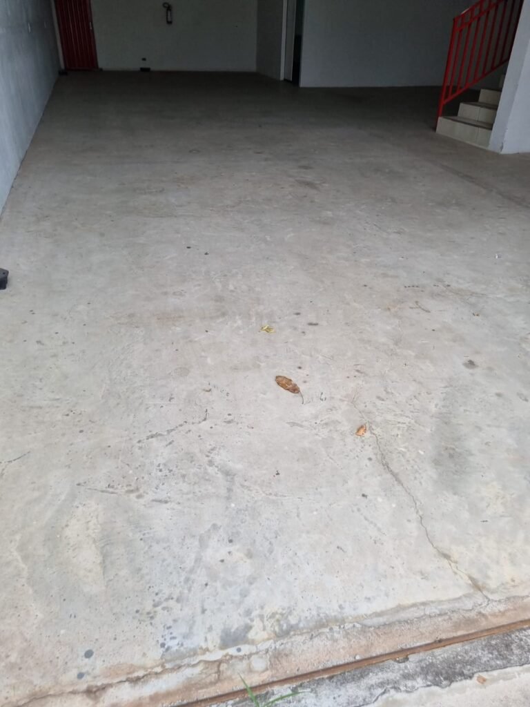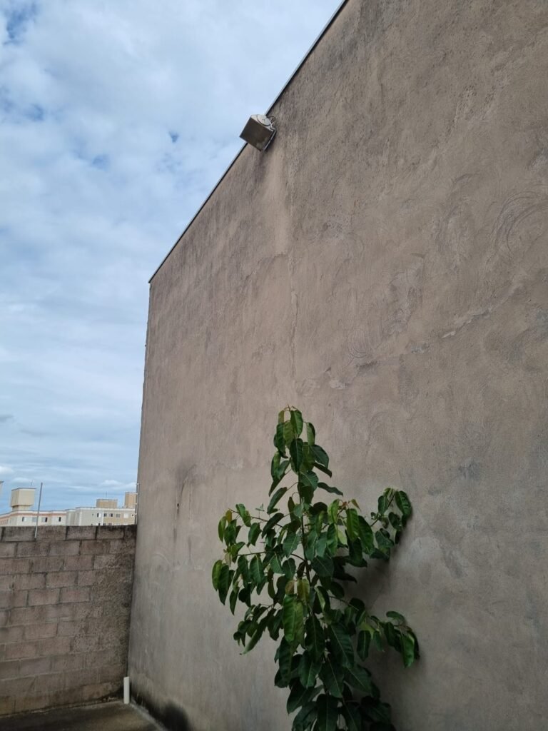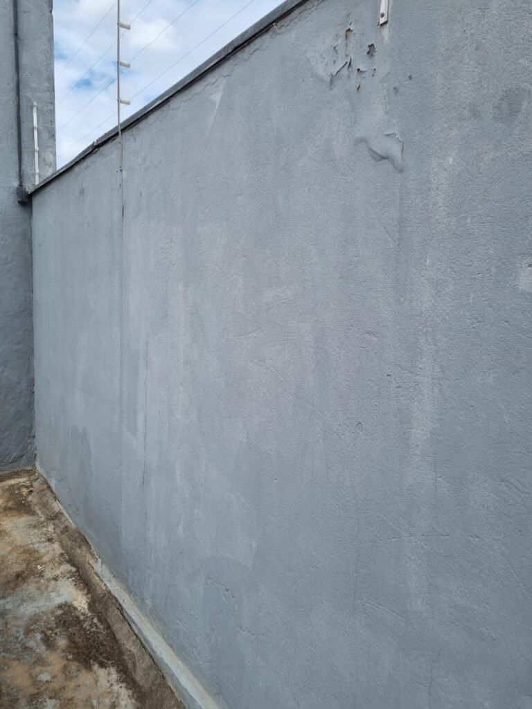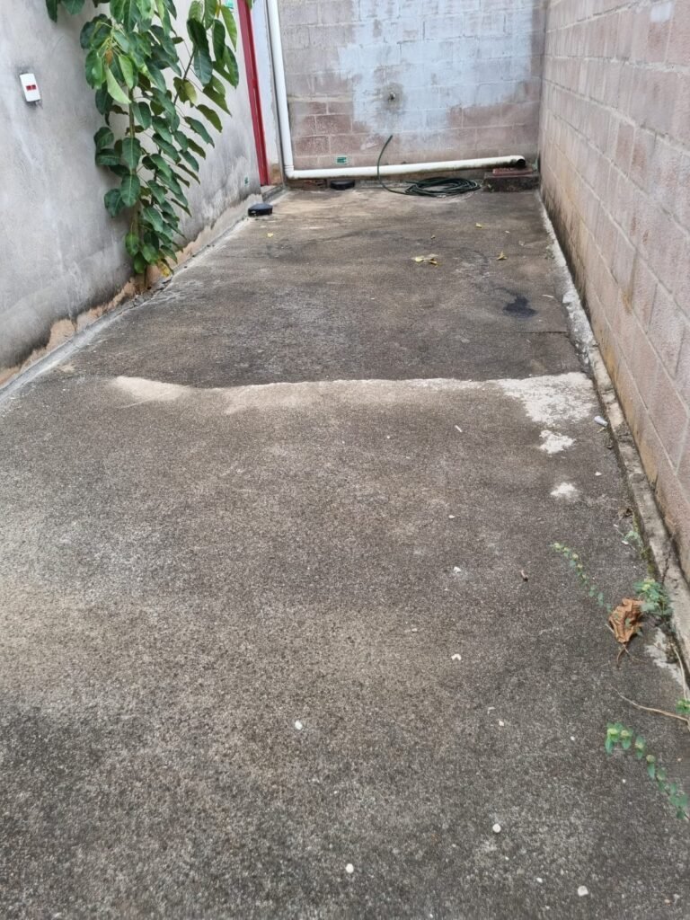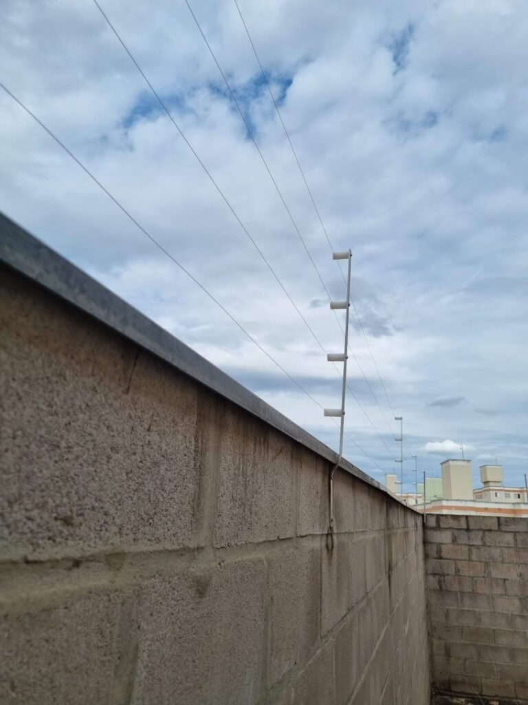 FUNDOS:- piso de concreto com manchas de uso, 02 ralos com tampa, 01 holofote, 02 torneiras de jardim, 02 tomadas, 01 espelho de luz, muro blocos aparentes sem pintura, pingadeira em ordem, paredes galpão com reboco sem pintura, 01 condutor de água cano PVC 100 mm, cerca elétrica em toda extensão dos muros em ordem, 01 câmera de vigilância Intelbras.