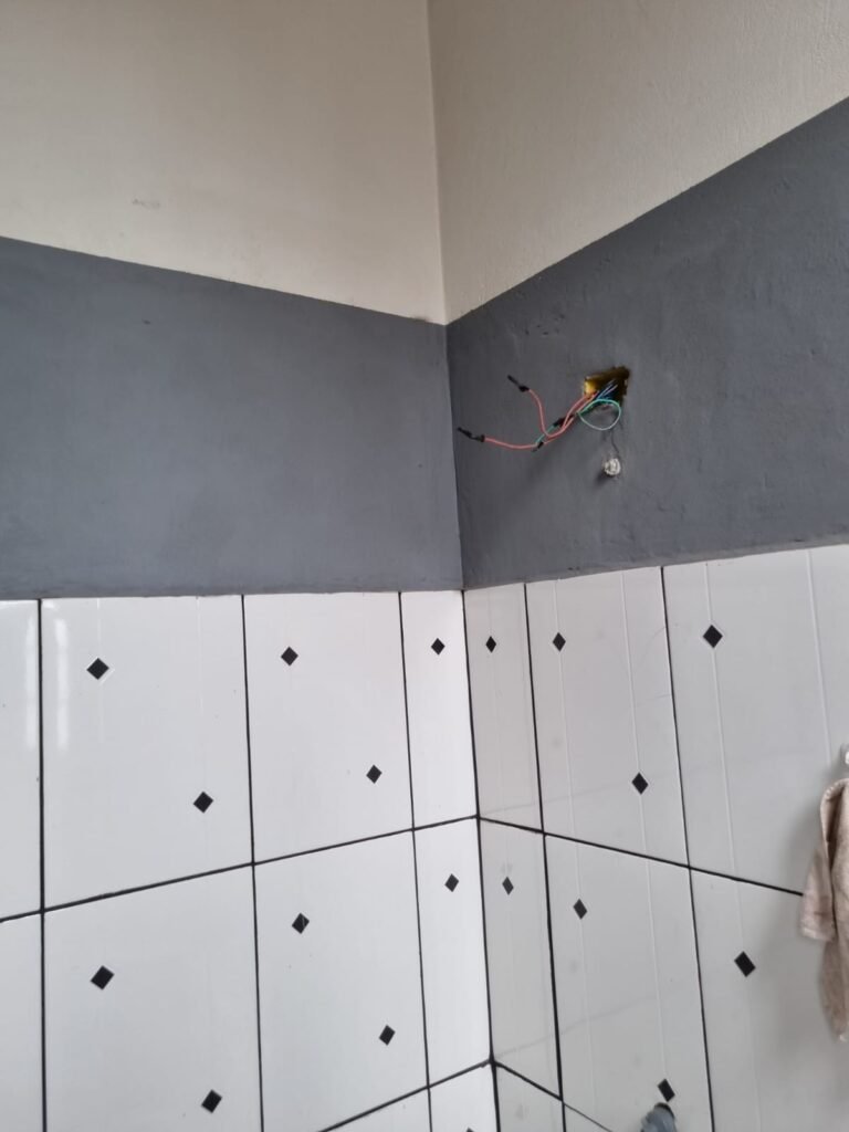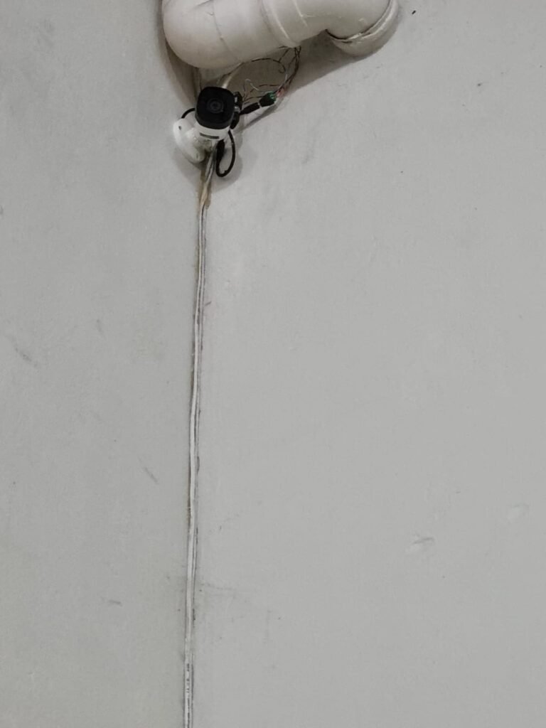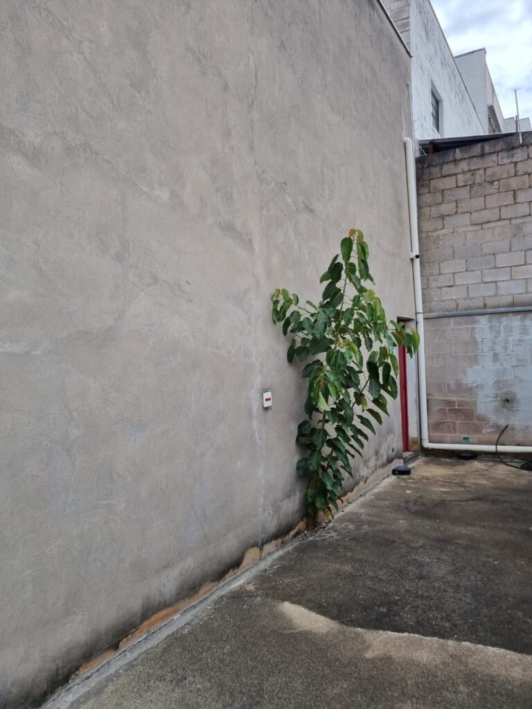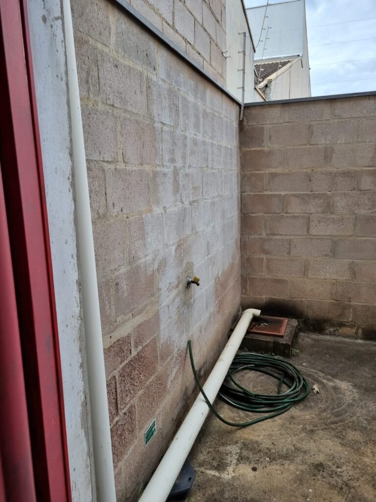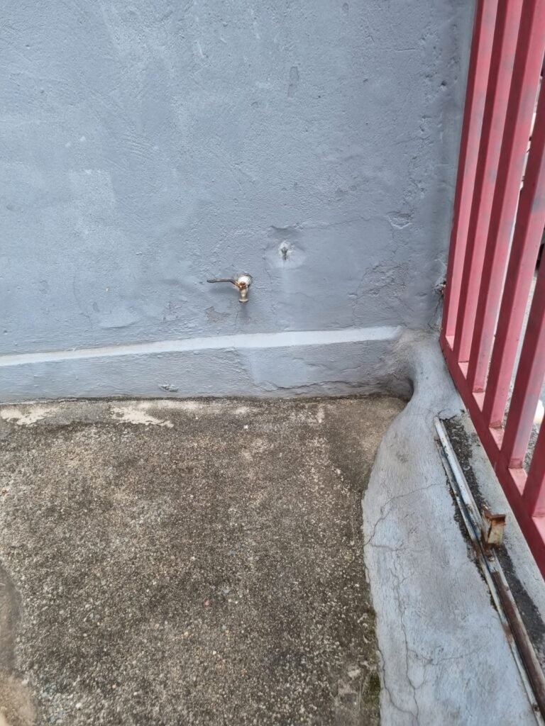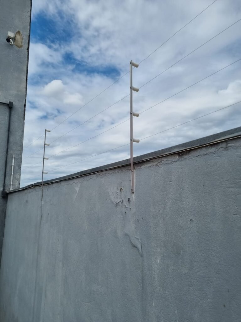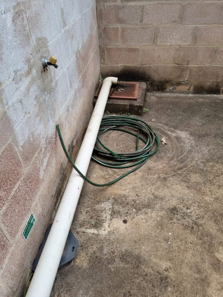 FUNDOS:- piso de concreto com manchas de uso, 02 ralos com tampa, 01 holofote, 02 torneiras de jardim, 02 tomadas, 01 espelho de luz, muro blocos aparentes sem pintura, pingadeira em ordem, paredes galpão com reboco sem pintura, 01 condutor de água cano PVC 100 mm, cerca elétrica em toda extensão dos muros em ordem, 01 câmera de vigilância Intelbras.