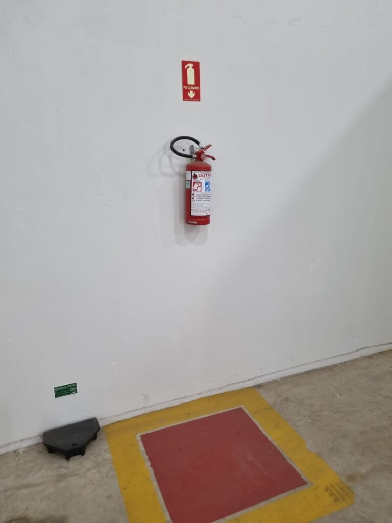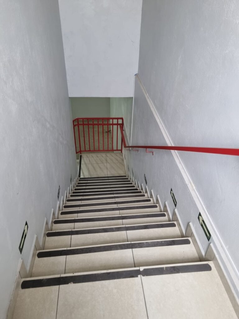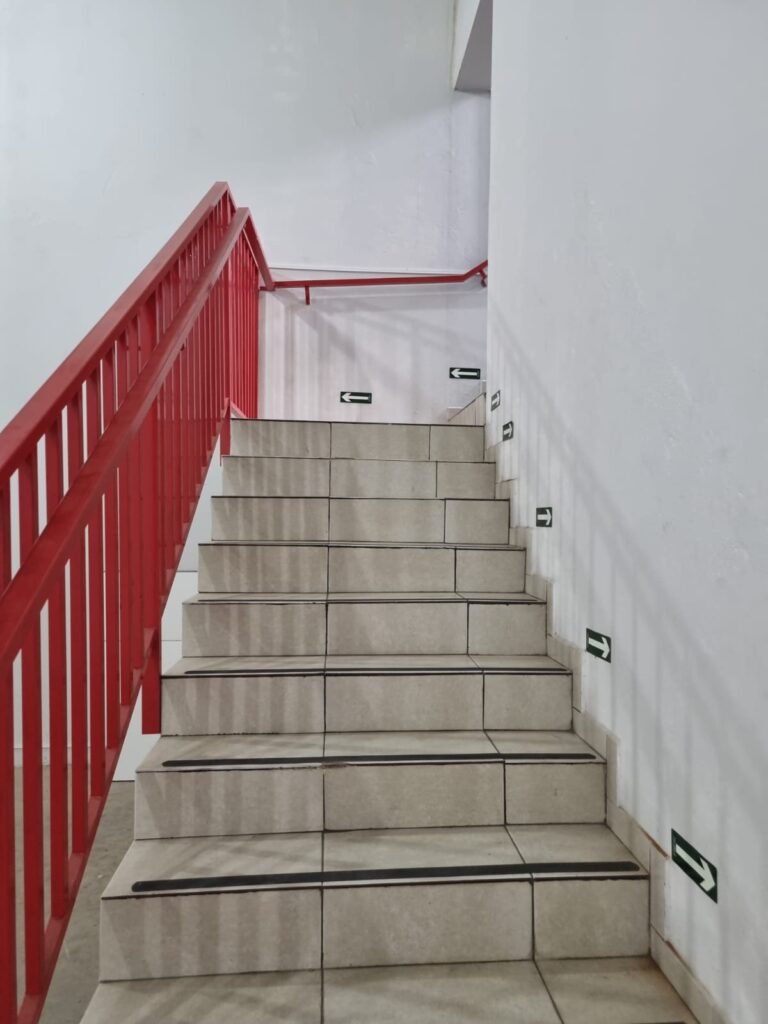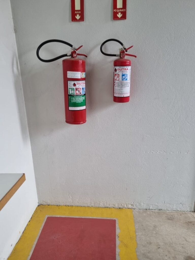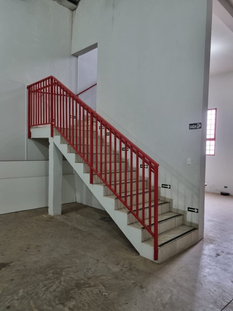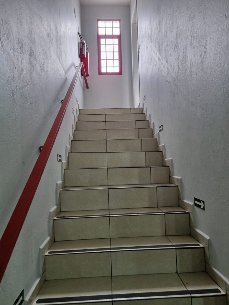 ESCADA :- Escada de alvenaria com degraus revestidos de piso frio cerâmico com fitas ante derrapante em ordem, corrimão e guarda corpo ferro tubular com pintura na cor vermelho em ordem, 02 extintores sendo 01 pó químico 4 kg 20 b:c e 01 água 10 litros 2-A em ordem, 01 interruptor em ordem, 01 espelho de luz em ordem, 01 vitrô basculante com pintura na cor vermelho em ordem, trava em ordem, 07 vidros em ordem.