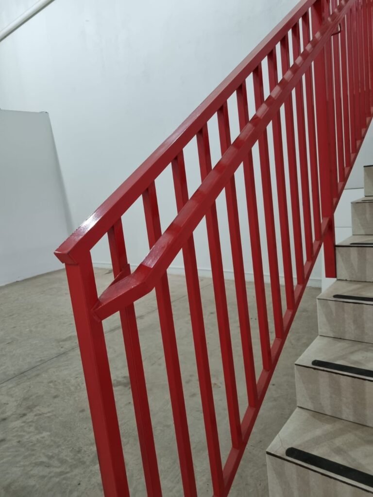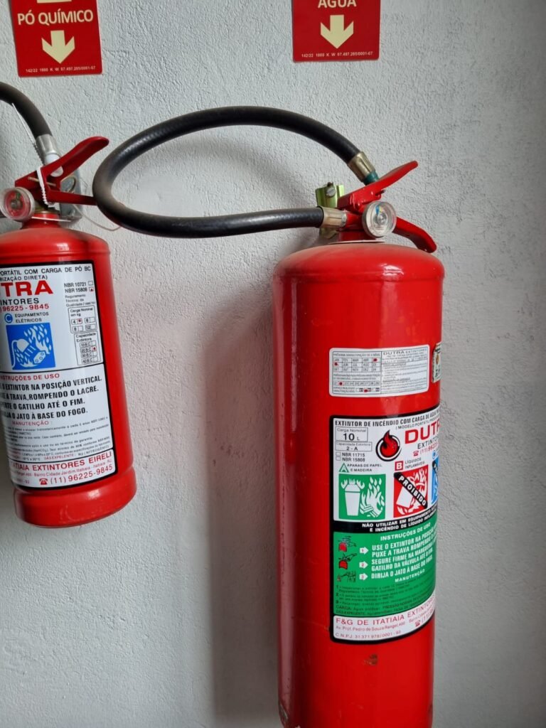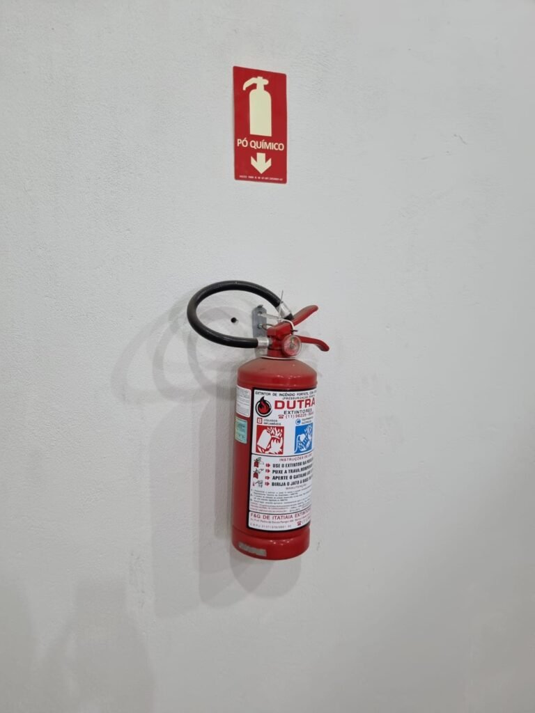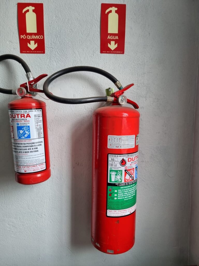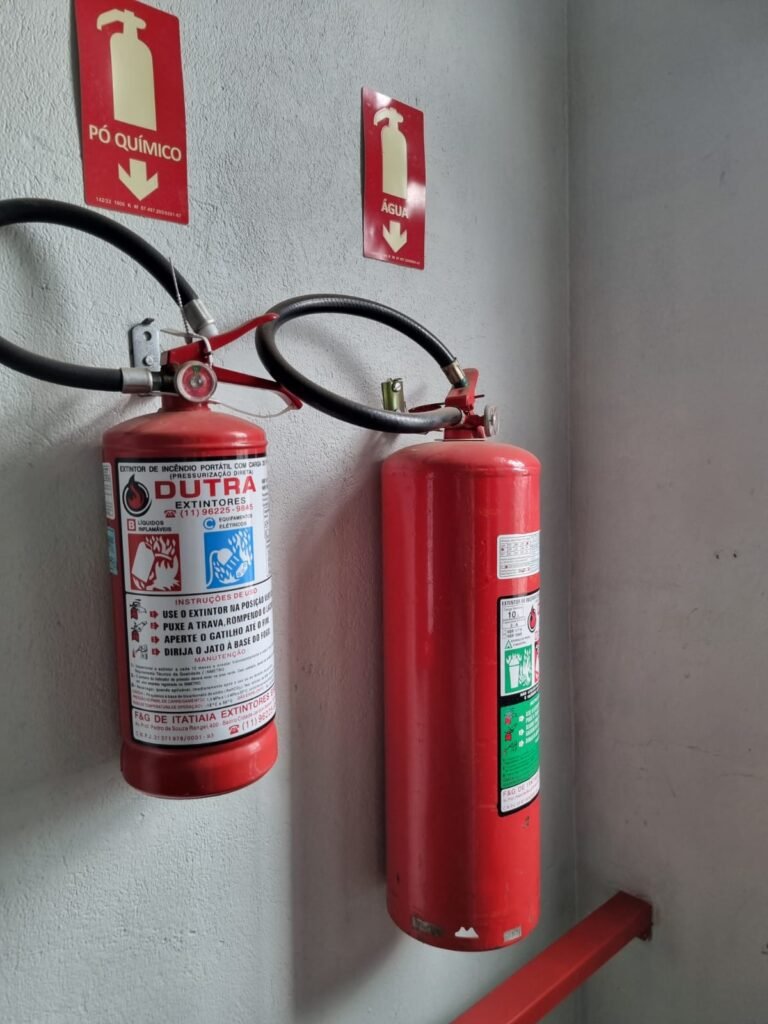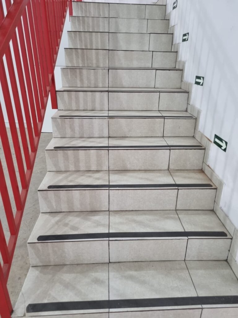 ESCADA :- Escada de alvenaria com degraus revestidos de piso frio cerâmico com fitas ante derrapante em ordem, corrimão e guarda corpo ferro tubular com pintura na cor vermelho em ordem, 02 extintores sendo 01 pó químico 4 kg 20 b:c e 01 água 10 litros 2-A em ordem, 01 interruptor em ordem, 01 espelho de luz em ordem, 01 vitrô basculante com pintura na cor vermelho em ordem, trava em ordem, 07 vidros em ordem.