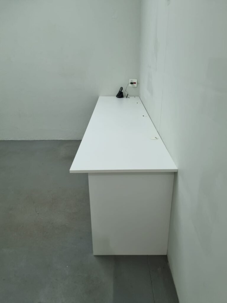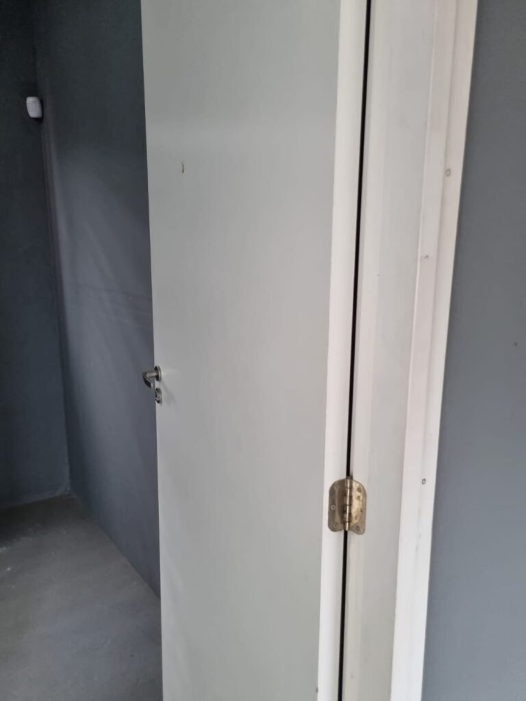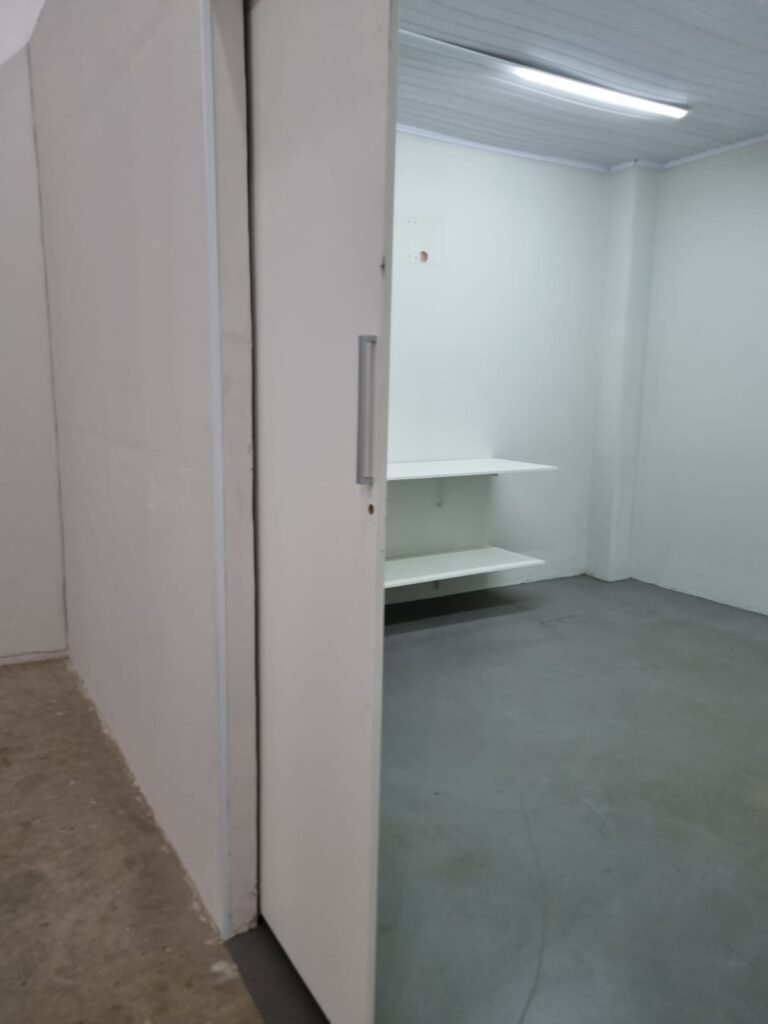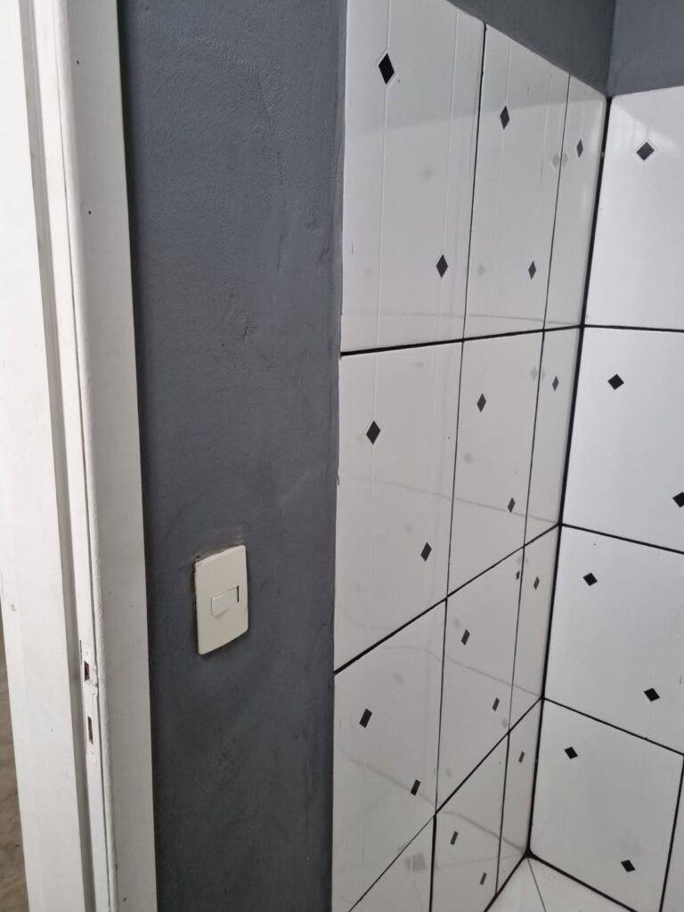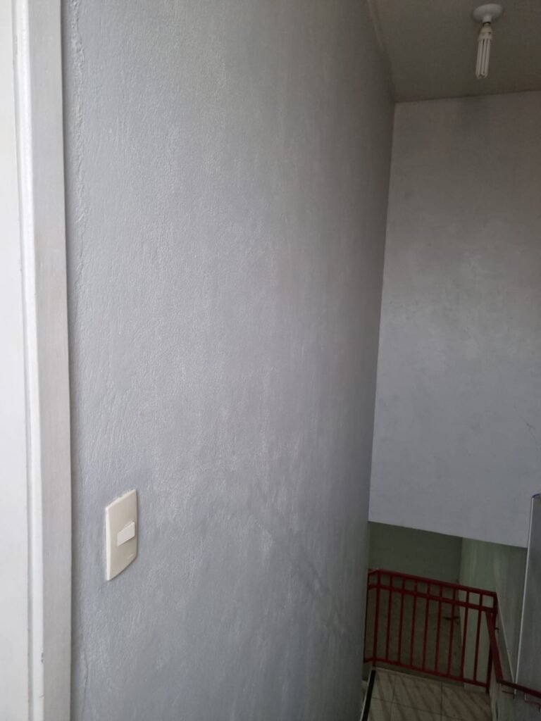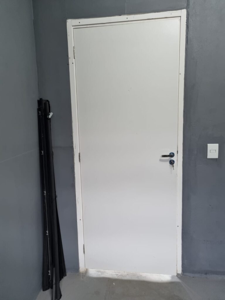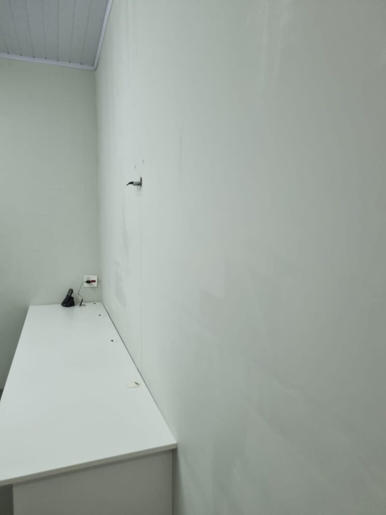 CÔMODO DRYWALL:- Piso concreto usinado com pintura na cor cinza em ordem, paredes com pintura na cor branco gelo em ordem, 03 bancadas em mdf, parede 01 buraco circular para ar condicionado e 06 buracos com bucha, 01 aparelho interfone Intelbras, 02 luminárias led tubular em ordem, porta em mdf em ordem, 01 puxador de correr.