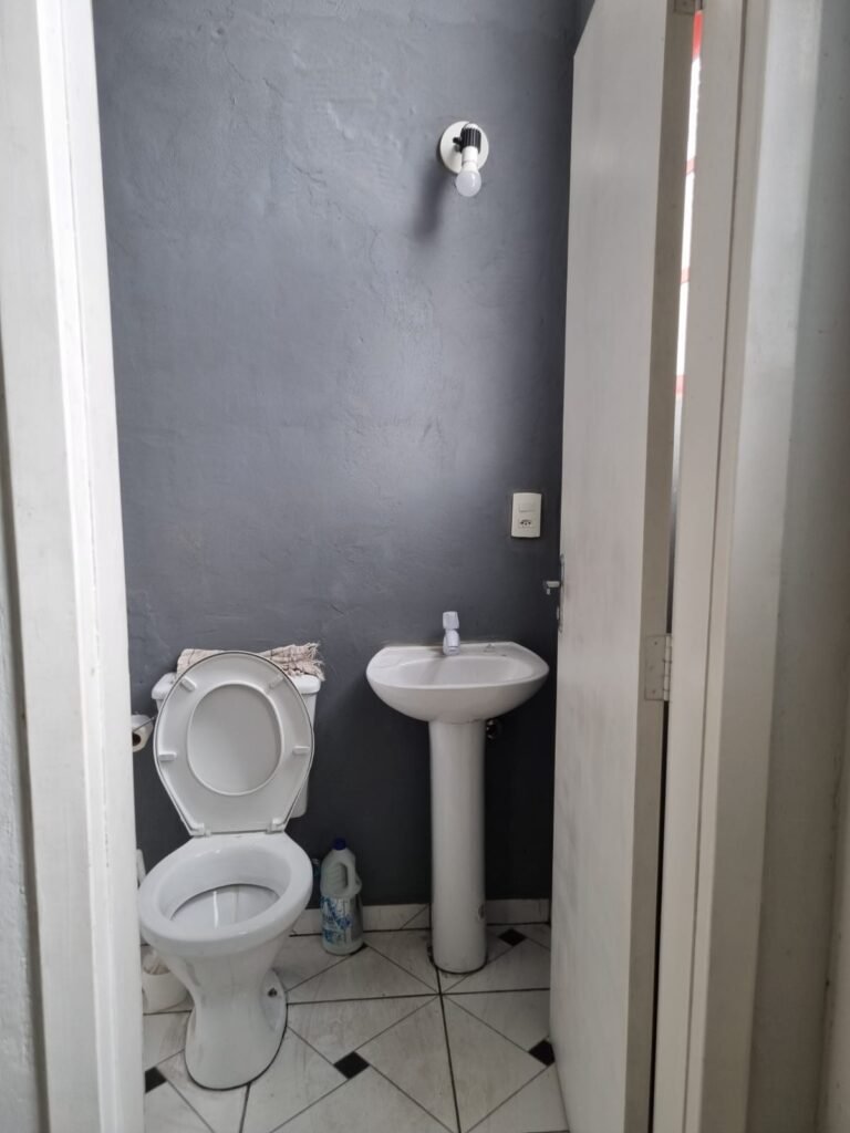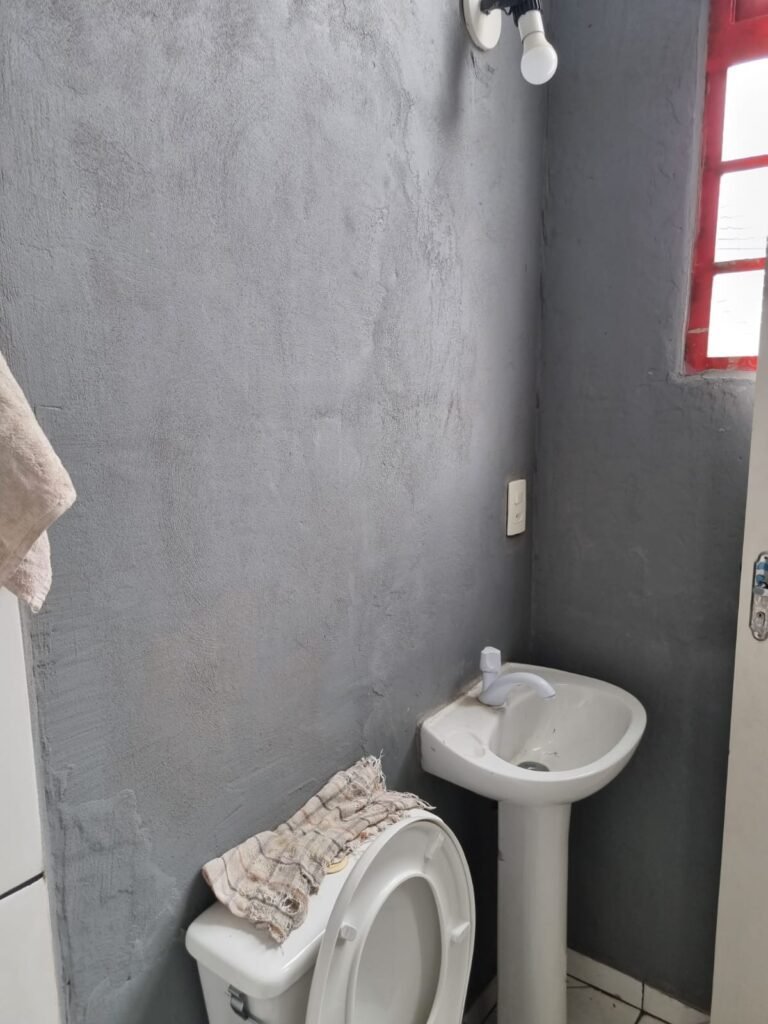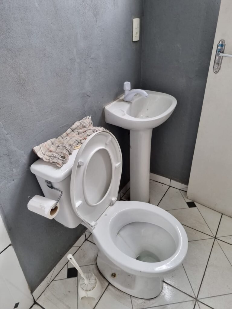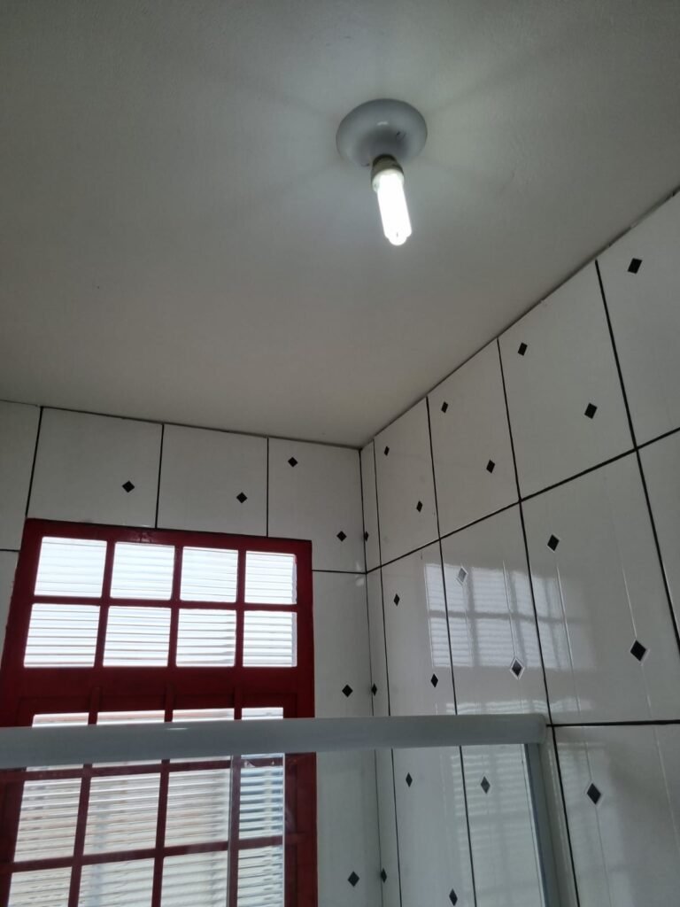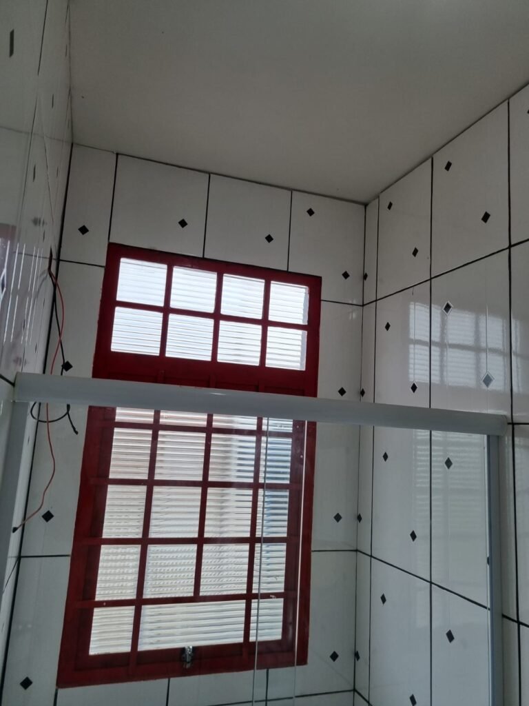 W.C. 1:- Piso frio cerâmico em ordem, azulejo até somente na área do chuveiro a até a altura do chuveiro restante paredes com reboco e com barrado até a altura do chuveiro com pintura nova na cor cinza e restante com pintura na cor branco em ordem, 01 soquete em ordem, 01 lâmpada fluorescente em ordem, 02 interruptores em ordem, 01 tomada em ordem, 02 espelhos de luz em ordem, 01 spot na cor branco sem lâmpada, 01 ralo com tampa inox e desentupido em ordem, porta de madeira com pintura na cor branco em ordem, guarnição da porta parte superior sem pintura restante com pintura na cor branco em ordem, 02 maçanetas em ordem fechadura sem chave, 01 vitrô basculante com pintura na cor vermelho em ordem, 10 vidros em ordem, sem chuveiro, registro faltando canopla restante em ordem, conjunto lavatório e coluna cerâmica na cor branco em ordem, torneira em ordem, conjunto vaso sanitário e caixa acoplada de descarga cerâmica na cor branca em ordem.