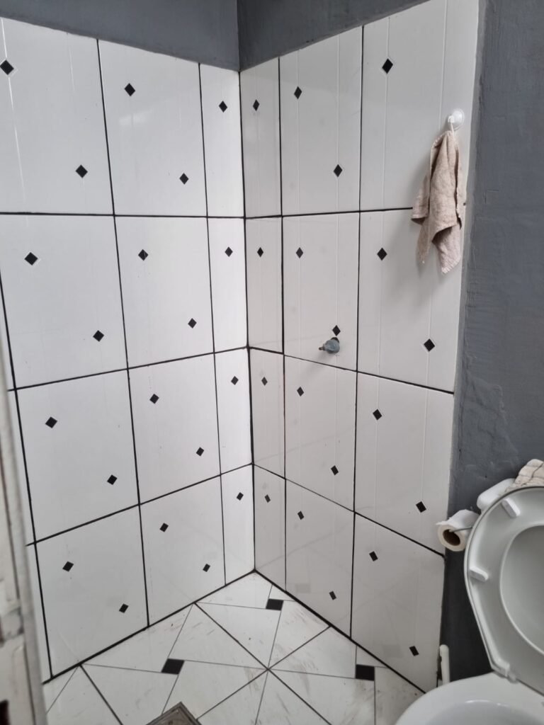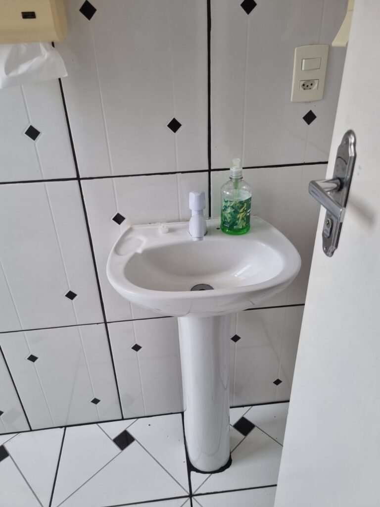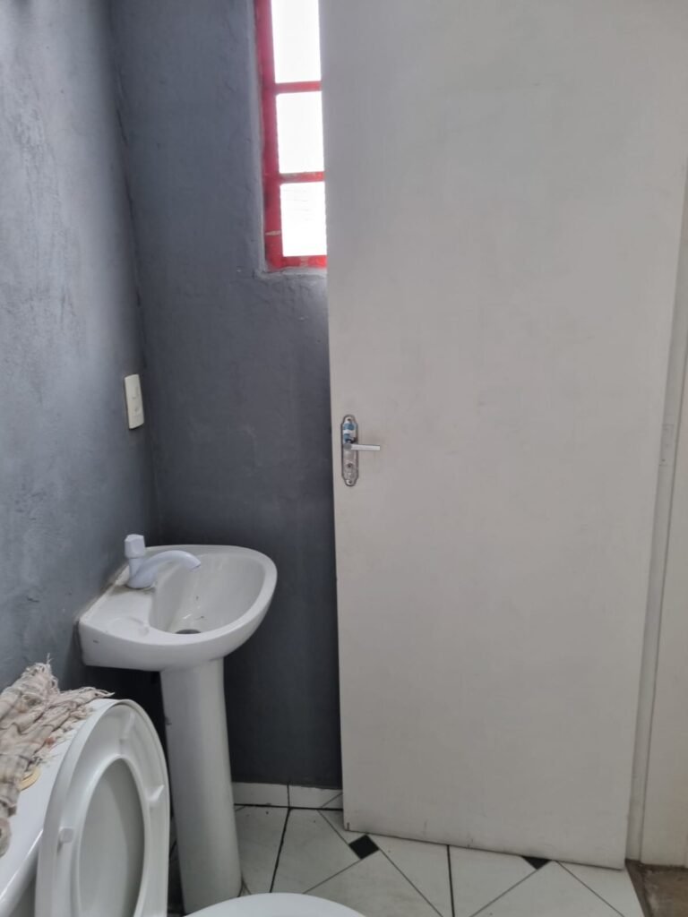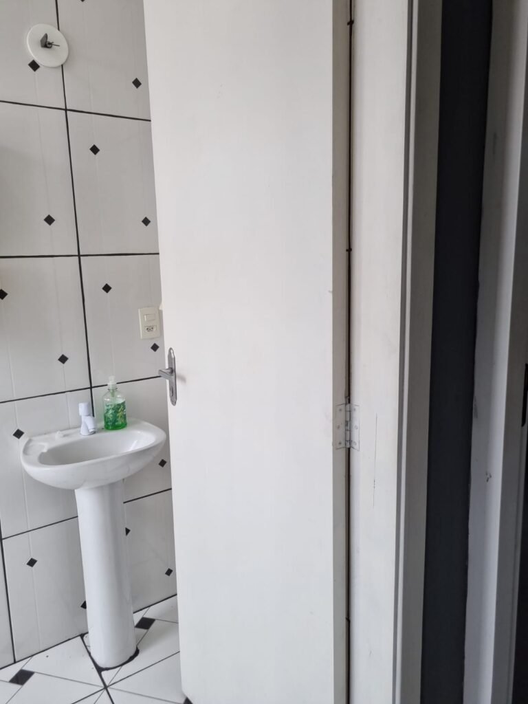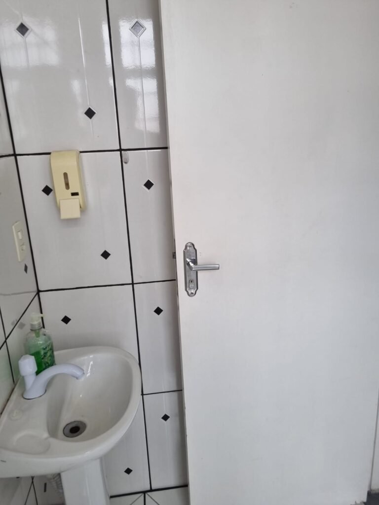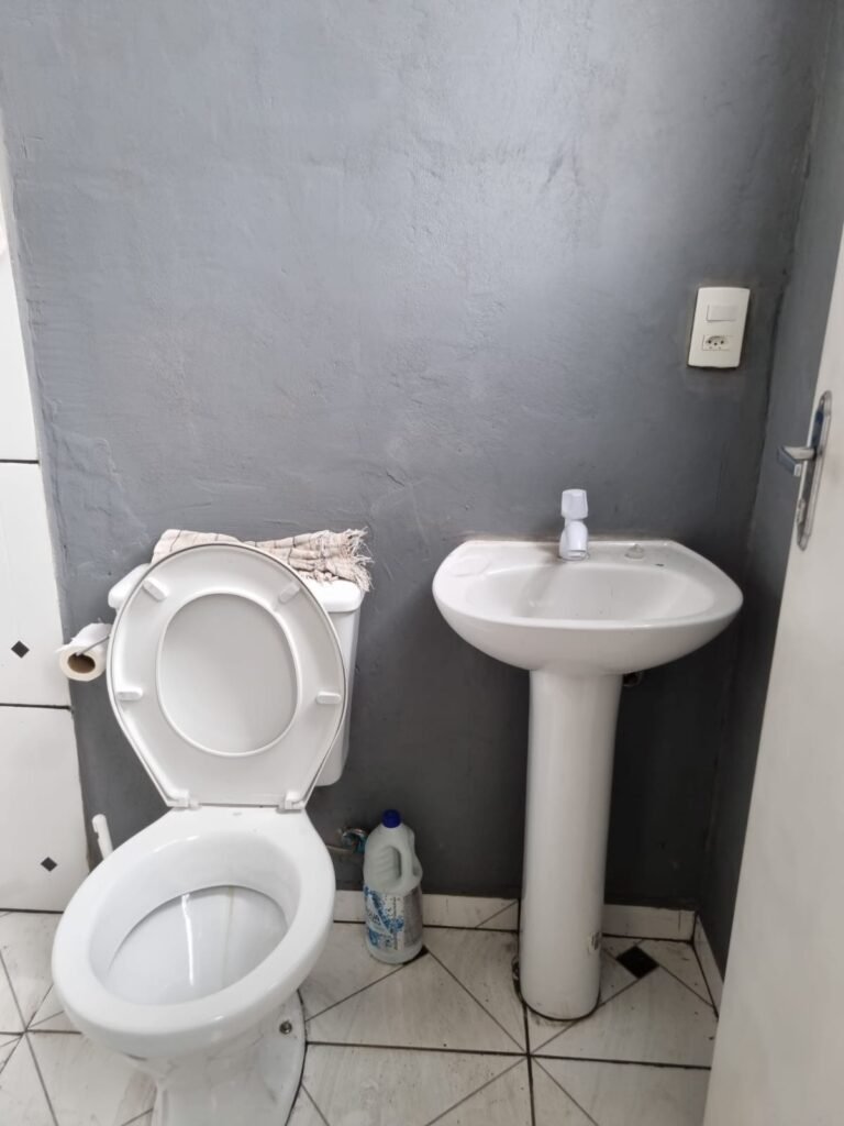 W.C. 1:- Piso frio cerâmico em ordem, azulejo até somente na área do chuveiro a até a altura do chuveiro restante paredes com reboco e com barrado até a altura do chuveiro com pintura nova na cor cinza e restante com pintura na cor branco em ordem, 01 soquete em ordem, 01 lâmpada fluorescente em ordem, 02 interruptores em ordem, 01 tomada em ordem, 02 espelhos de luz em ordem, 01 spot na cor branco sem lâmpada, 01 ralo com tampa inox e desentupido em ordem, porta de madeira com pintura na cor branco em ordem, guarnição da porta parte superior sem pintura restante com pintura na cor branco em ordem, 02 maçanetas em ordem fechadura sem chave, 01 vitrô basculante com pintura na cor vermelho em ordem, 10 vidros em ordem, sem chuveiro, registro faltando canopla restante em ordem, conjunto lavatório e coluna cerâmica na cor branco em ordem, torneira em ordem, conjunto vaso sanitário e caixa acoplada de descarga cerâmica na cor branca em ordem.