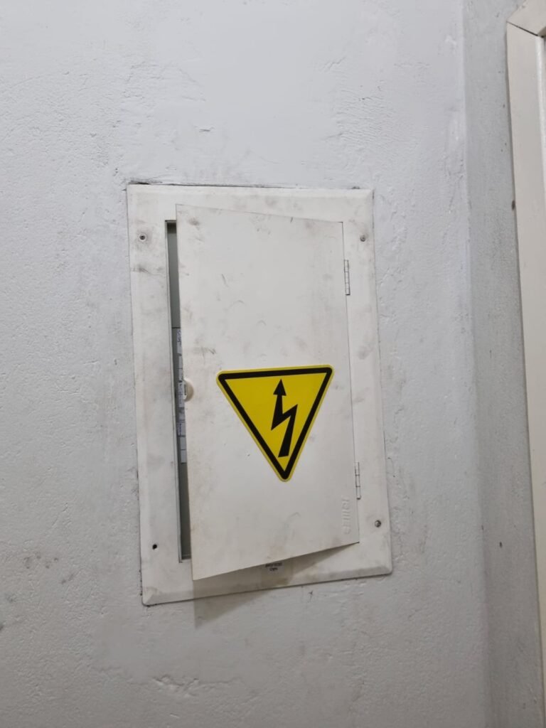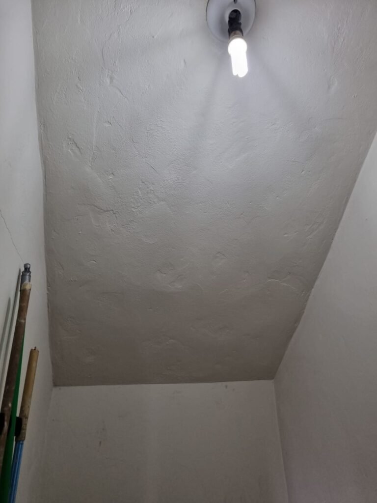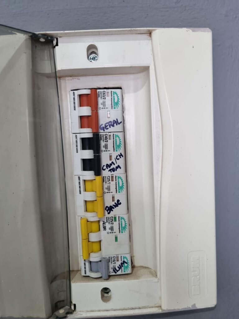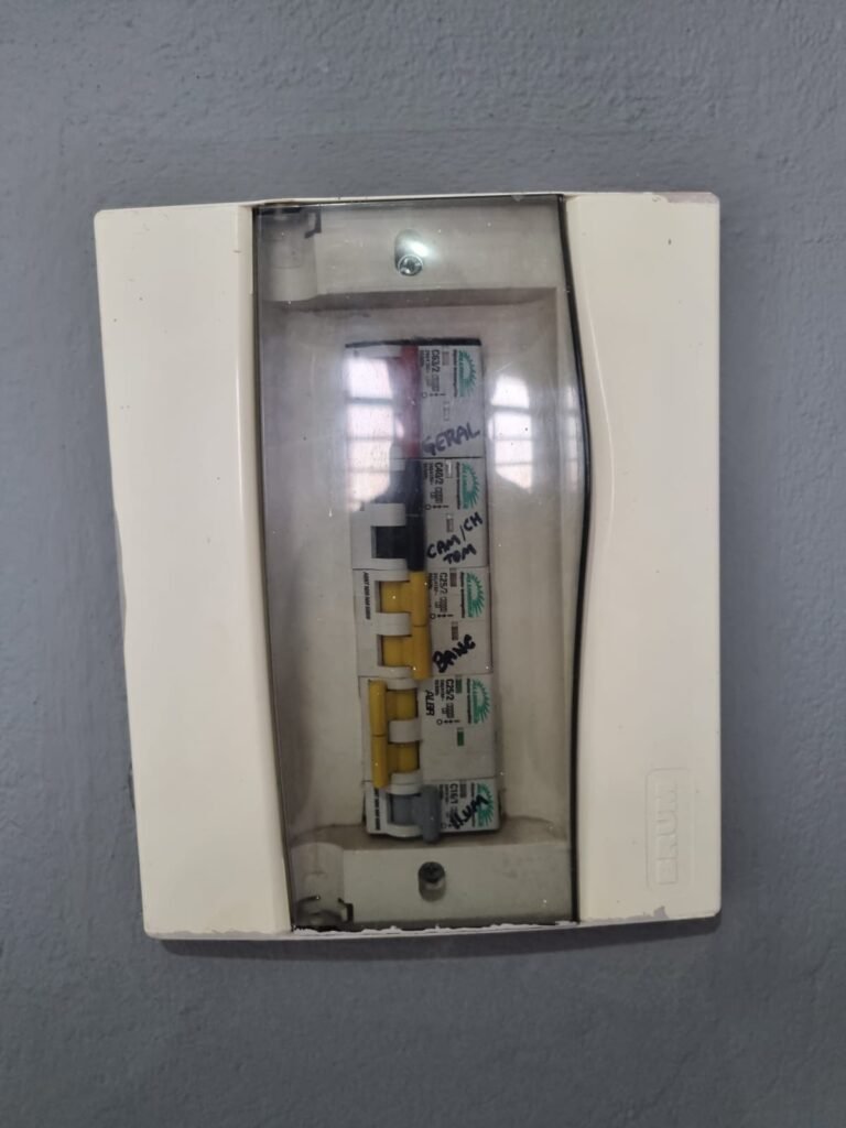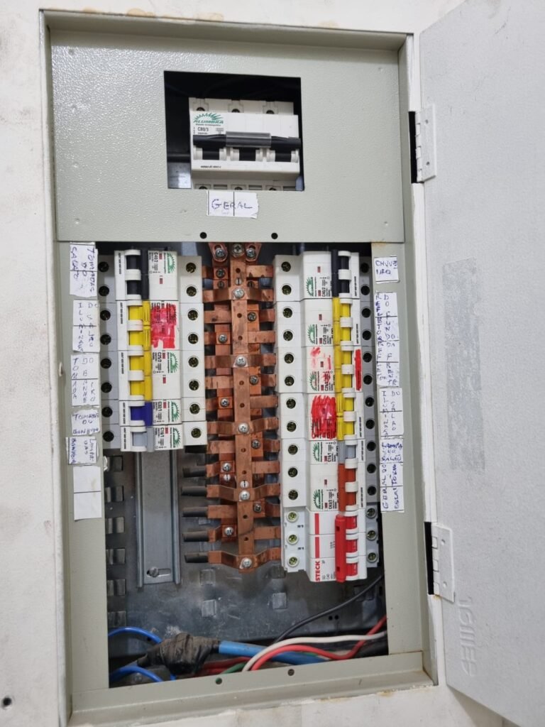 CÔMODO SOB ESCADA:- Piso concreto usinado polido com manchas de tinta restante em ordem, paredes e teto na cor branco com manchas restante em ordem, 02 soquete com lâmpada fluorescente em ordem, 01 interruptor em ordem, 01 tomada sem espelho de luz, porta de madeira com pintura na cor branco em ordem, 02 maçanetas em ordem, fechadura Yale faltando chave, 01 suporte para vassoura em ordem, quadro de disjuntores com tampa fora do lugar com 13 disjuntores sendo 01 C80/ 3 240/415w marca alumbra, 01 C40/2 marca alumbra, 01 SD C40 400 w marca steck, 05 C52/2 240/415 w marca alumbra, 01 C16/1 marca alumbra, 02 C32/1 marca alumbra 01 C40/2 marca alumbra.