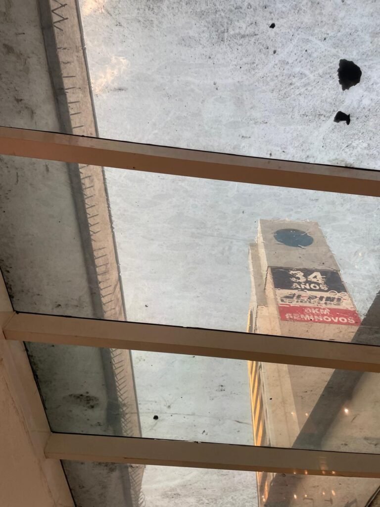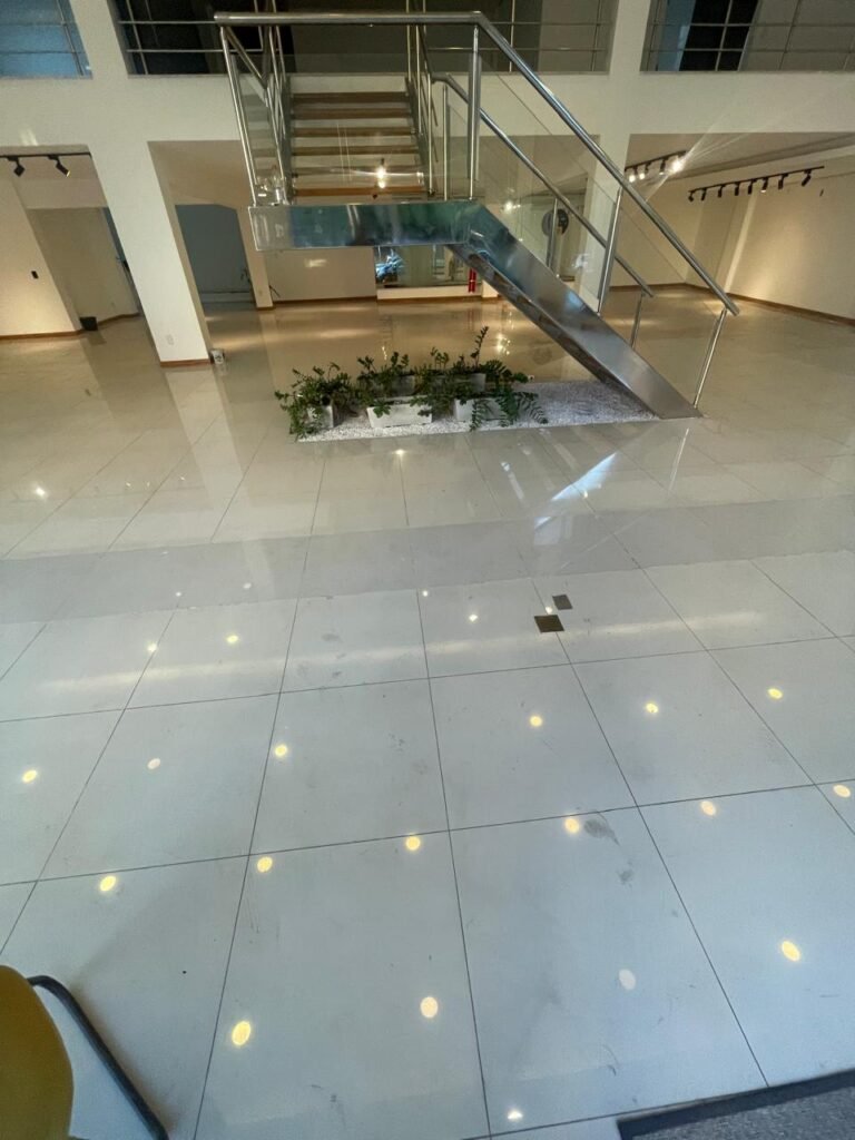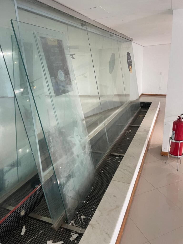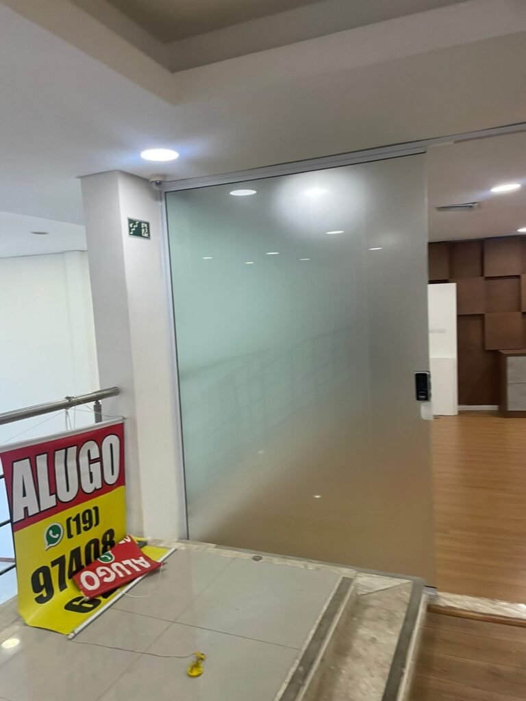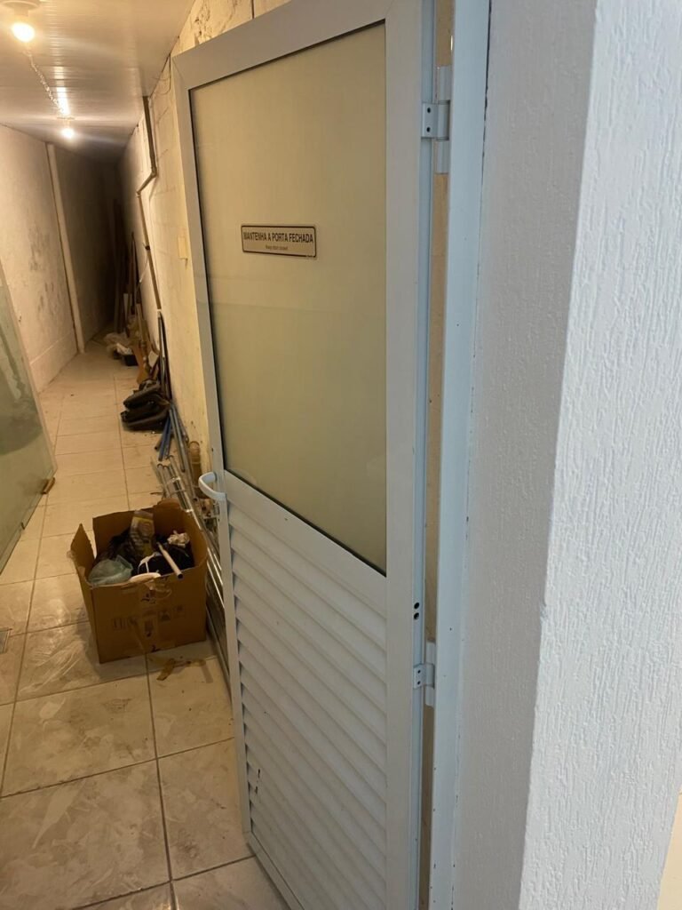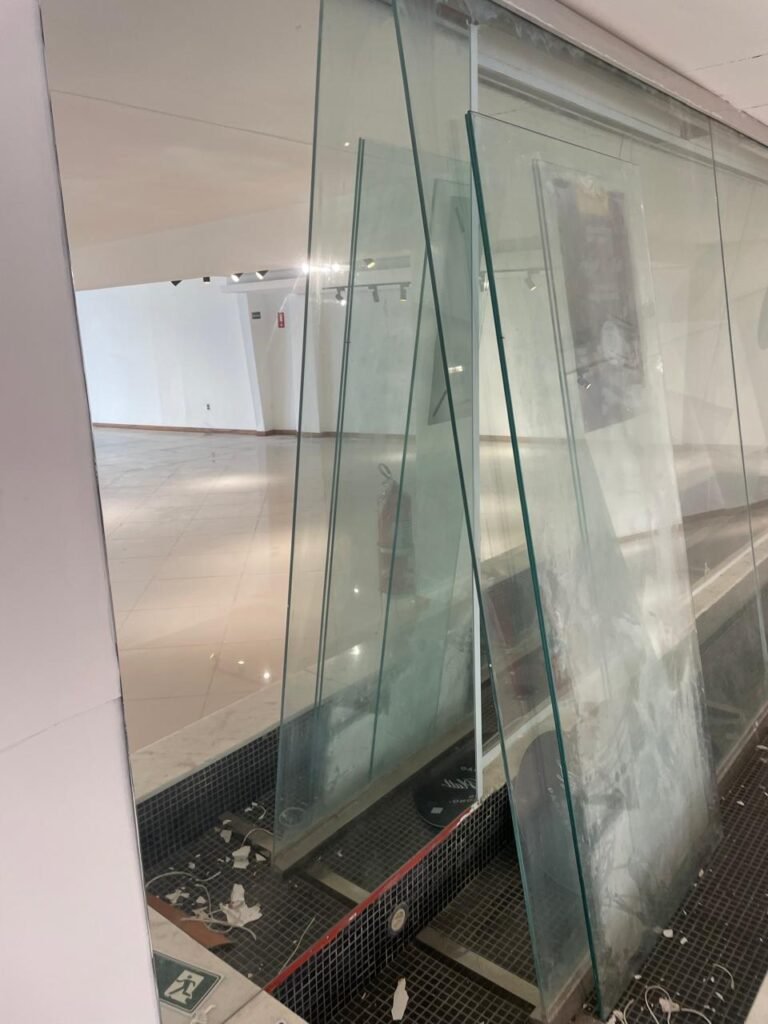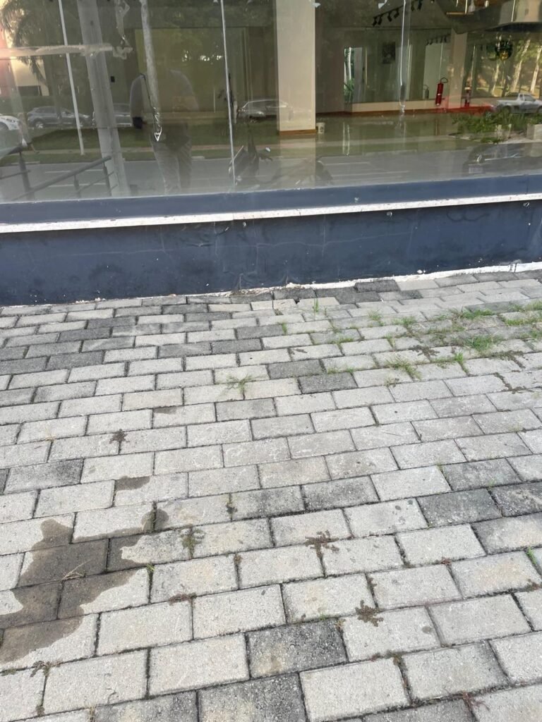 INTERIOR LOJA-: Portas de vidros deslizantes com 04 folhas de vidro Blindex com restos de adesivos, 01 fechadura marca Arouca com 01 cadeado marca Pado Lt-45 em ordem, piso revestido de porcelanato com desgastes naturais, partes com remendos, partes trincadas e restante em ordem, rodapés revestidos de madeira com desgastes naturais, manchas de tinta e restante em ordem, paredes com pintura na cor branco neve, com partes descascando, desgastes naturais e restante em ordem, 02 vitrôs fixos sendo 01 deles com 03 folhas de vidros blindex, a outra com 02 folhas, ambas com restante de adesivos e marcas de desgastes naturais, 02 cercados em granito com pedras brancas com desgastes naturais e restante em ordem, 10 tomadas, 08 espelhos cegos, 04 interruptores (sendo que 01 deles está danificado), 01 quadro de interruptores marca Brum com 04 interruptores em ordem, 01 quadro de disjuntores marca Sica e Margirus em ordem com tampa de proteção e com pintura na cor branco, 04 luminárias cor preta sendo que em 03 delas tem 08 spots em cada e em 01 deles tem 03 spots e todas as lâmpadas estão em ordem, 04 luminárias cor branco com 02 spots em ordem em cada 01 delas menos em 01 (que tem apenas 01 spot), 03 ar condicionados marca Springer não testados (cláusula explicando), 31 luminárias com LED embutido sendo que 25 estão com lâmpadas em ordem restante está danificada, 01 câmera não testada, 01 luminária de emergência não testada, cercado com pedras na cor branco e com 05 vasos de concreto com plantas em ordem, 04 extintores de incêndio, 02 de água e 02 de pó químico ambos com manutenção em outubro de 2023, 01 cascata de água desativada de alvenaria revestido em granito e pastilhas, 01 parede com 03 vidros temperados com desgastes naturais, teto com forro de gesso com iluminação embutida em ordem pintura na cor branco neve e partes com manchas de infiltração, 01 buraco, 01 lustre dourado em ordem, 01 escada com acabamentos, corrimões e guarda corpo em inox em ordem, com 06 folhas de vidro liso Blindex (01 delas está faltando).