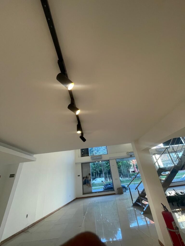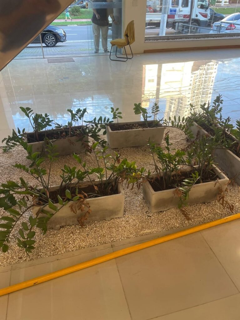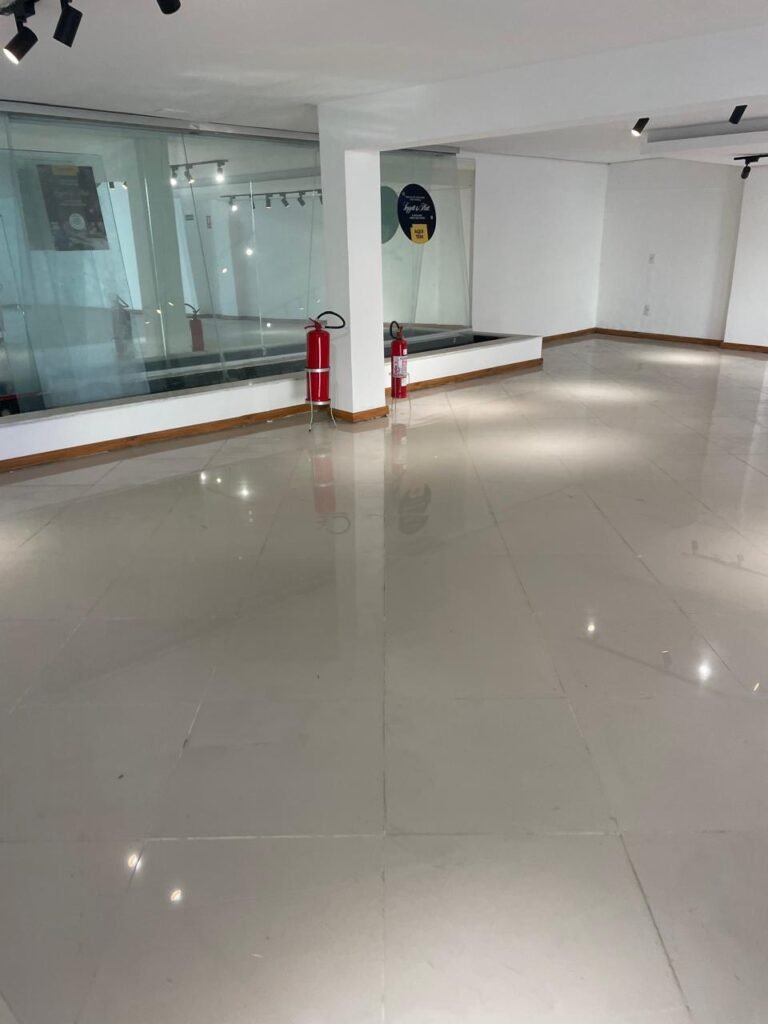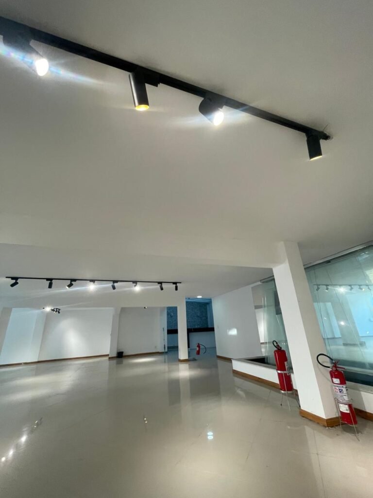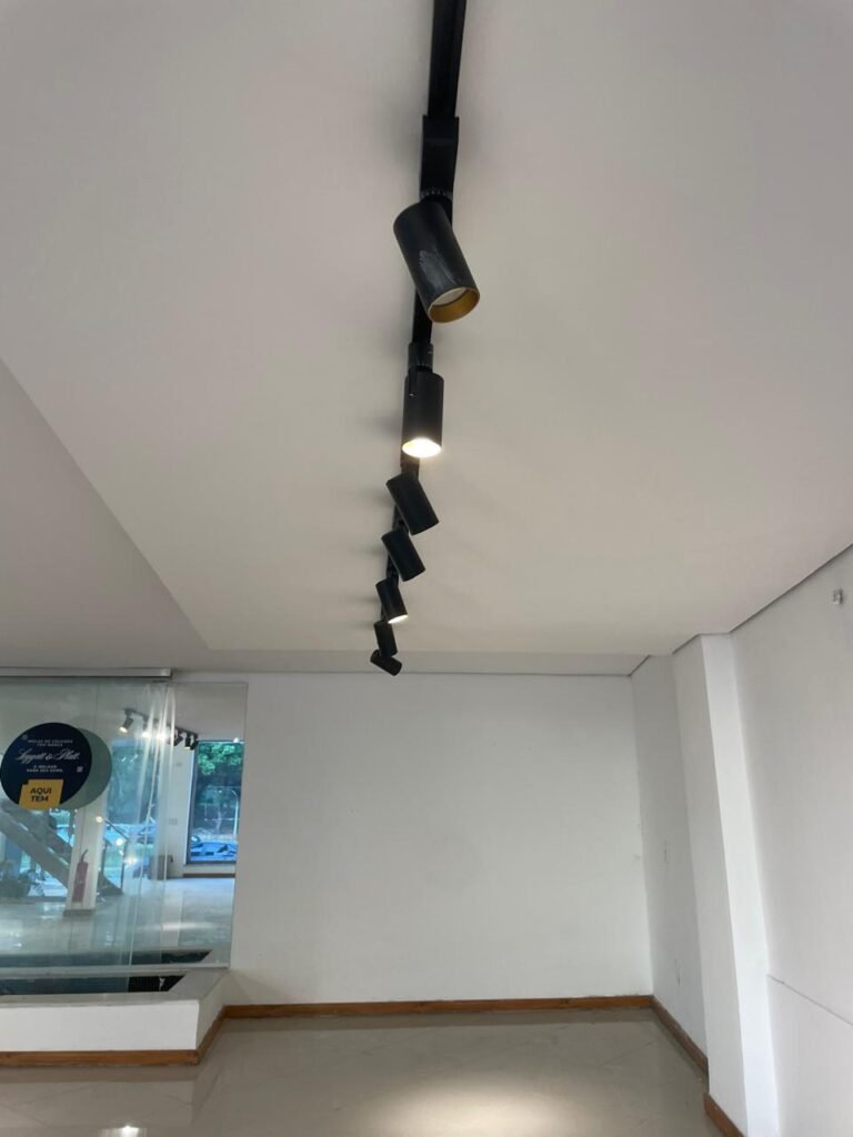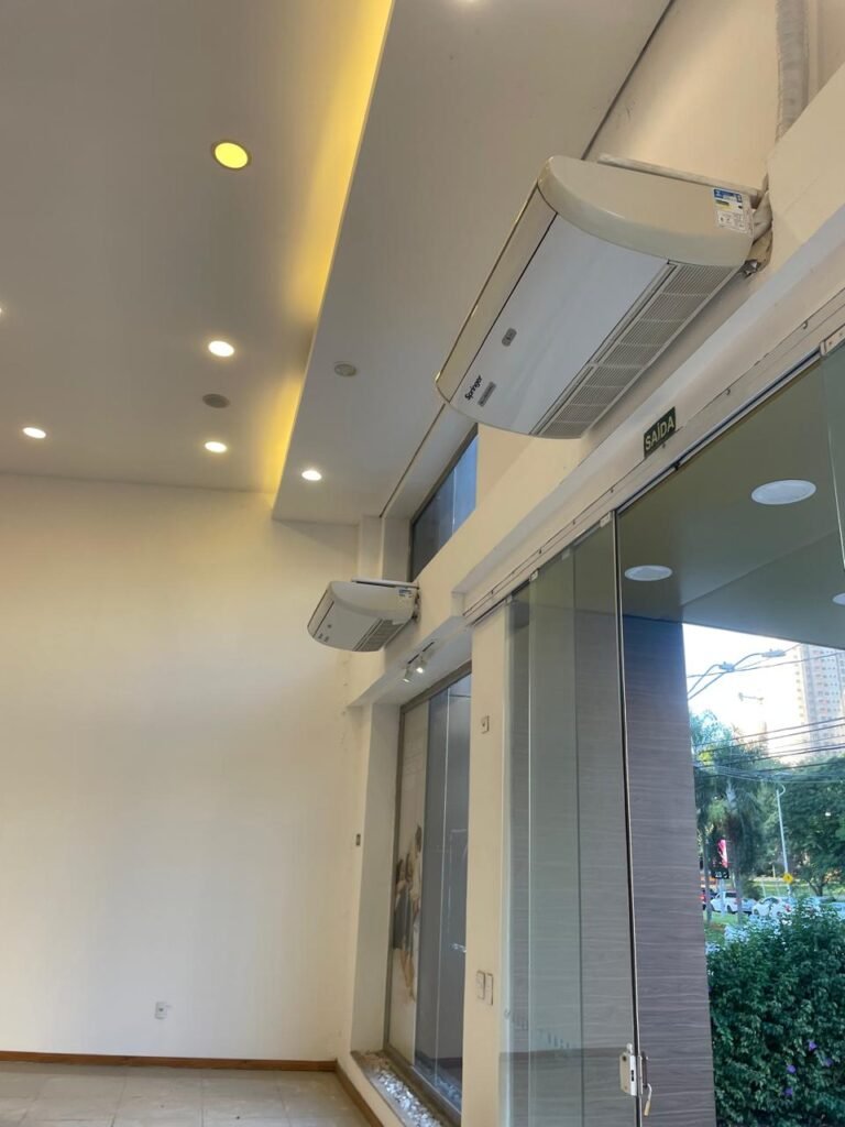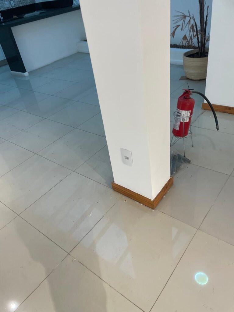 INTERIOR LOJA-: Portas de vidros deslizantes com 04 folhas de vidro Blindex com restos de adesivos, 01 fechadura marca Arouca com 01 cadeado marca Pado Lt-45 em ordem, piso revestido de porcelanato com desgastes naturais, partes com remendos, partes trincadas e restante em ordem, rodapés revestidos de madeira com desgastes naturais, manchas de tinta e restante em ordem, paredes com pintura na cor branco neve, com partes descascando, desgastes naturais e restante em ordem, 02 vitrôs fixos sendo 01 deles com 03 folhas de vidros blindex, a outra com 02 folhas, ambas com restante de adesivos e marcas de desgastes naturais, 02 cercados em granito com pedras brancas com desgastes naturais e restante em ordem, 10 tomadas, 08 espelhos cegos, 04 interruptores (sendo que 01 deles está danificado), 01 quadro de interruptores marca Brum com 04 interruptores em ordem, 01 quadro de disjuntores marca Sica e Margirus em ordem com tampa de proteção e com pintura na cor branco, 04 luminárias cor preta sendo que em 03 delas tem 08 spots em cada e em 01 deles tem 03 spots e todas as lâmpadas estão em ordem, 04 luminárias cor branco com 02 spots em ordem em cada 01 delas menos em 01 (que tem apenas 01 spot), 03 ar condicionados marca Springer não testados (cláusula explicando), 31 luminárias com LED embutido sendo que 25 estão com lâmpadas em ordem restante está danificada, 01 câmera não testada, 01 luminária de emergência não testada, cercado com pedras na cor branco e com 05 vasos de concreto com plantas em ordem, 04 extintores de incêndio, 02 de água e 02 de pó químico ambos com manutenção em outubro de 2023, 01 cascata de água desativada de alvenaria revestido em granito e pastilhas, 01 parede com 03 vidros temperados com desgastes naturais, teto com forro de gesso com iluminação embutida em ordem pintura na cor branco neve e partes com manchas de infiltração, 01 buraco, 01 lustre dourado em ordem, 01 escada com acabamentos, corrimões e guarda corpo em inox em ordem, com 06 folhas de vidro liso Blindex (01 delas está faltando).