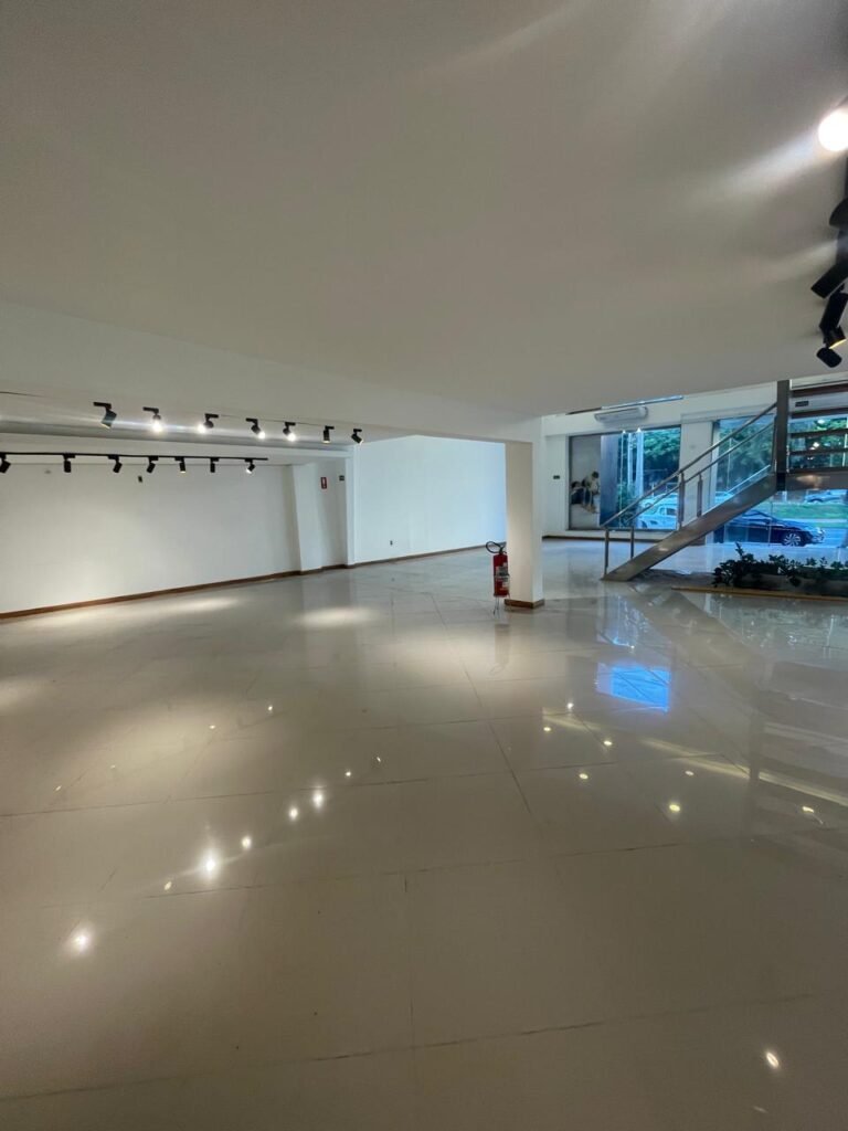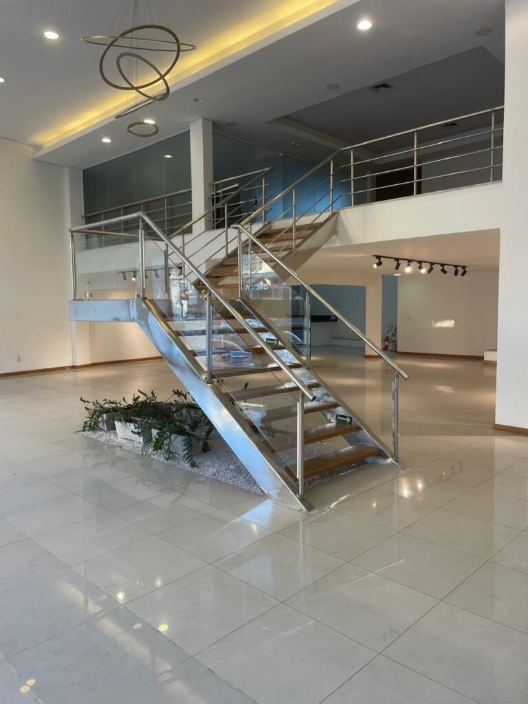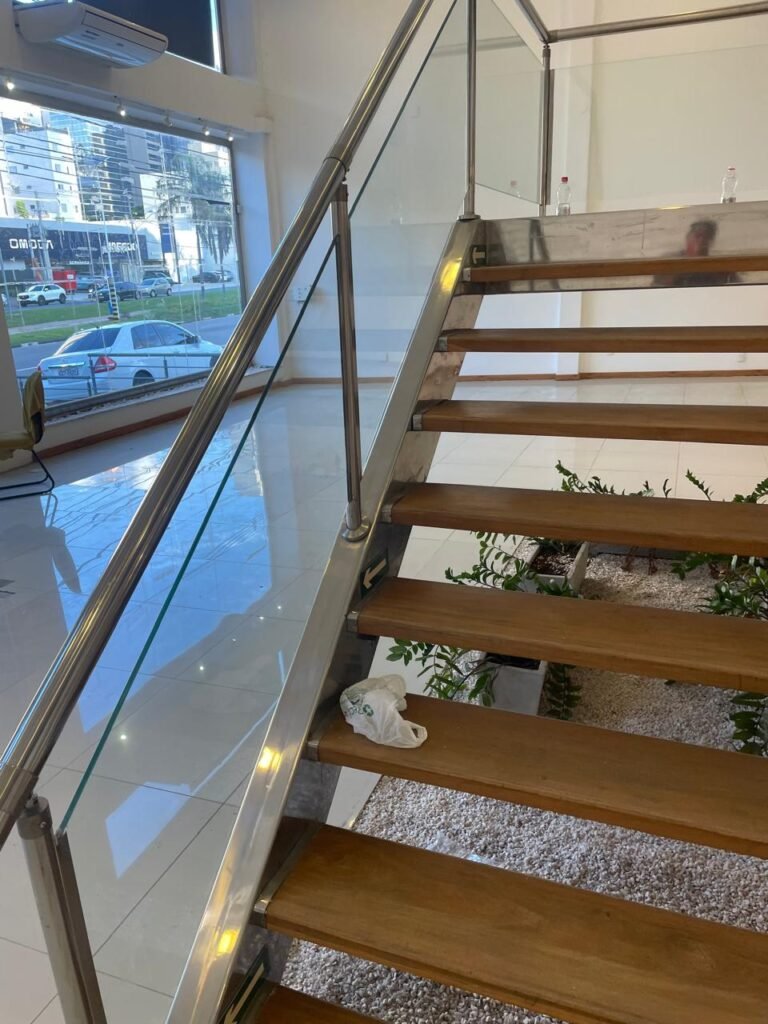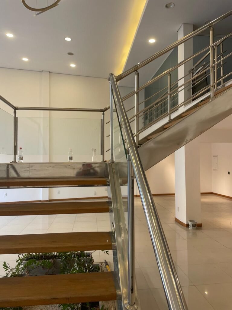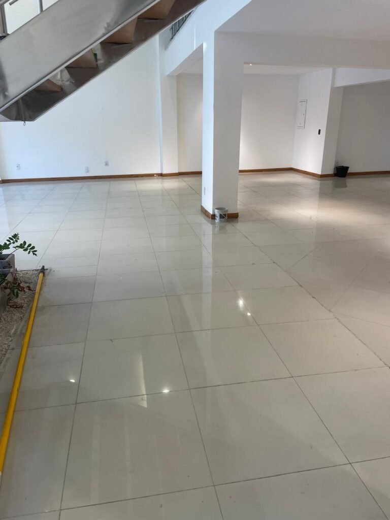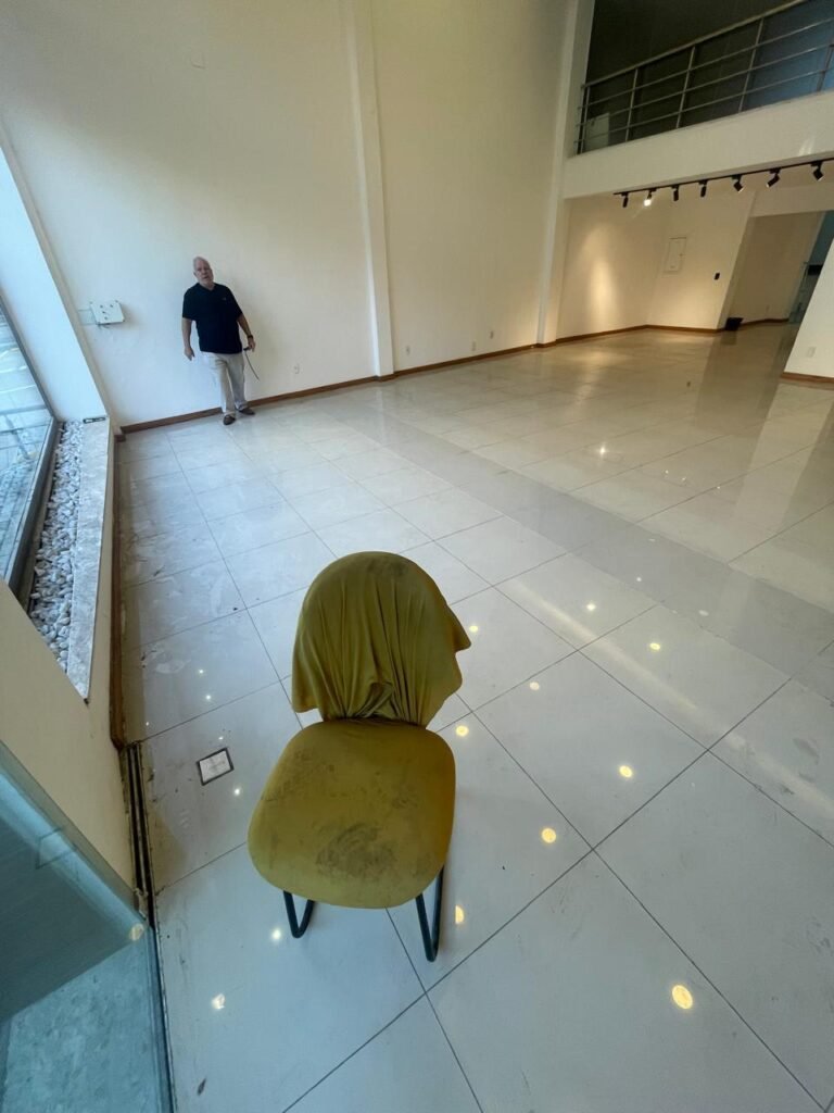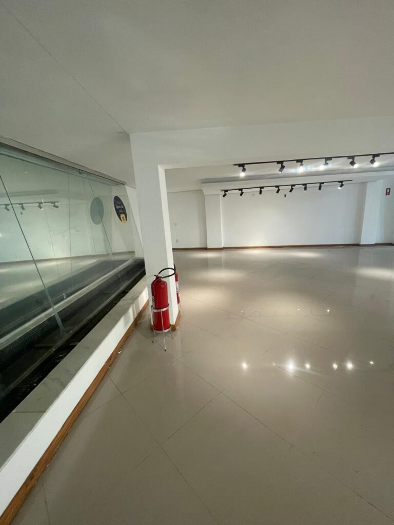 INTERIOR LOJA-: Portas de vidros deslizantes com 04 folhas de vidro Blindex com restos de adesivos, 01 fechadura marca Arouca com 01 cadeado marca Pado Lt-45 em ordem, piso revestido de porcelanato com desgastes naturais, partes com remendos, partes trincadas e restante em ordem, rodapés revestidos de madeira com desgastes naturais, manchas de tinta e restante em ordem, paredes com pintura na cor branco neve, com partes descascando, desgastes naturais e restante em ordem, 02 vitrôs fixos sendo 01 deles com 03 folhas de vidros blindex, a outra com 02 folhas, ambas com restante de adesivos e marcas de desgastes naturais, 02 cercados em granito com pedras brancas com desgastes naturais e restante em ordem, 10 tomadas, 08 espelhos cegos, 04 interruptores (sendo que 01 deles está danificado), 01 quadro de interruptores marca Brum com 04 interruptores em ordem, 01 quadro de disjuntores marca Sica e Margirus em ordem com tampa de proteção e com pintura na cor branco, 04 luminárias cor preta sendo que em 03 delas tem 08 spots em cada e em 01 deles tem 03 spots e todas as lâmpadas estão em ordem, 04 luminárias cor branco com 02 spots em ordem em cada 01 delas menos em 01 (que tem apenas 01 spot), 03 ar condicionados marca Springer não testados (cláusula explicando), 31 luminárias com LED embutido sendo que 25 estão com lâmpadas em ordem restante está danificada, 01 câmera não testada, 01 luminária de emergência não testada, cercado com pedras na cor branco e com 05 vasos de concreto com plantas em ordem, 04 extintores de incêndio, 02 de água e 02 de pó químico ambos com manutenção em outubro de 2023, 01 cascata de água desativada de alvenaria revestido em granito e pastilhas, 01 parede com 03 vidros temperados com desgastes naturais, teto com forro de gesso com iluminação embutida em ordem pintura na cor branco neve e partes com manchas de infiltração, 01 buraco, 01 lustre dourado em ordem, 01 escada com acabamentos, corrimões e guarda corpo em inox em ordem, com 06 folhas de vidro liso Blindex (01 delas está faltando).
