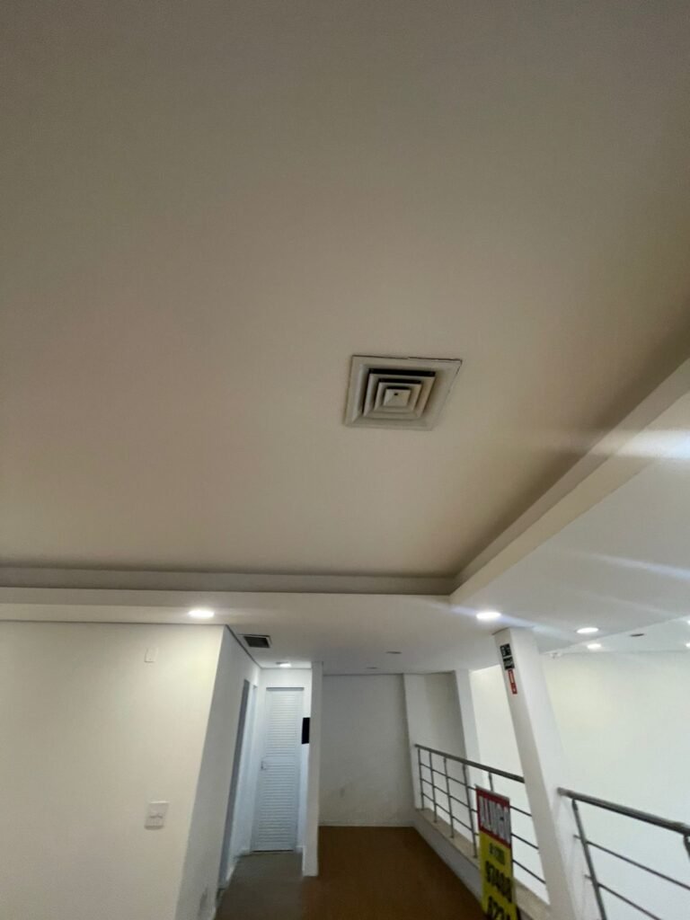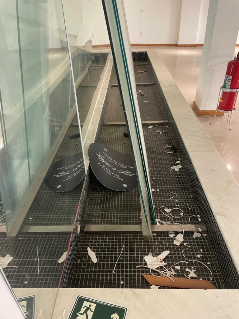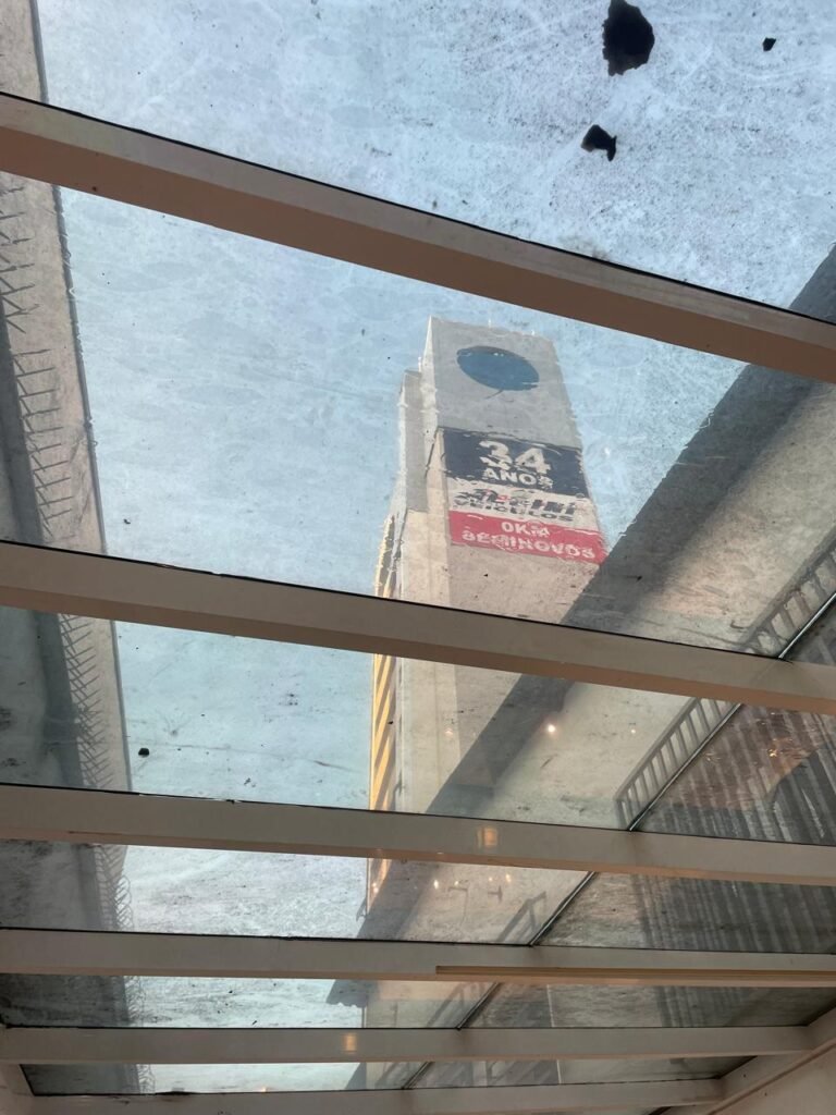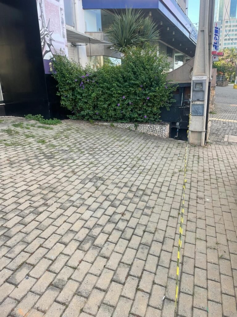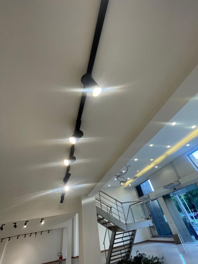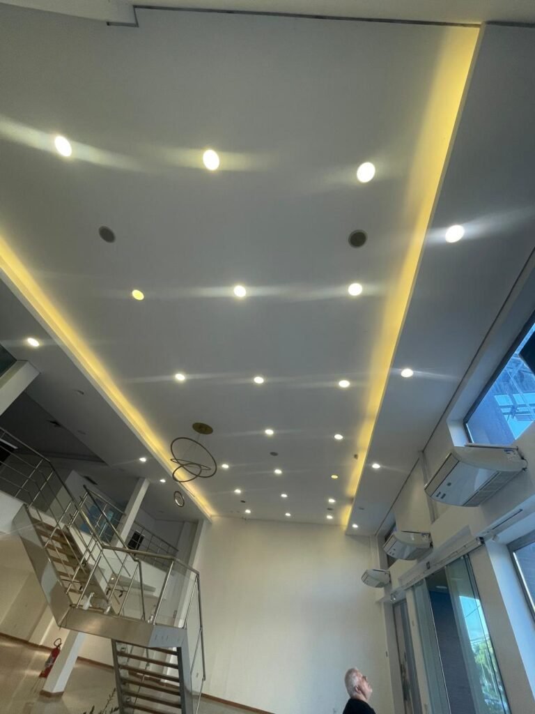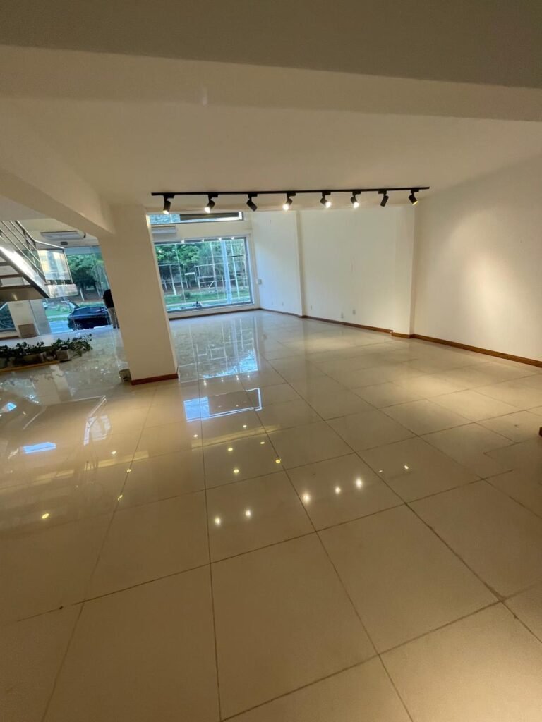 INTERIOR LOJA-: Portas de vidros deslizantes com 04 folhas de vidro Blindex com restos de adesivos, 01 fechadura marca Arouca com 01 cadeado marca Pado Lt-45 em ordem, piso revestido de porcelanato com desgastes naturais, partes com remendos, partes trincadas e restante em ordem, rodapés revestidos de madeira com desgastes naturais, manchas de tinta e restante em ordem, paredes com pintura na cor branco neve, com partes descascando, desgastes naturais e restante em ordem, 02 vitrôs fixos sendo 01 deles com 03 folhas de vidros blindex, a outra com 02 folhas, ambas com restante de adesivos e marcas de desgastes naturais, 02 cercados em granito com pedras brancas com desgastes naturais e restante em ordem, 10 tomadas, 08 espelhos cegos, 04 interruptores (sendo que 01 deles está danificado), 01 quadro de interruptores marca Brum com 04 interruptores em ordem, 01 quadro de disjuntores marca Sica e Margirus em ordem com tampa de proteção e com pintura na cor branco, 04 luminárias cor preta sendo que em 03 delas tem 08 spots em cada e em 01 deles tem 03 spots e todas as lâmpadas estão em ordem, 04 luminárias cor branco com 02 spots em ordem em cada 01 delas menos em 01 (que tem apenas 01 spot), 03 ar condicionados marca Springer não testados (cláusula explicando), 31 luminárias com LED embutido sendo que 25 estão com lâmpadas em ordem restante está danificada, 01 câmera não testada, 01 luminária de emergência não testada, cercado com pedras na cor branco e com 05 vasos de concreto com plantas em ordem, 04 extintores de incêndio, 02 de água e 02 de pó químico ambos com manutenção em outubro de 2023, 01 cascata de água desativada de alvenaria revestido em granito e pastilhas, 01 parede com 03 vidros temperados com desgastes naturais, teto com forro de gesso com iluminação embutida em ordem pintura na cor branco neve e partes com manchas de infiltração, 01 buraco, 01 lustre dourado em ordem, 01 escada com acabamentos, corrimões e guarda corpo em inox em ordem, com 06 folhas de vidro liso Blindex (01 delas está faltando).