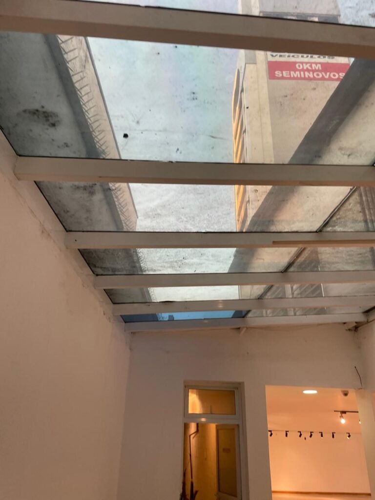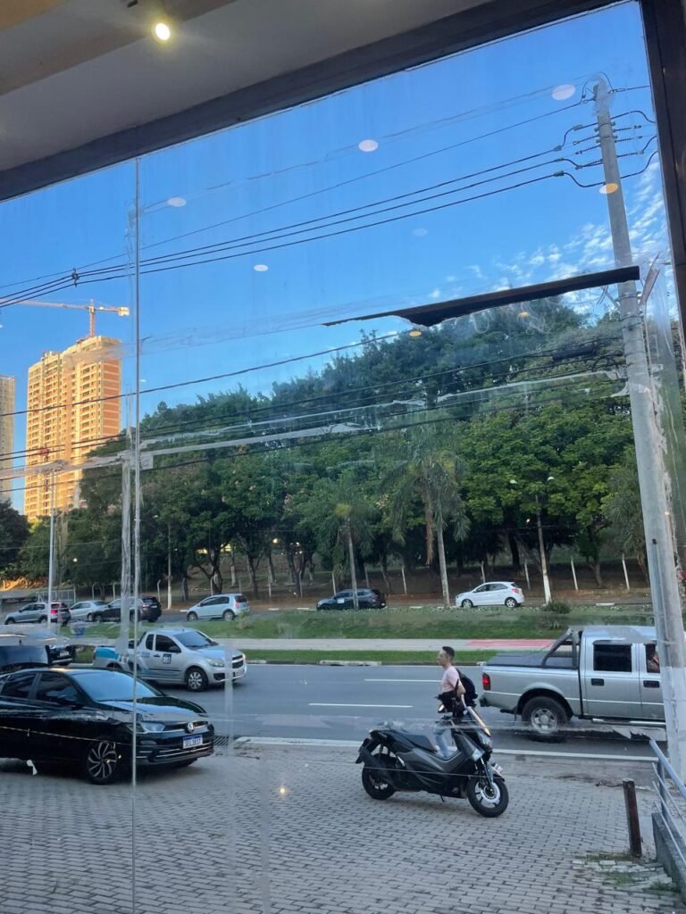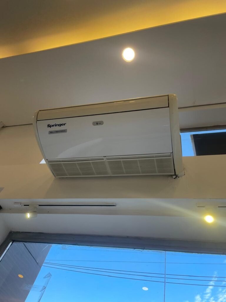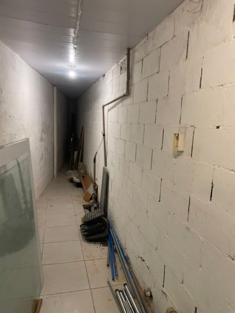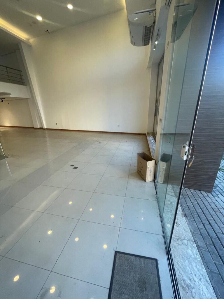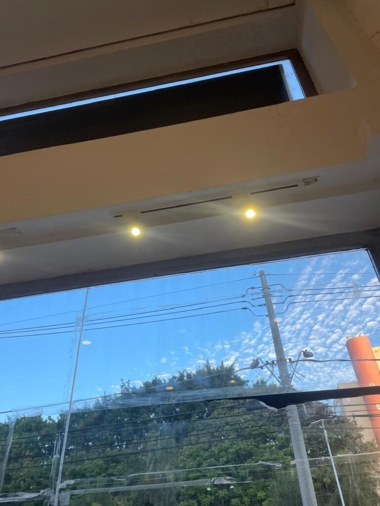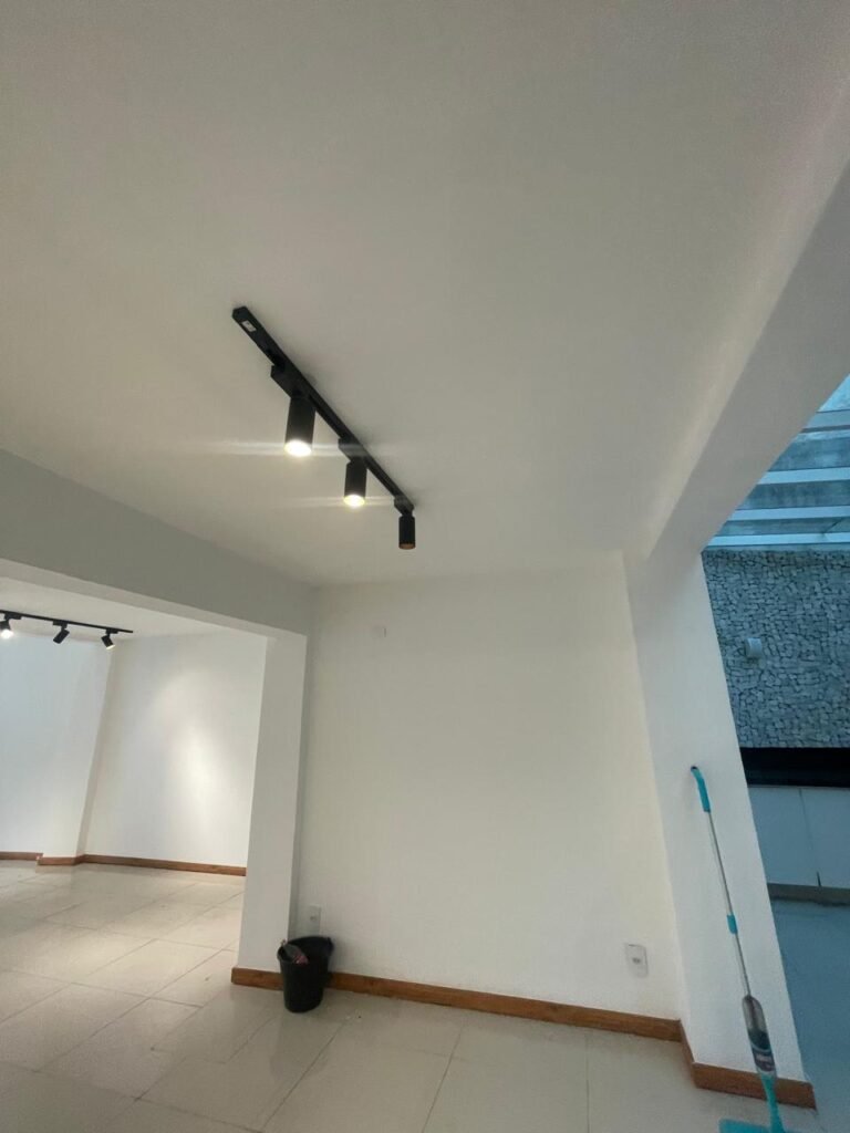 INTERIOR LOJA-: Portas de vidros deslizantes com 04 folhas de vidro Blindex com restos de adesivos, 01 fechadura marca Arouca com 01 cadeado marca Pado Lt-45 em ordem, piso revestido de porcelanato com desgastes naturais, partes com remendos, partes trincadas e restante em ordem, rodapés revestidos de madeira com desgastes naturais, manchas de tinta e restante em ordem, paredes com pintura na cor branco neve, com partes descascando, desgastes naturais e restante em ordem, 02 vitrôs fixos sendo 01 deles com 03 folhas de vidros blindex, a outra com 02 folhas, ambas com restante de adesivos e marcas de desgastes naturais, 02 cercados em granito com pedras brancas com desgastes naturais e restante em ordem, 10 tomadas, 08 espelhos cegos, 04 interruptores (sendo que 01 deles está danificado), 01 quadro de interruptores marca Brum com 04 interruptores em ordem, 01 quadro de disjuntores marca Sica e Margirus em ordem com tampa de proteção e com pintura na cor branco, 04 luminárias cor preta sendo que em 03 delas tem 08 spots em cada e em 01 deles tem 03 spots e todas as lâmpadas estão em ordem, 04 luminárias cor branco com 02 spots em ordem em cada 01 delas menos em 01 (que tem apenas 01 spot), 03 ar condicionados marca Springer não testados (cláusula explicando), 31 luminárias com LED embutido sendo que 25 estão com lâmpadas em ordem restante está danificada, 01 câmera não testada, 01 luminária de emergência não testada, cercado com pedras na cor branco e com 05 vasos de concreto com plantas em ordem, 04 extintores de incêndio, 02 de água e 02 de pó químico ambos com manutenção em outubro de 2023, 01 cascata de água desativada de alvenaria revestido em granito e pastilhas, 01 parede com 03 vidros temperados com desgastes naturais, teto com forro de gesso com iluminação embutida em ordem pintura na cor branco neve e partes com manchas de infiltração, 01 buraco, 01 lustre dourado em ordem, 01 escada com acabamentos, corrimões e guarda corpo em inox em ordem, com 06 folhas de vidro liso Blindex (01 delas está faltando).