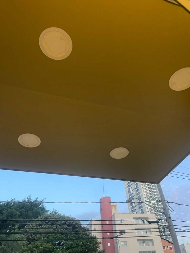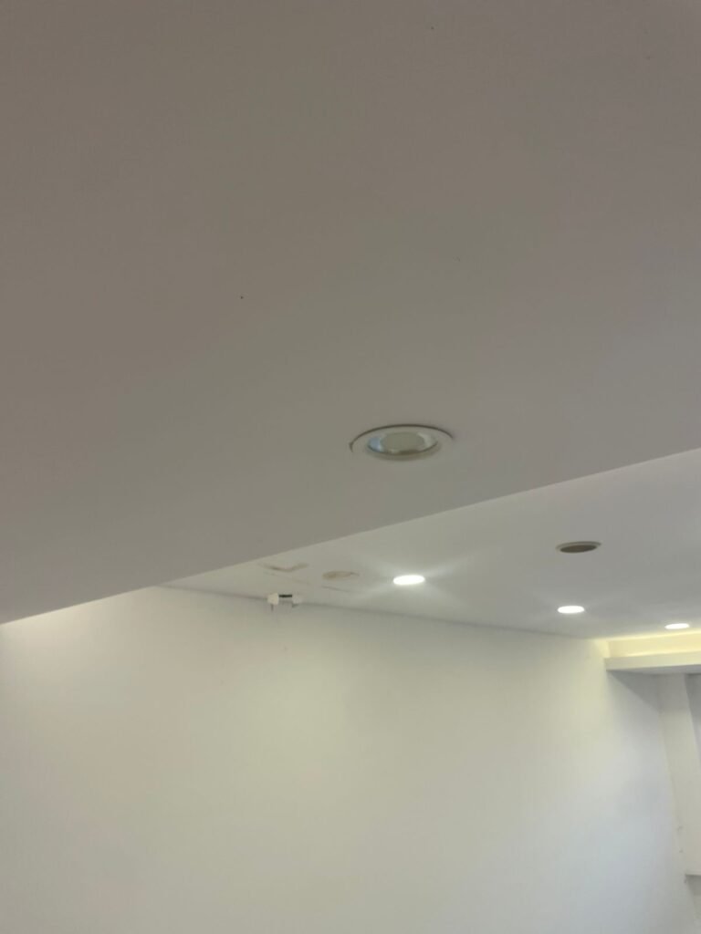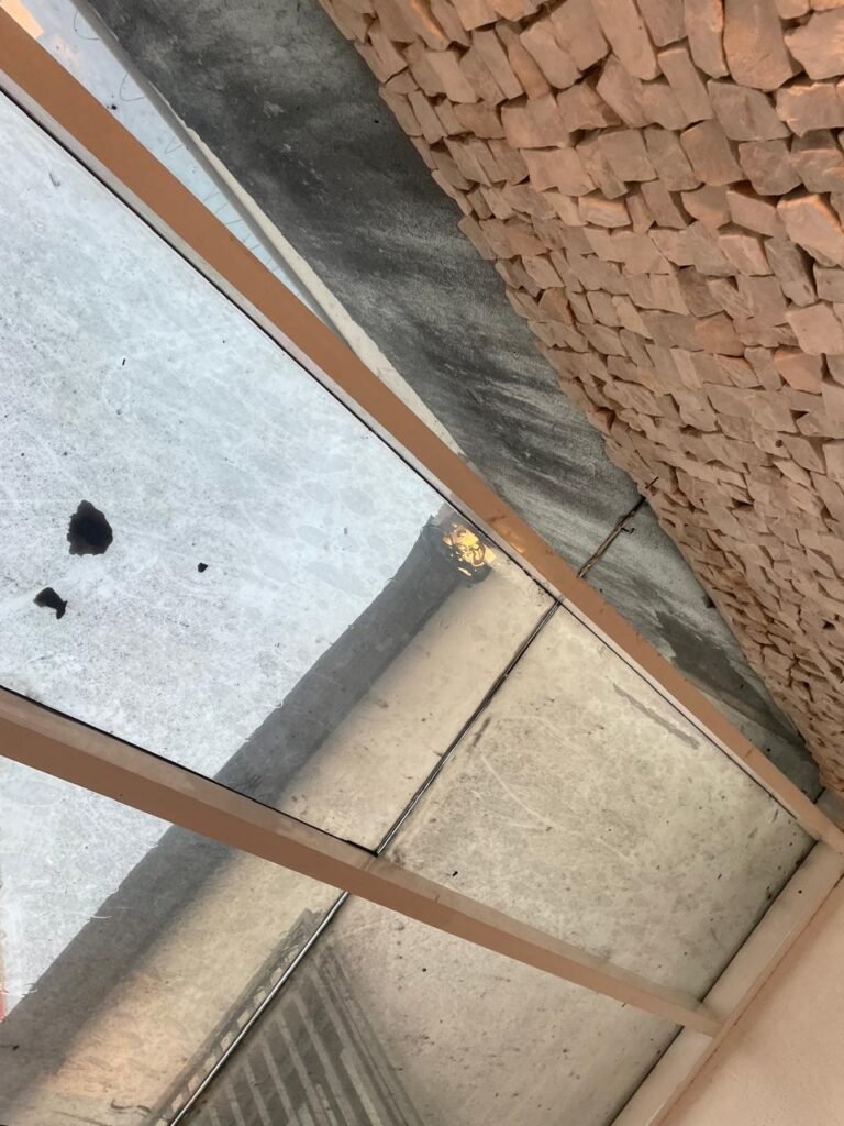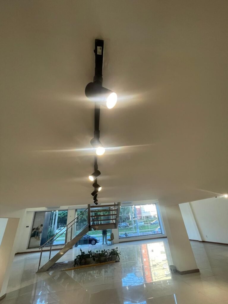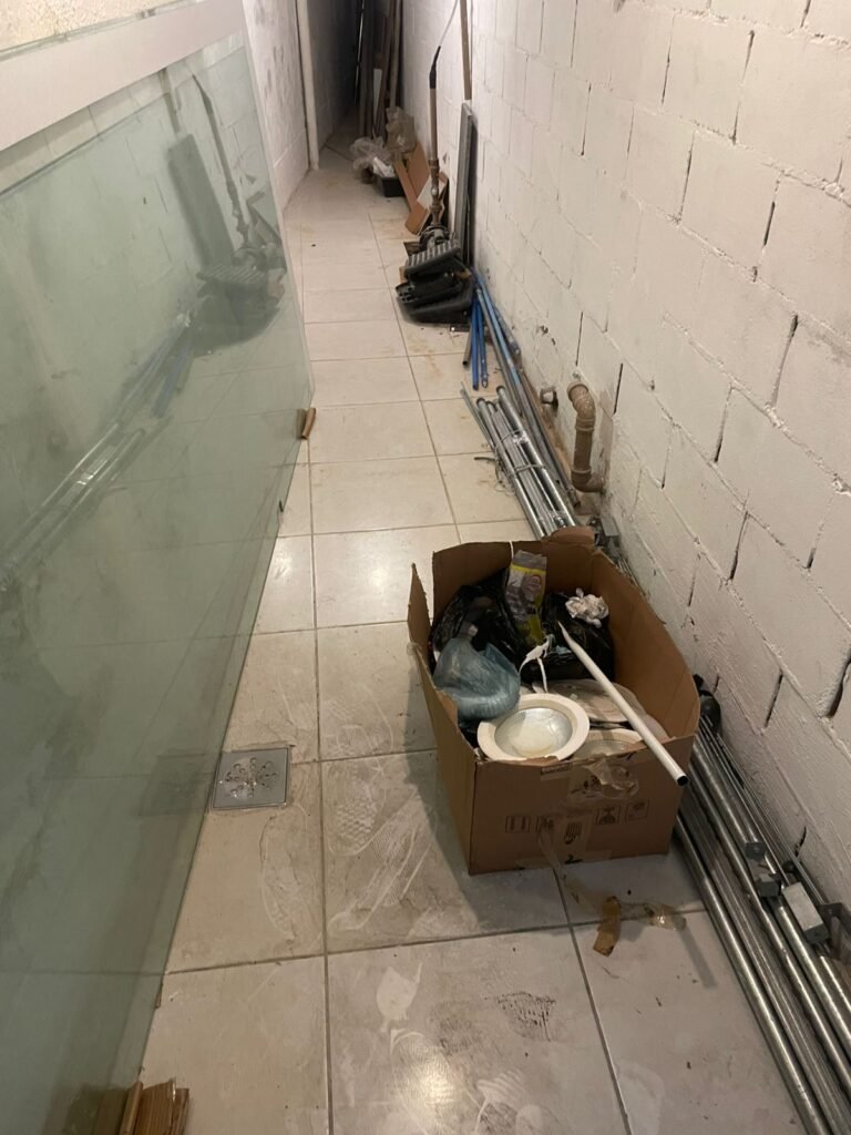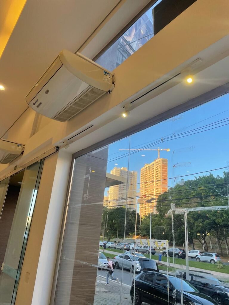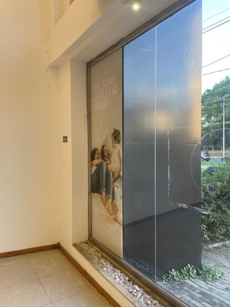 INTERIOR LOJA-: Portas de vidros deslizantes com 04 folhas de vidro Blindex com restos de adesivos, 01 fechadura marca Arouca com 01 cadeado marca Pado Lt-45 em ordem, piso revestido de porcelanato com desgastes naturais, partes com remendos, partes trincadas e restante em ordem, rodapés revestidos de madeira com desgastes naturais, manchas de tinta e restante em ordem, paredes com pintura na cor branco neve, com partes descascando, desgastes naturais e restante em ordem, 02 vitrôs fixos sendo 01 deles com 03 folhas de vidros blindex, a outra com 02 folhas, ambas com restante de adesivos e marcas de desgastes naturais, 02 cercados em granito com pedras brancas com desgastes naturais e restante em ordem, 10 tomadas, 08 espelhos cegos, 04 interruptores (sendo que 01 deles está danificado), 01 quadro de interruptores marca Brum com 04 interruptores em ordem, 01 quadro de disjuntores marca Sica e Margirus em ordem com tampa de proteção e com pintura na cor branco, 04 luminárias cor preta sendo que em 03 delas tem 08 spots em cada e em 01 deles tem 03 spots e todas as lâmpadas estão em ordem, 04 luminárias cor branco com 02 spots em ordem em cada 01 delas menos em 01 (que tem apenas 01 spot), 03 ar condicionados marca Springer não testados (cláusula explicando), 31 luminárias com LED embutido sendo que 25 estão com lâmpadas em ordem restante está danificada, 01 câmera não testada, 01 luminária de emergência não testada, cercado com pedras na cor branco e com 05 vasos de concreto com plantas em ordem, 04 extintores de incêndio, 02 de água e 02 de pó químico ambos com manutenção em outubro de 2023, 01 cascata de água desativada de alvenaria revestido em granito e pastilhas, 01 parede com 03 vidros temperados com desgastes naturais, teto com forro de gesso com iluminação embutida em ordem pintura na cor branco neve e partes com manchas de infiltração, 01 buraco, 01 lustre dourado em ordem, 01 escada com acabamentos, corrimões e guarda corpo em inox em ordem, com 06 folhas de vidro liso Blindex (01 delas está faltando).