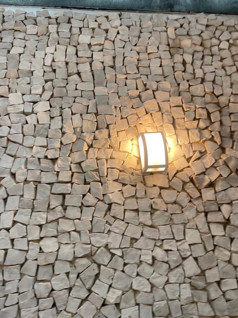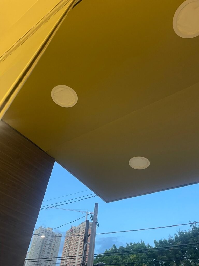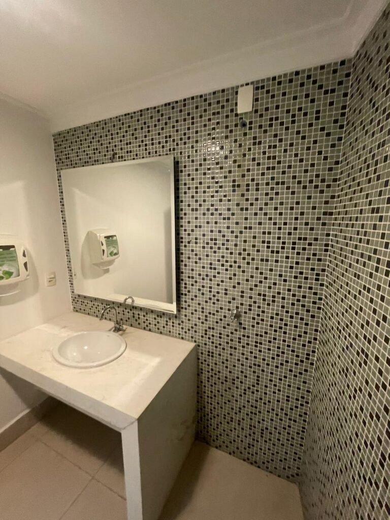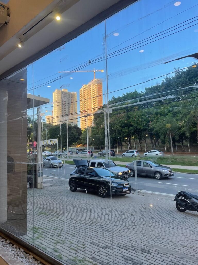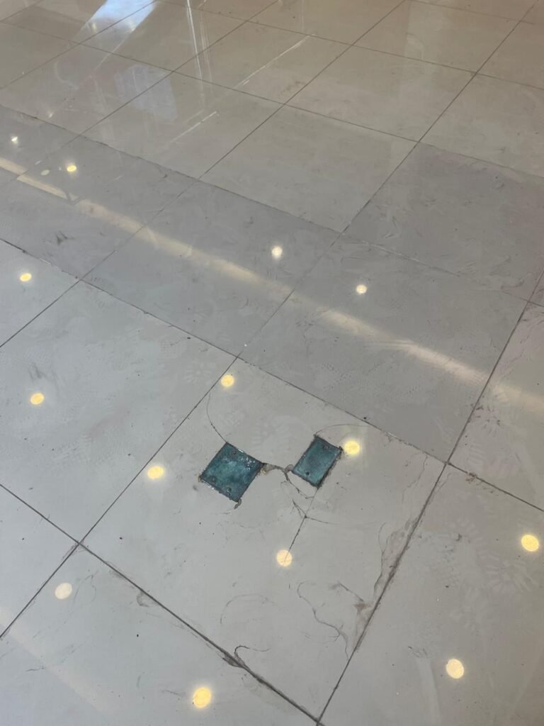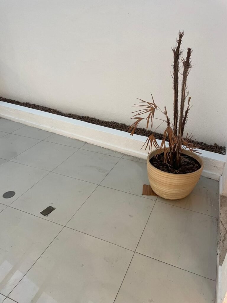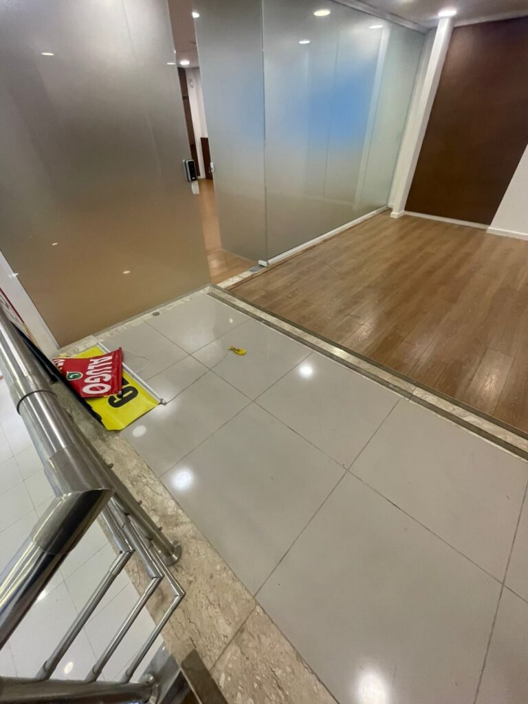 INTERIOR LOJA-: Portas de vidros deslizantes com 04 folhas de vidro Blindex com restos de adesivos, 01 fechadura marca Arouca com 01 cadeado marca Pado Lt-45 em ordem, piso revestido de porcelanato com desgastes naturais, partes com remendos, partes trincadas e restante em ordem, rodapés revestidos de madeira com desgastes naturais, manchas de tinta e restante em ordem, paredes com pintura na cor branco neve, com partes descascando, desgastes naturais e restante em ordem, 02 vitrôs fixos sendo 01 deles com 03 folhas de vidros blindex, a outra com 02 folhas, ambas com restante de adesivos e marcas de desgastes naturais, 02 cercados em granito com pedras brancas com desgastes naturais e restante em ordem, 10 tomadas, 08 espelhos cegos, 04 interruptores (sendo que 01 deles está danificado), 01 quadro de interruptores marca Brum com 04 interruptores em ordem, 01 quadro de disjuntores marca Sica e Margirus em ordem com tampa de proteção e com pintura na cor branco, 04 luminárias cor preta sendo que em 03 delas tem 08 spots em cada e em 01 deles tem 03 spots e todas as lâmpadas estão em ordem, 04 luminárias cor branco com 02 spots em ordem em cada 01 delas menos em 01 (que tem apenas 01 spot), 03 ar condicionados marca Springer não testados (cláusula explicando), 31 luminárias com LED embutido sendo que 25 estão com lâmpadas em ordem restante está danificada, 01 câmera não testada, 01 luminária de emergência não testada, cercado com pedras na cor branco e com 05 vasos de concreto com plantas em ordem, 04 extintores de incêndio, 02 de água e 02 de pó químico ambos com manutenção em outubro de 2023, 01 cascata de água desativada de alvenaria revestido em granito e pastilhas, 01 parede com 03 vidros temperados com desgastes naturais, teto com forro de gesso com iluminação embutida em ordem pintura na cor branco neve e partes com manchas de infiltração, 01 buraco, 01 lustre dourado em ordem, 01 escada com acabamentos, corrimões e guarda corpo em inox em ordem, com 06 folhas de vidro liso Blindex (01 delas está faltando).