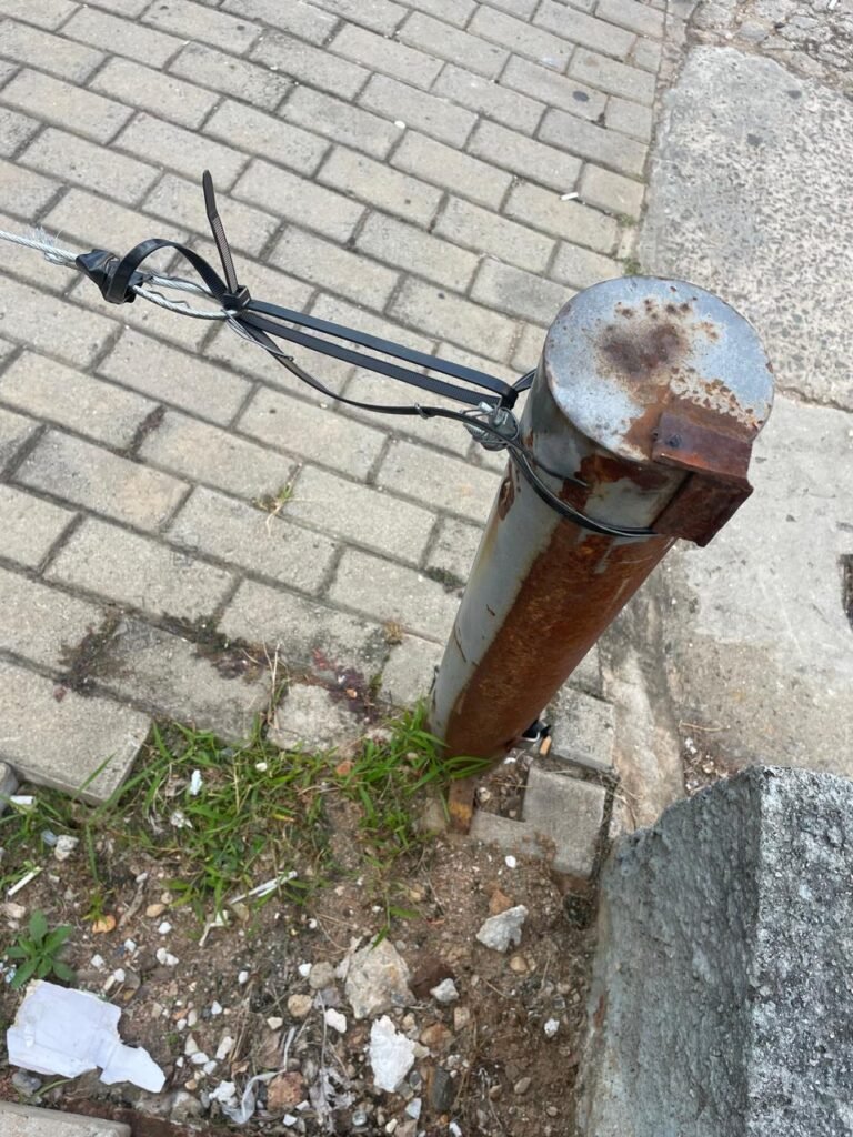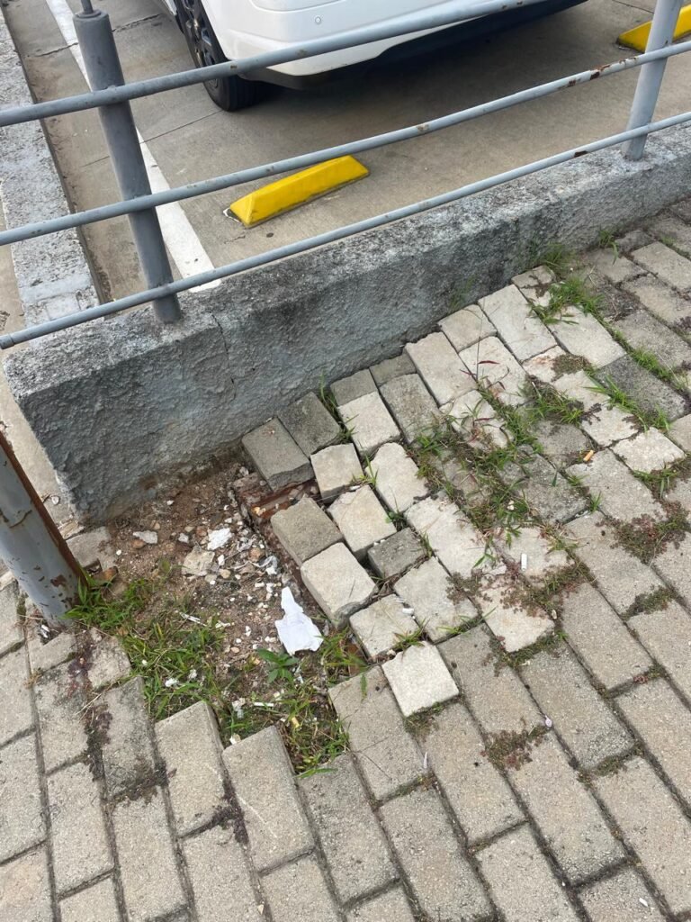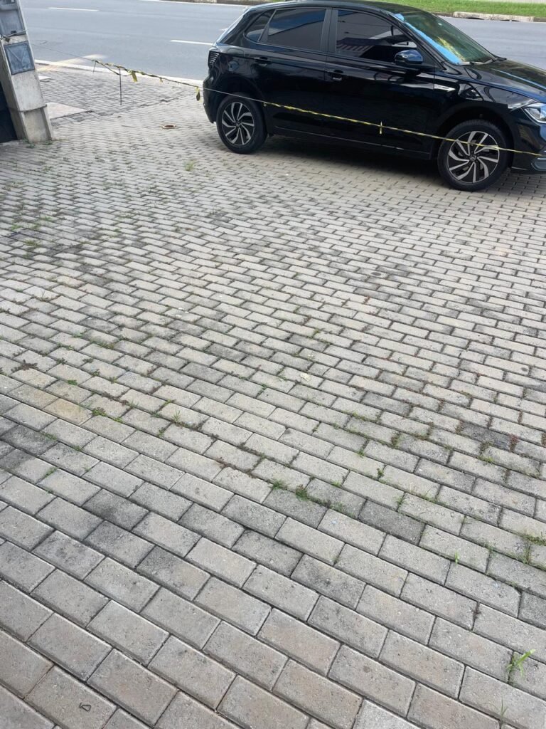 FACHADA-: Calçada de bloquetes Inter travados com partes danificadas com matos aparentes com desgastes natural e restante em ordem, banner com cabine de acesso a escada para manutenção com porta social e 01 cadeado em ordem, 01 poste padrão Piton em ordem e com quadro de medidor elétrico em ordem, 01 viga de ferro com desgastes naturais, 01 cabo de aço amarrado por enforca gato e com 01 cadeado marca Pado em ordem e com chave, mureta lateral em alvenaria com grafiato e pintura na cor preto com desgastes naturais, 01 cercado jardim em pedras Inter travadas em ordem, quadro distribuição da Sanasa sem hidrômetro e com fiação aparente, paredes da loja revestida de laminado acrílico de madeira com desgastes naturais e buracos com parafusos, parede com grafiato com pintura na cor preto com desgastes naturais, algumas manchas, 02 câmeras não testadas.