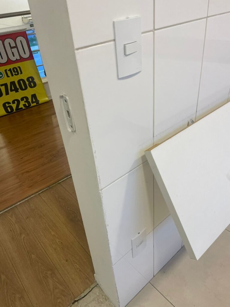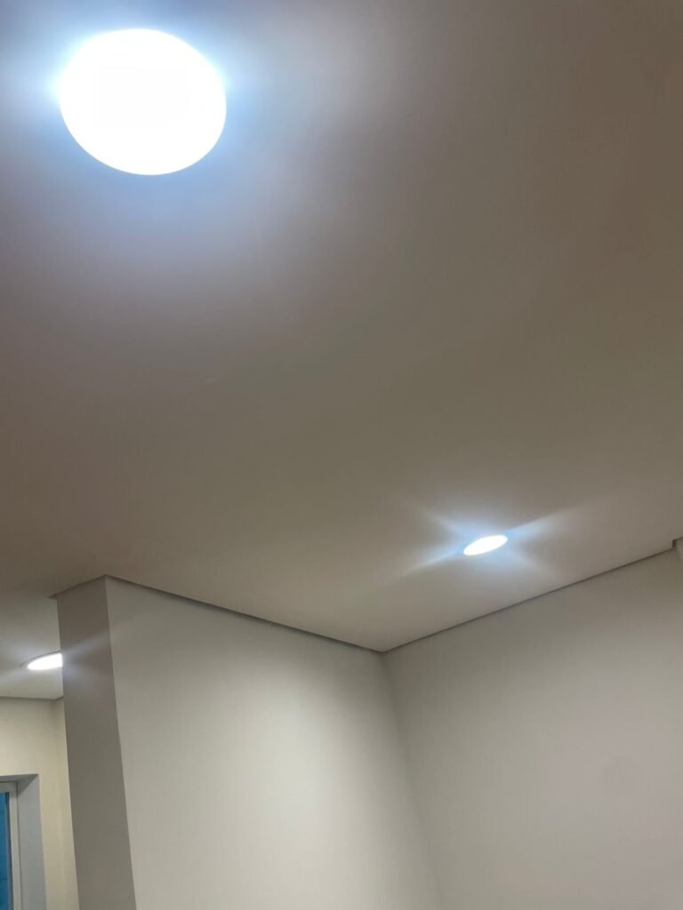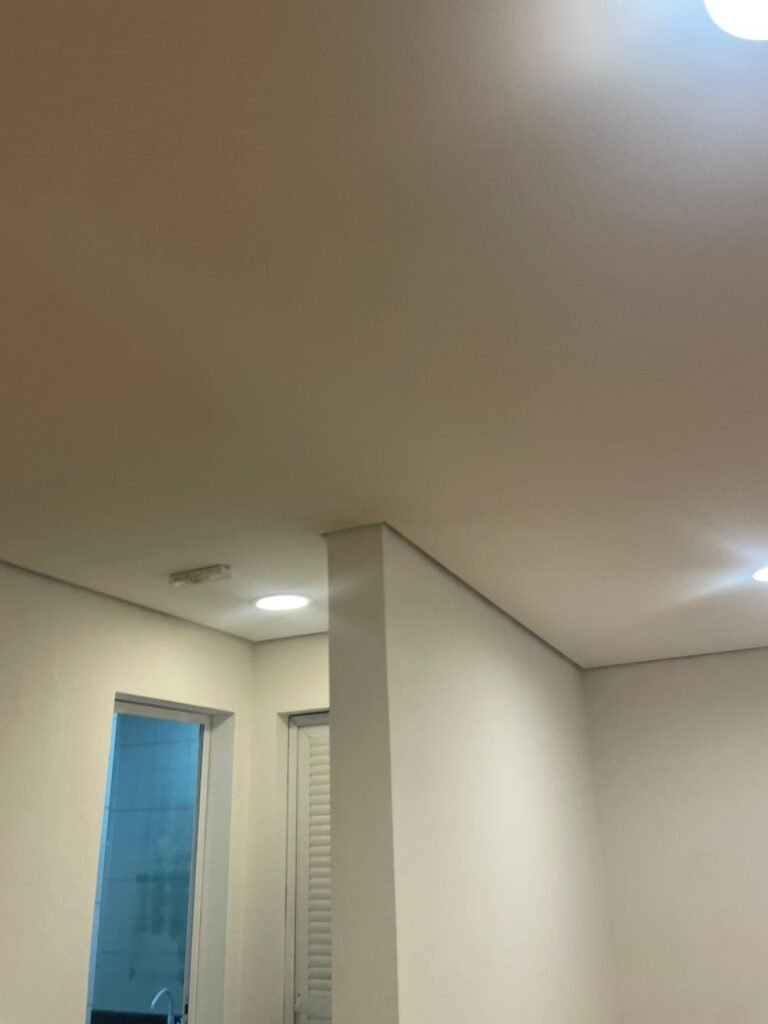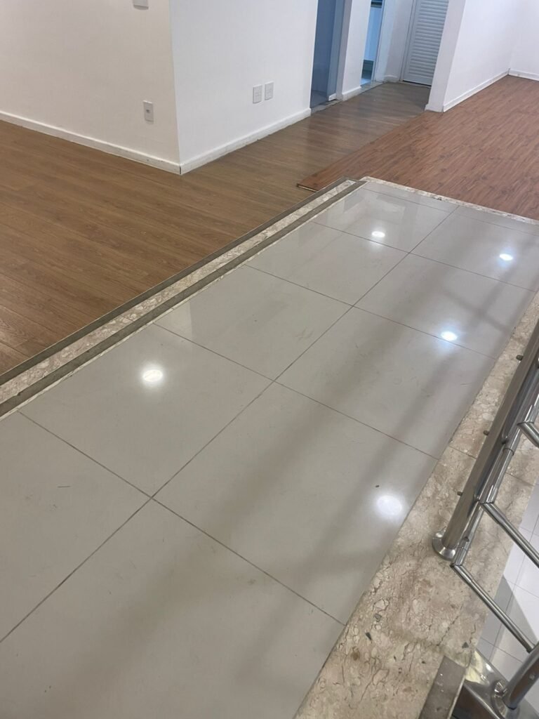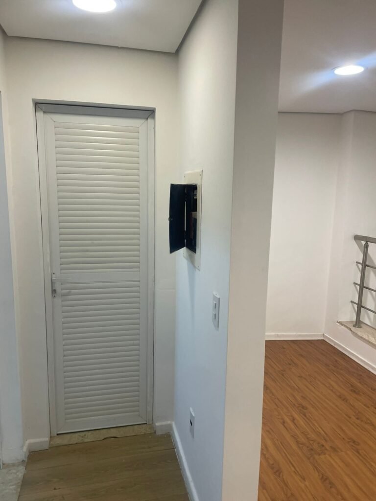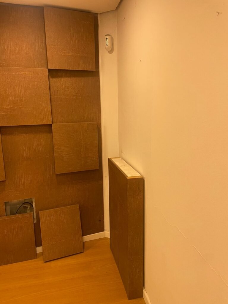 HALL ANDAR SUPERIOR-: Entrada com pisos revestidos em porcelanato e granito em ordem, com faixas antiderrapantes em ordem, partes do piso revestidas com dois tipos de laminados de madeira em ordem, rodapés revestidos de madeira com pintura na cor branco com desgastes naturais, paredes com pintura na cor branco neve em ordem, 04 interruptores em ordem, 06 espelhos cegos e 02 tomadas em ordem 01 tomada danificada, guarda corpos em inox em ordem, 01 parede isolada com placa de madeira, teto com forro de gesso com gola em ordem, com pintura na cor branco neve em ordem, 20 Luminárias embutidas sendo que, 18 estão com led em ordem restante está danificado, adaptador de fio de internet sensor, 01 sensor tp link, 01 câmera kodo não testados, 03 trocadores de ar não testados, 01 quadro de distribuição com tampa em ordem, com disjuntores marca Sica e Steck em ordem, 01 luminárias de emergência com ferrugem.