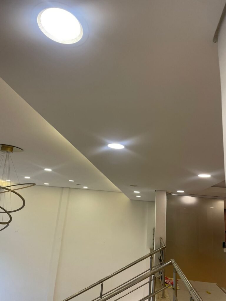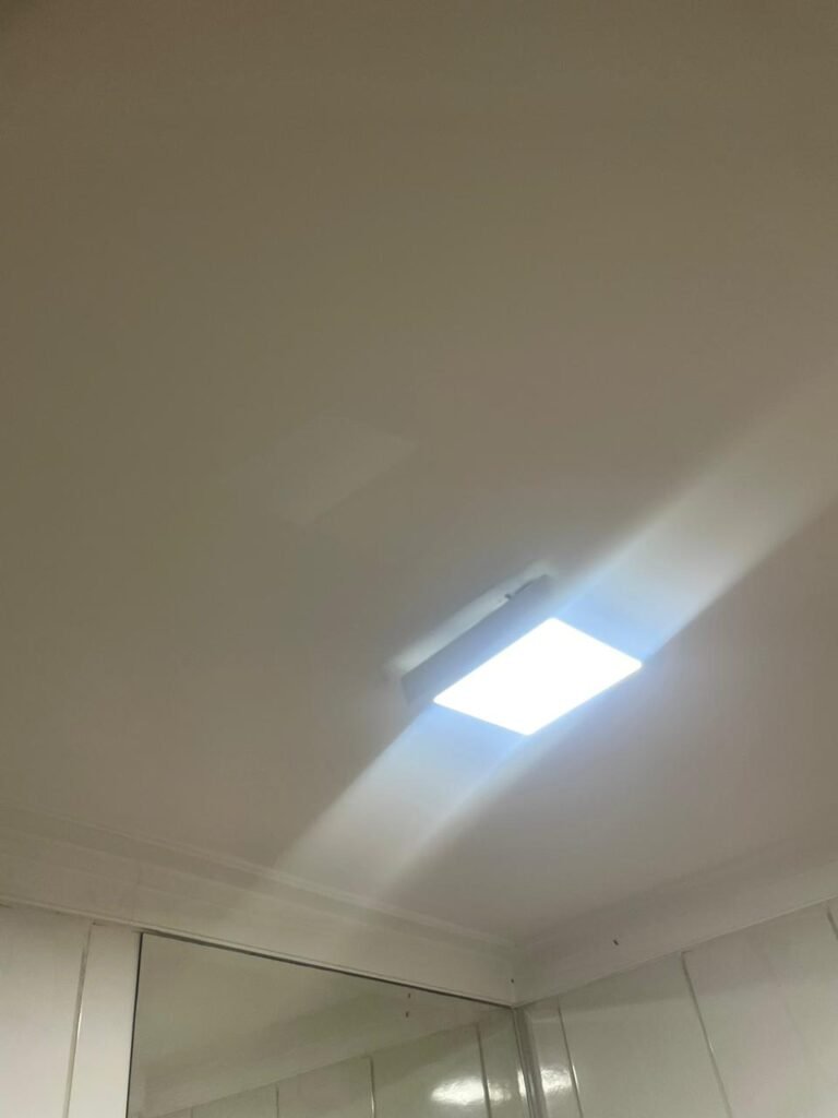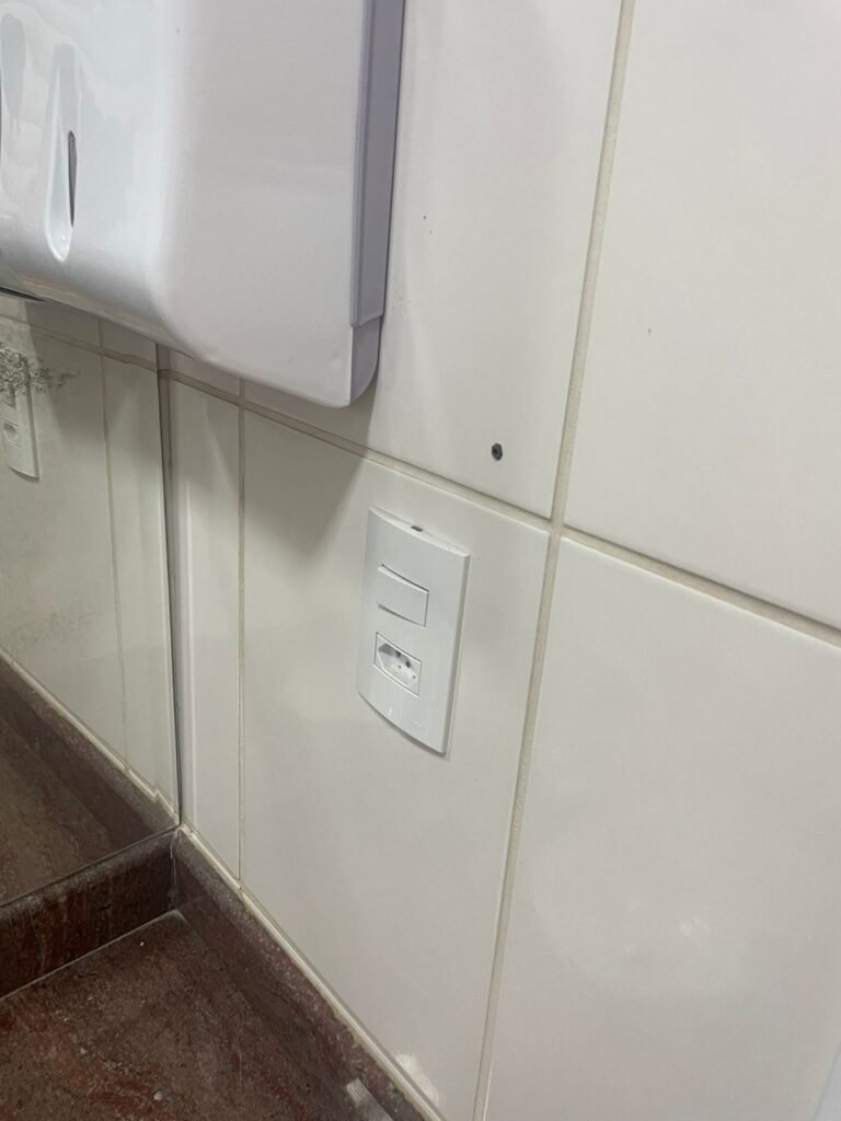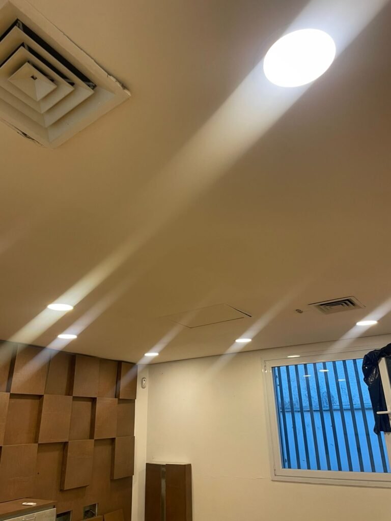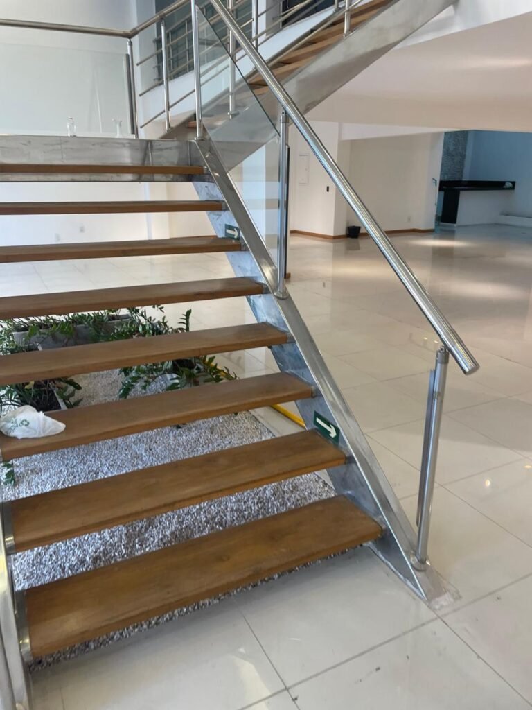 HALL ANDAR SUPERIOR-: Entrada com pisos revestidos em porcelanato e granito em ordem, com faixas antiderrapantes em ordem, partes do piso revestidas com dois tipos de laminados de madeira em ordem, rodapés revestidos de madeira com pintura na cor branco com desgastes naturais, paredes com pintura na cor branco neve em ordem, 04 interruptores em ordem, 06 espelhos cegos e 02 tomadas em ordem 01 tomada danificada, guarda corpos em inox em ordem, 01 parede isolada com placa de madeira, teto com forro de gesso com gola em ordem, com pintura na cor branco neve em ordem, 20 Luminárias embutidas sendo que, 18 estão com led em ordem restante está danificado, adaptador de fio de internet sensor, 01 sensor tp link, 01 câmera kodo não testados, 03 trocadores de ar não testados, 01 quadro de distribuição com tampa em ordem, com disjuntores marca Sica e Steck em ordem, 01 luminárias de emergência com ferrugem.