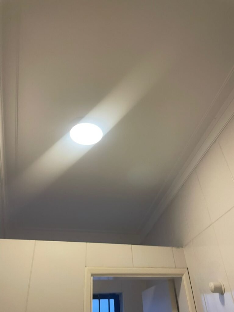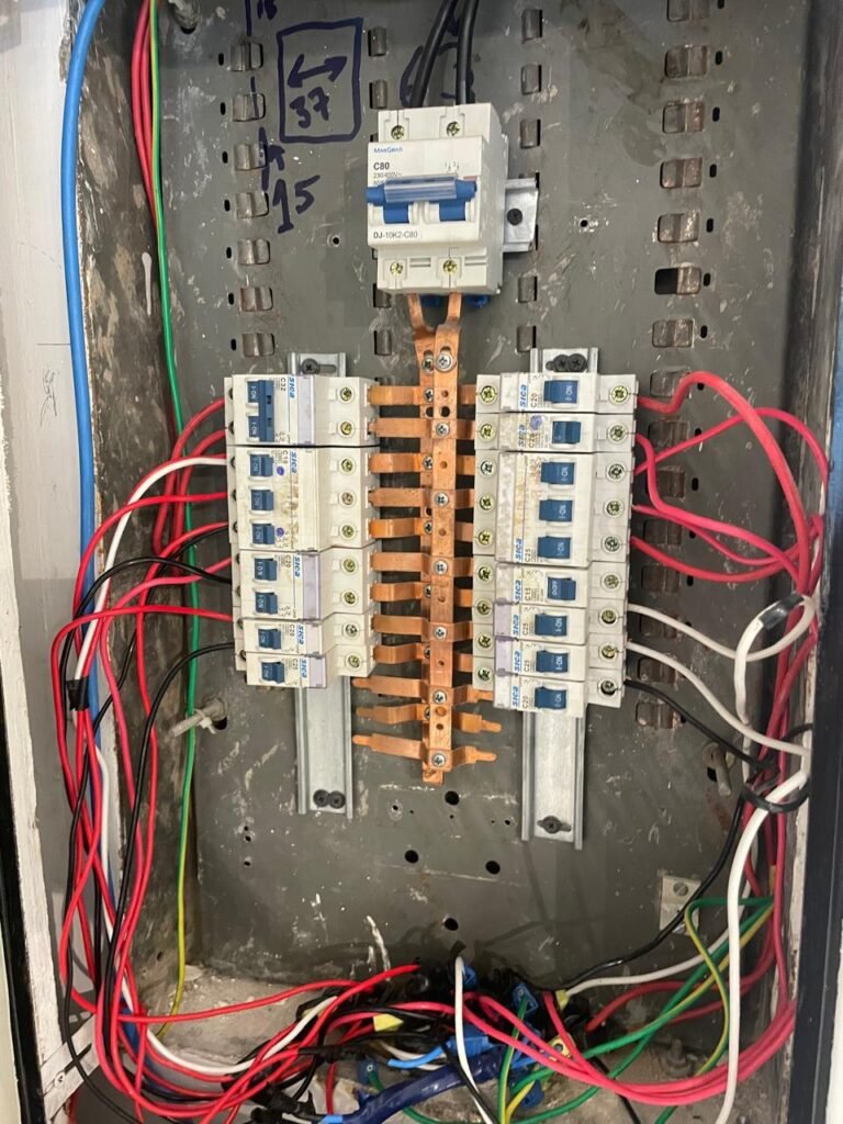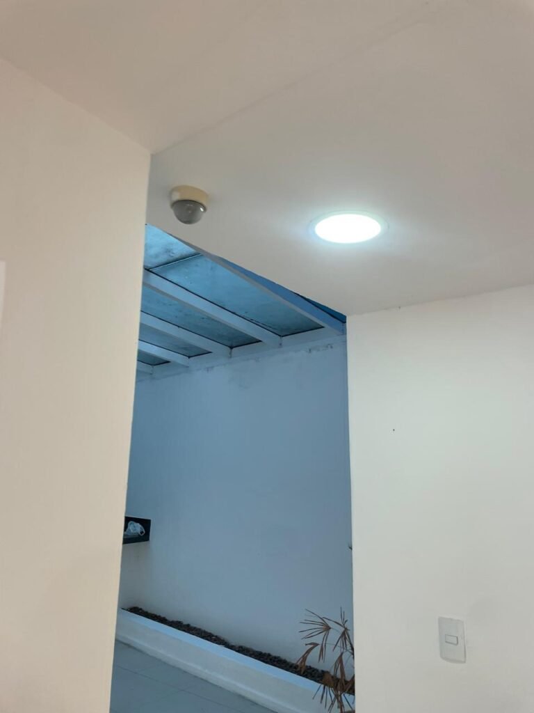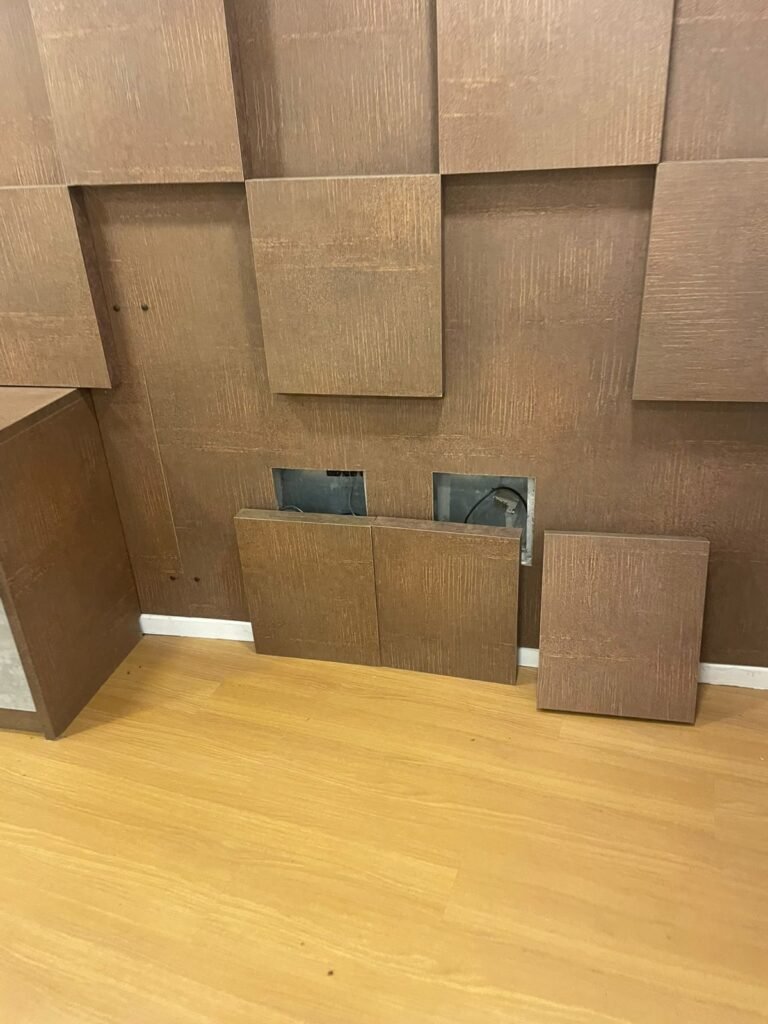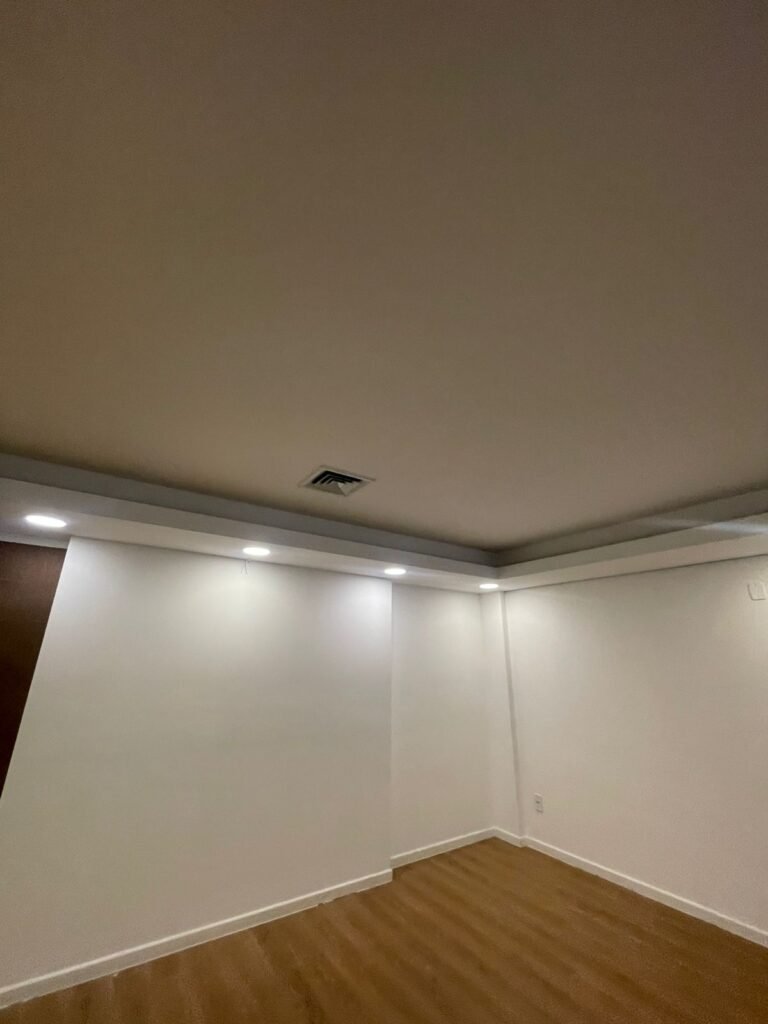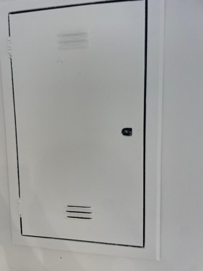 HALL ANDAR SUPERIOR-: Entrada com pisos revestidos em porcelanato e granito em ordem, com faixas antiderrapantes em ordem, partes do piso revestidas com dois tipos de laminados de madeira em ordem, rodapés revestidos de madeira com pintura na cor branco com desgastes naturais, paredes com pintura na cor branco neve em ordem, 04 interruptores em ordem, 06 espelhos cegos e 02 tomadas em ordem 01 tomada danificada, guarda corpos em inox em ordem, 01 parede isolada com placa de madeira, teto com forro de gesso com gola em ordem, com pintura na cor branco neve em ordem, 20 Luminárias embutidas sendo que, 18 estão com led em ordem restante está danificado, adaptador de fio de internet sensor, 01 sensor tp link, 01 câmera kodo não testados, 03 trocadores de ar não testados, 01 quadro de distribuição com tampa em ordem, com disjuntores marca Sica e Steck em ordem, 01 luminárias de emergência com ferrugem.