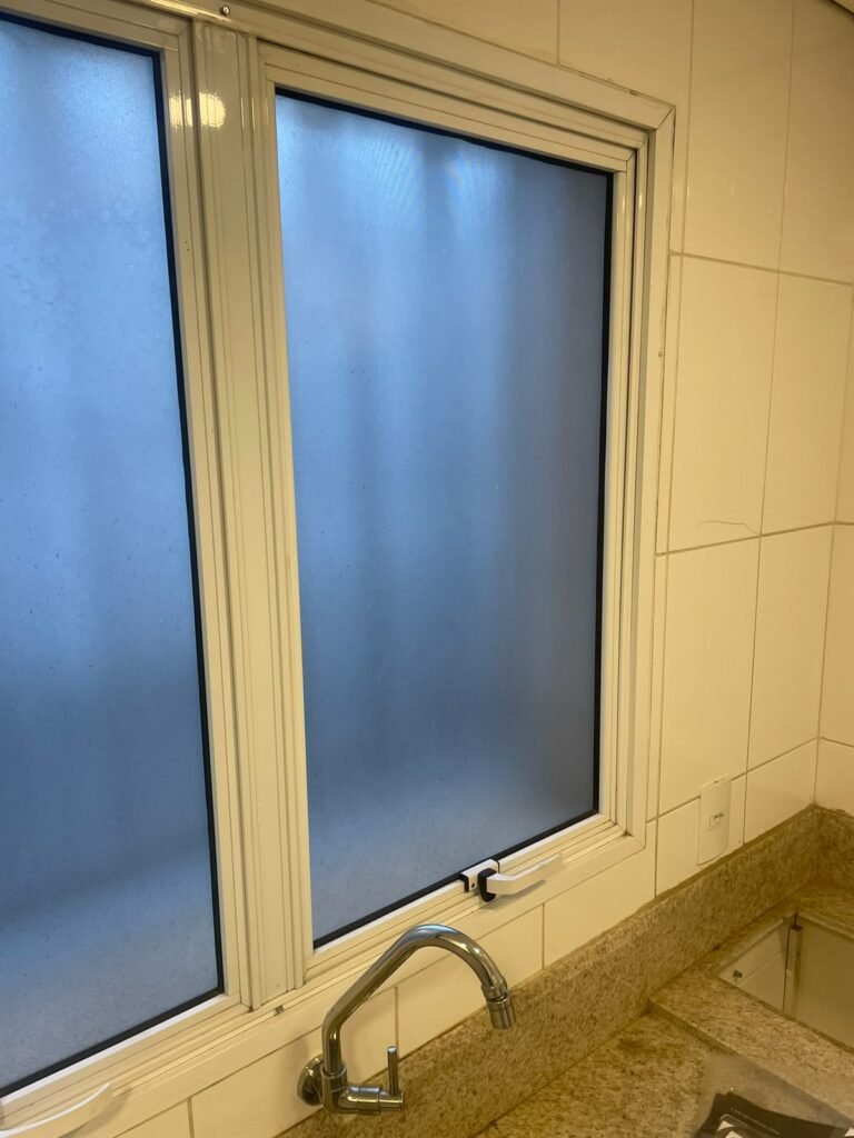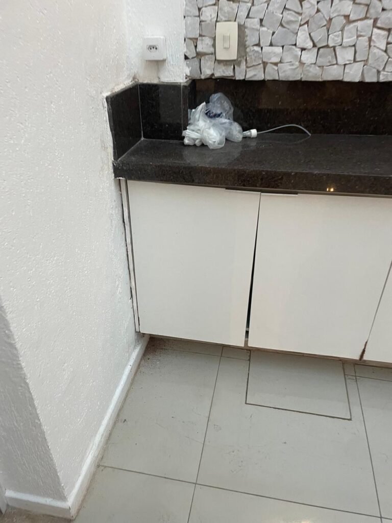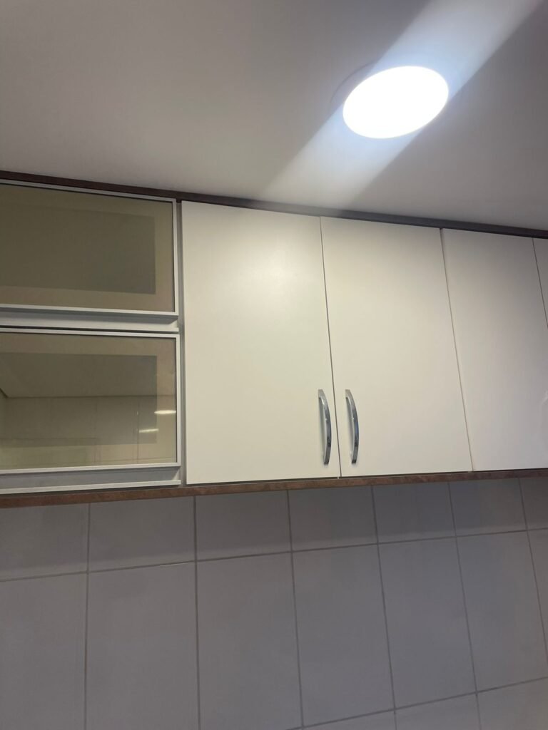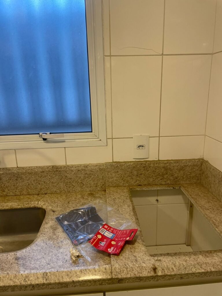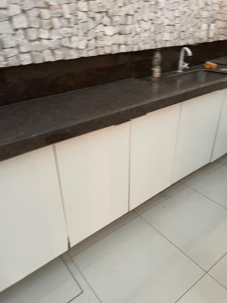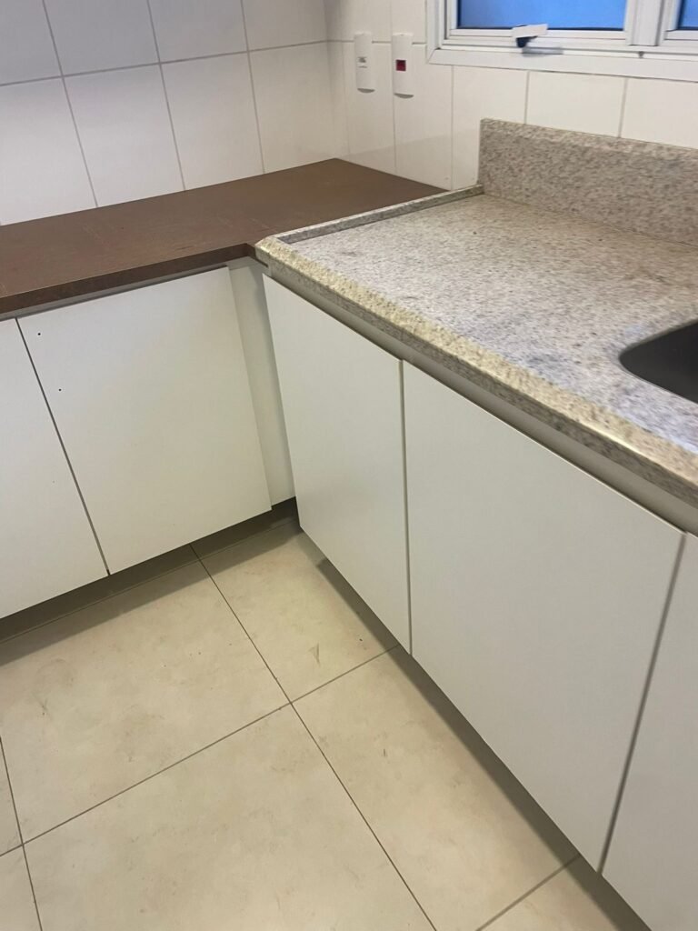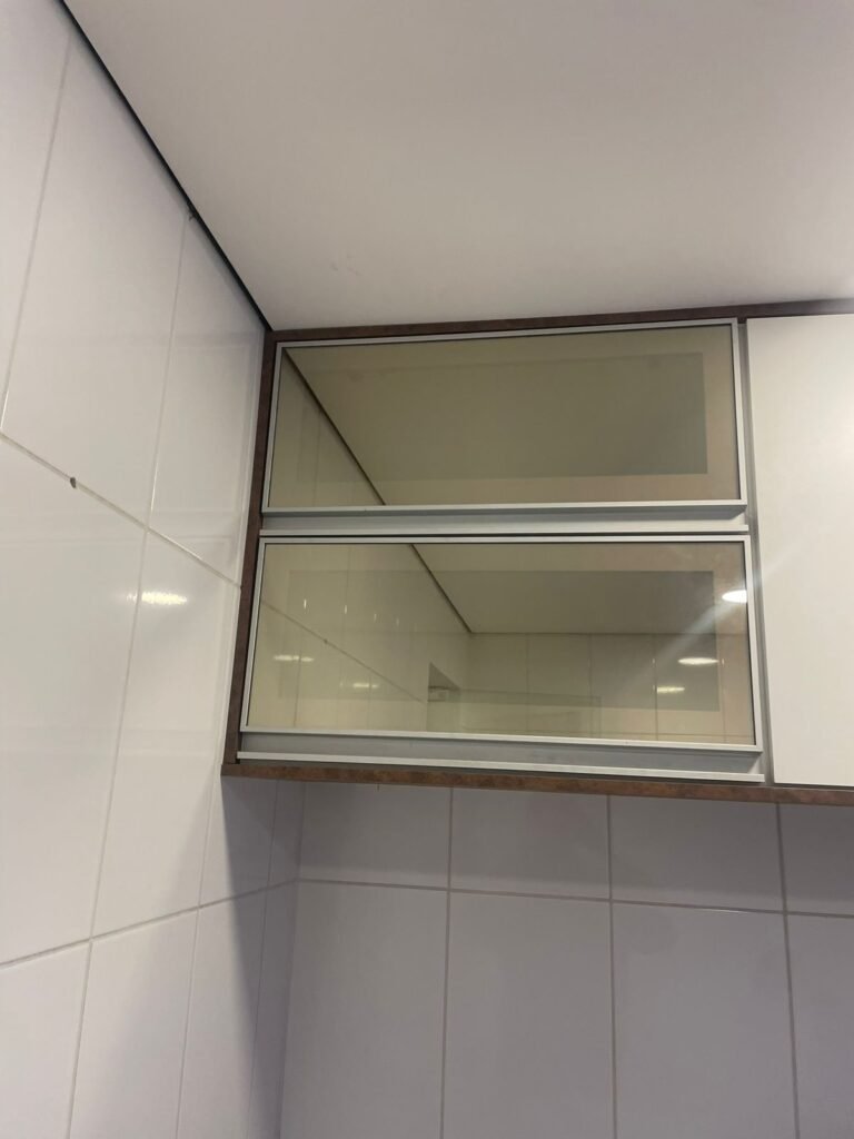 COPA-: 01 porta social de vidro blindex em ordem, com fechadura em ordem, piso revestido de pisos de porcelanato em ordem, paredes revestidas até o teto de azulejos em ordem, 01 bancada dobrável de mdf em ordem, 01 interruptor em ordem, 05 tomadas (01 delas 220v, restante 110v ) e 01 espelho cego, gabinete de mdf em L com 03 portas, 01 porta está sem puxador, móvel com desgastes naturais e restante em ordem, pia com pedra de granito em ordem, buraco para instalação de cooktop, cuba de inox em ordem, gabinete de mdf com 04 portas, todas com puxador embutido em ordem, 03 vitrôs basculantes com esquadrias de alumínio na cor branco em ordem, com 01 fechadura cada em ordem, e 01 folhas de acrílico em ordem, 01 gabinete suspenso de mdf com 06 portas, todas com puxadores em ordem e 02 delas com pistões pneumáticos, teto com forro de gesso em ordem e com pintura na cor branco neve em ordem, luminárias embutidas com leds em ordem.