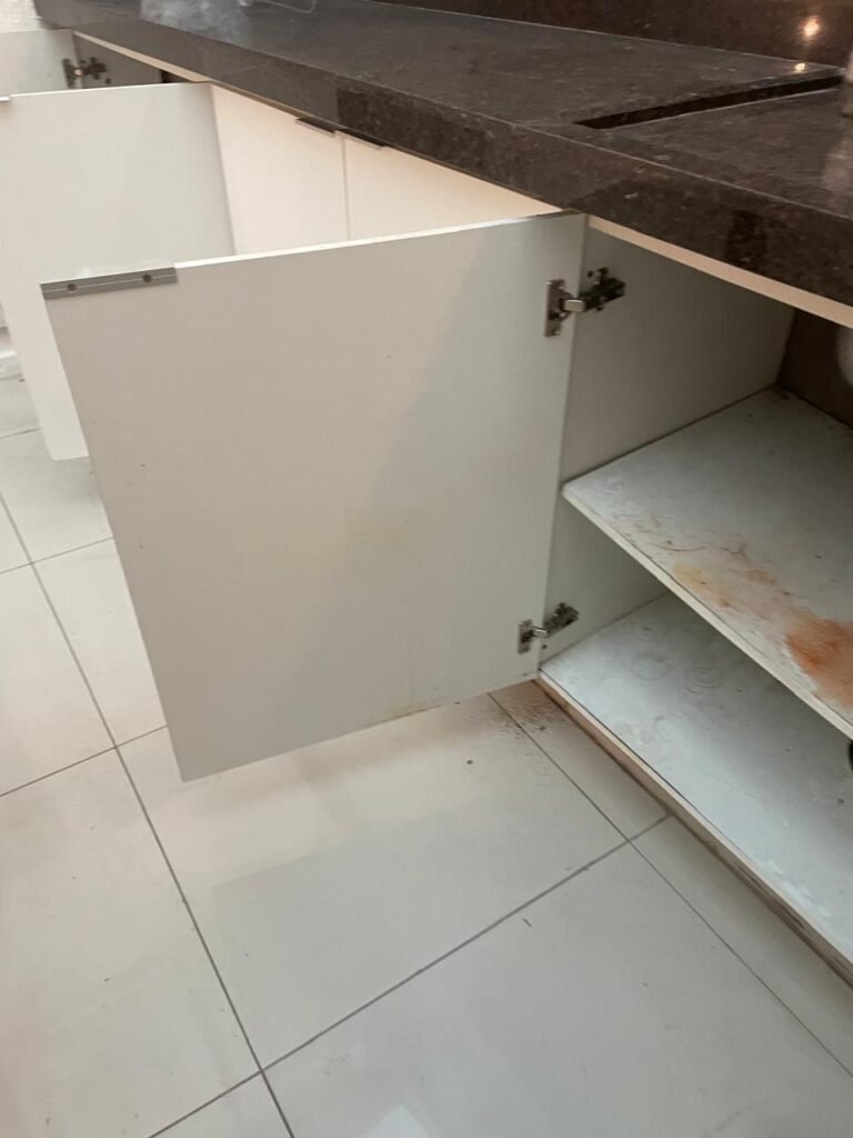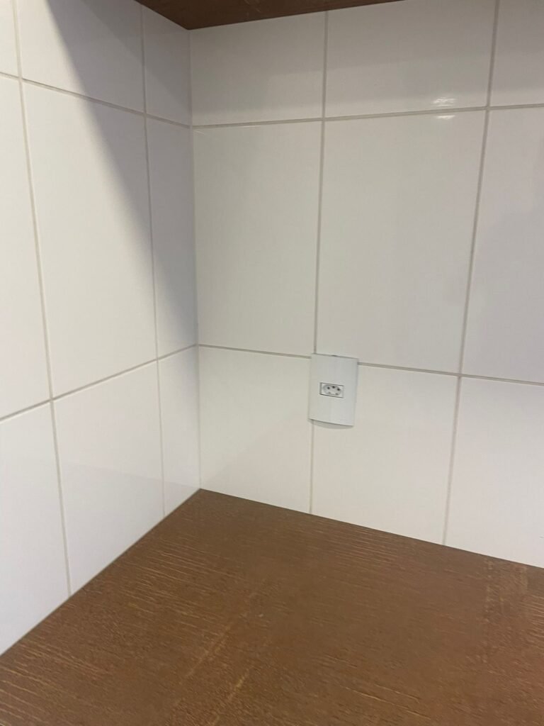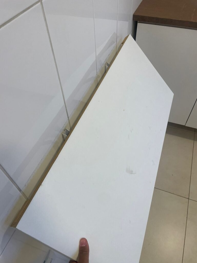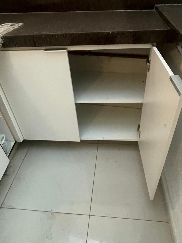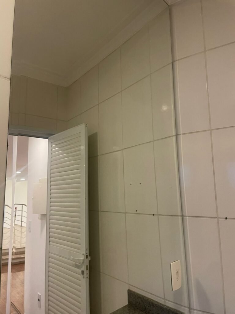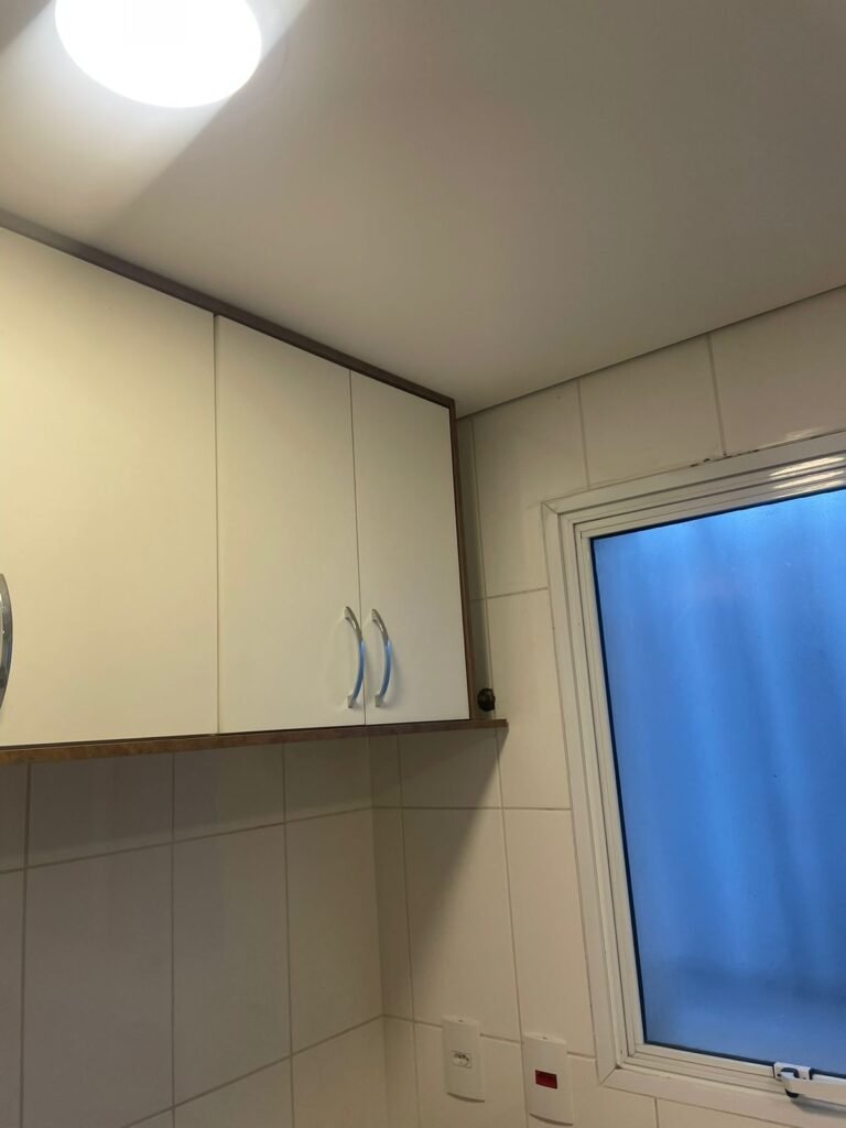 COPA-: 01 porta social de vidro blindex em ordem, com fechadura em ordem, piso revestido de pisos de porcelanato em ordem, paredes revestidas até o teto de azulejos em ordem, 01 bancada dobrável de mdf em ordem, 01 interruptor em ordem, 05 tomadas (01 delas 220v, restante 110v ) e 01 espelho cego, gabinete de mdf em L com 03 portas, 01 porta está sem puxador, móvel com desgastes naturais e restante em ordem, pia com pedra de granito em ordem, buraco para instalação de cooktop, cuba de inox em ordem, gabinete de mdf com 04 portas, todas com puxador embutido em ordem, 03 vitrôs basculantes com esquadrias de alumínio na cor branco em ordem, com 01 fechadura cada em ordem, e 01 folhas de acrílico em ordem, 01 gabinete suspenso de mdf com 06 portas, todas com puxadores em ordem e 02 delas com pistões pneumáticos, teto com forro de gesso em ordem e com pintura na cor branco neve em ordem, luminárias embutidas com leds em ordem.