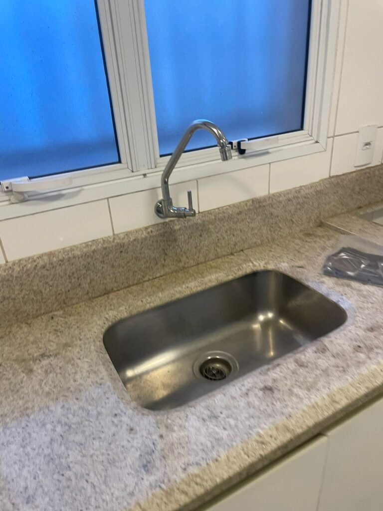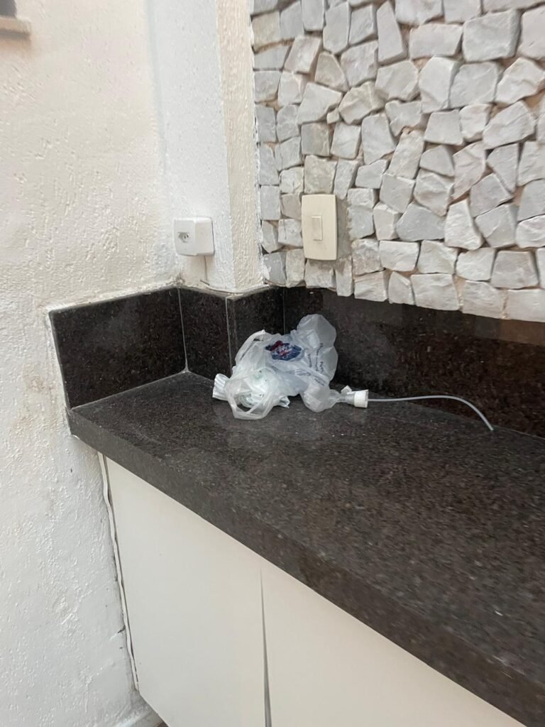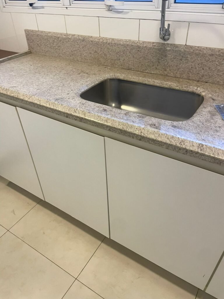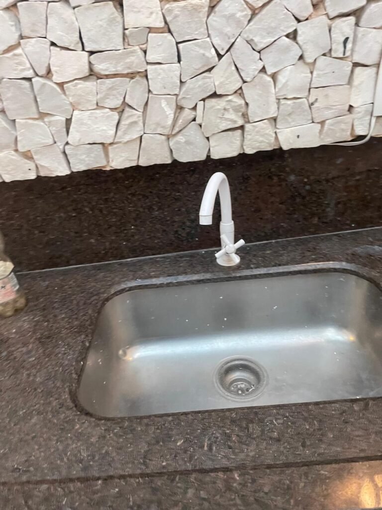 COZINHA-: Piso de porcelanato com desgastes natural e restante em ordem, 01 ralo de inox em ordem, balcão e pia revestido de granito cor marrom em ordem, gabinetes embutidos de MDF com 08 portas e com puxadores em ordem, com alguns armários estufados e desgastes naturais, Cuba de inox em ordem, 01 torneira de plástico branco não testada, 02 interruptores, 04 tomadas não testadas, paredes com grafiato e com pintura na cor branco neve, com buracos com pregos, manchas e desgastes naturais, 02 arandelas ambas com Led em ordem, teto revestido com folhas de vidro Blindex com insufilme com desgastes naturais e partes descascando.