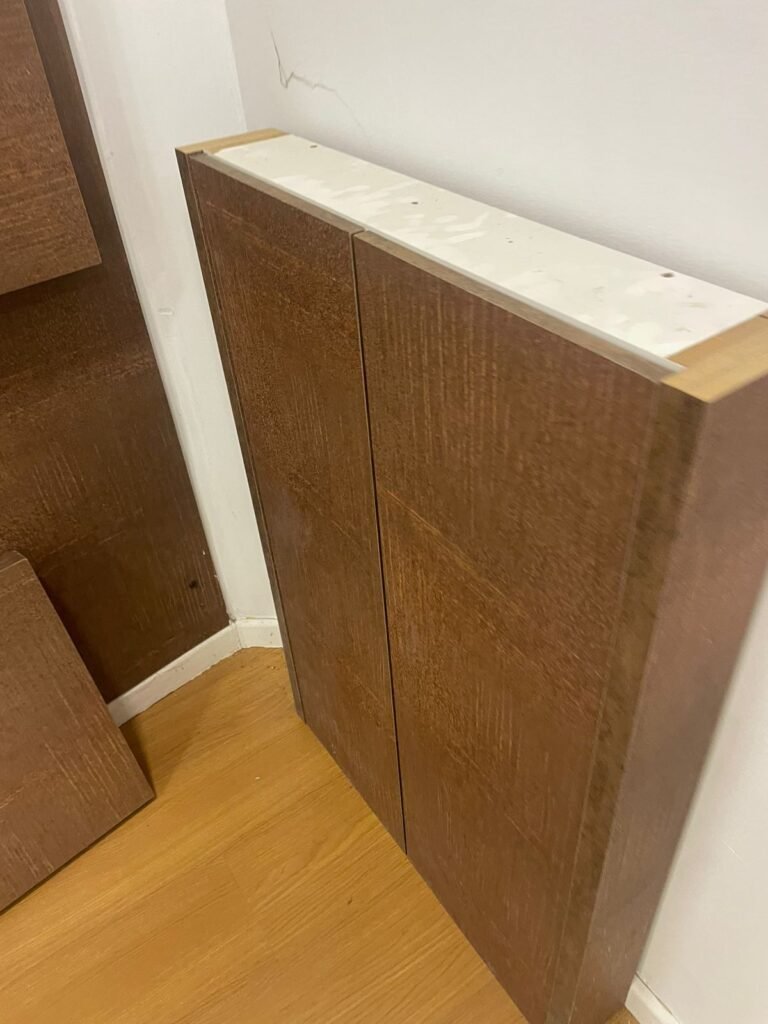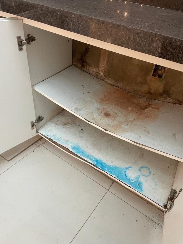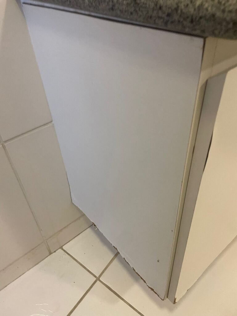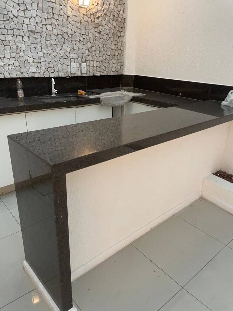 COZINHA-: Piso de porcelanato com desgastes natural e restante em ordem, 01 ralo de inox em ordem, balcão e pia revestido de granito cor marrom em ordem, gabinetes embutidos de MDF com 08 portas e com puxadores em ordem, com alguns armários estufados e desgastes naturais, Cuba de inox em ordem, 01 torneira de plástico branco não testada, 02 interruptores, 04 tomadas não testadas, paredes com grafiato e com pintura na cor branco neve, com buracos com pregos, manchas e desgastes naturais, 02 arandelas ambas com Led em ordem, teto revestido com folhas de vidro Blindex com insufilme com desgastes naturais e partes descascando.