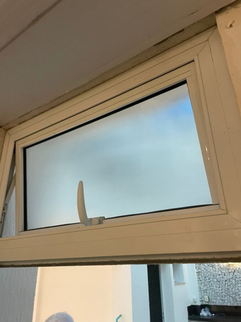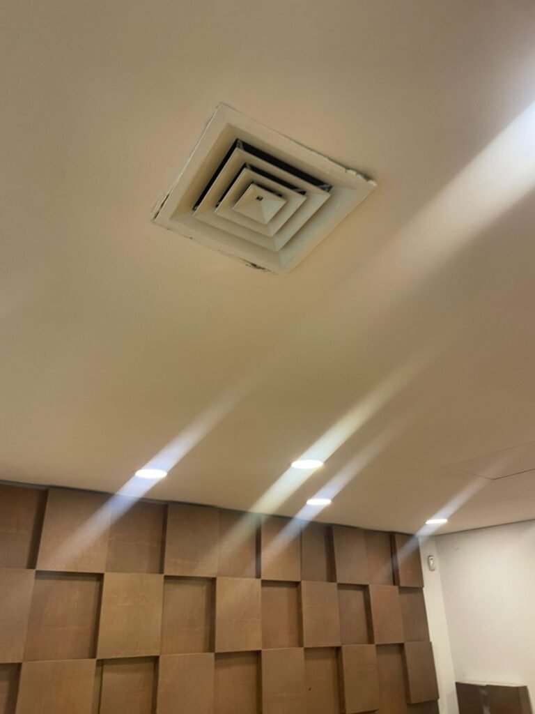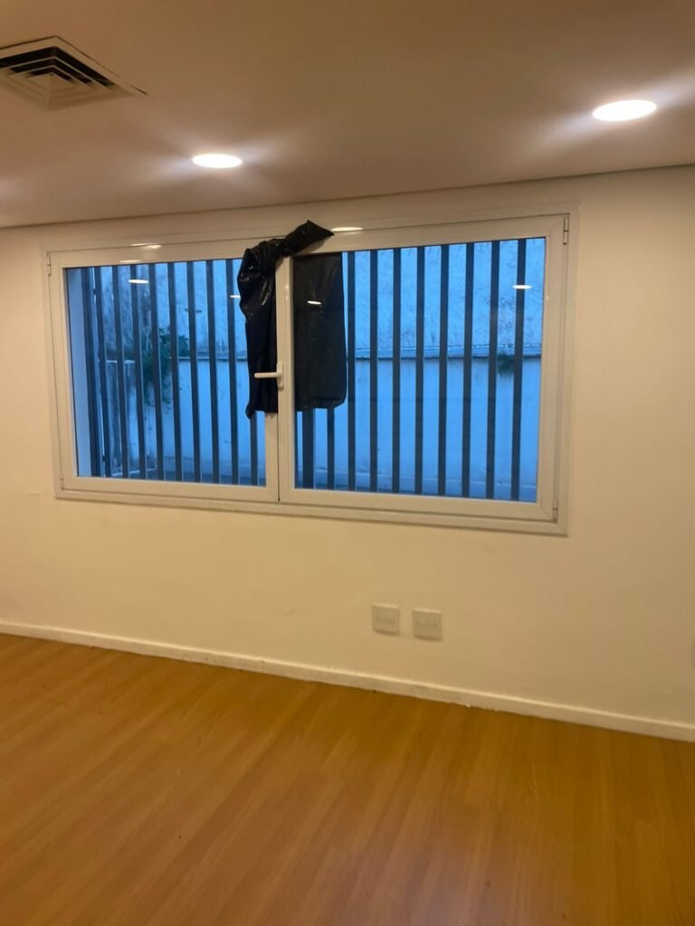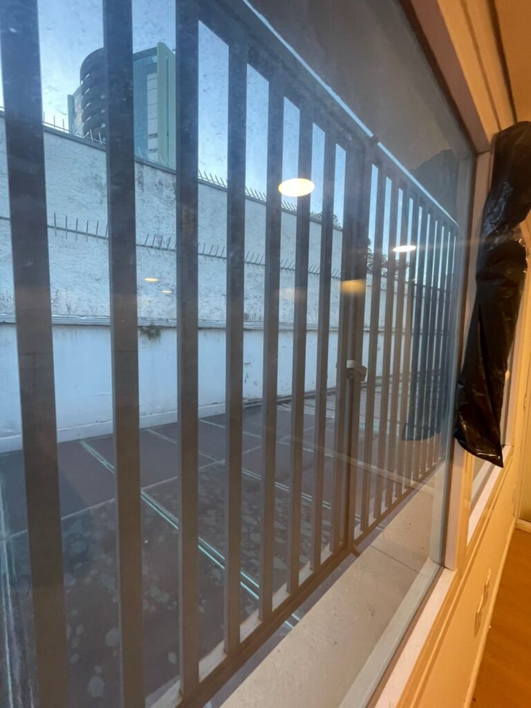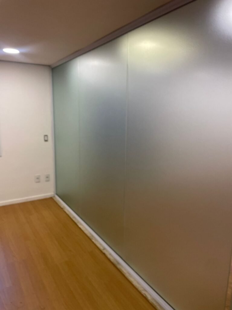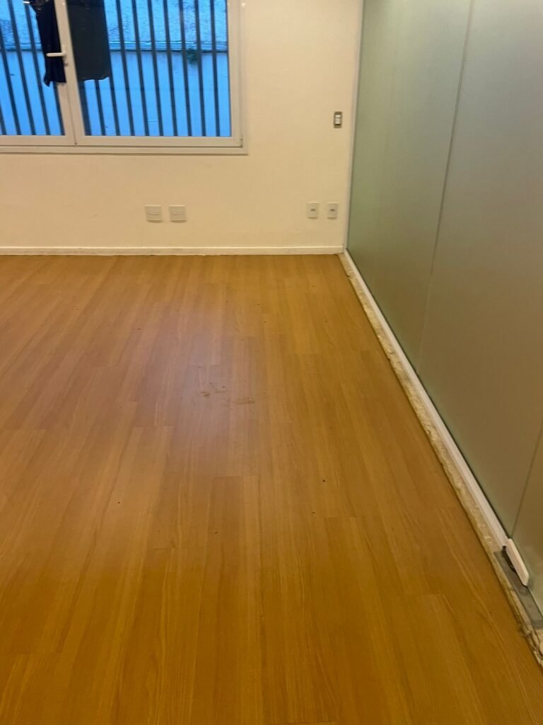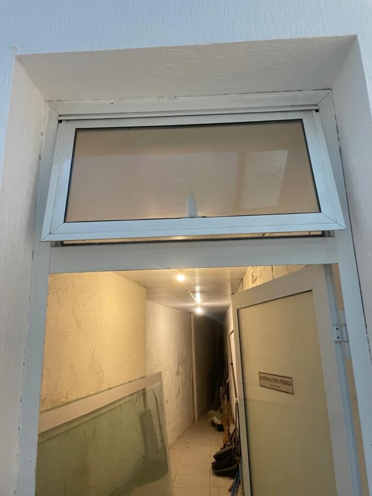 ESCRITÓRIO-: 01 Porta social de vidro temperado em ordem, com 01 fechadura em ordem e com chave, fechadura eletrônica marca Fingerprint não testadas, 08 vidro blindex com insulfilme jateado em ordem, piso revestido em laminado de madeira em ordem, rodapés revestidos de madeira com pintura na cor branco com desgastes naturais e restante em ordem, paredes com pintura na cor branco neve com manchas e desgastes naturais, 01 janela basculante com esquadrias de alumínio na cor branco, com 01 fechadura em ordem, com 02 folhas de vidro blindex em ordem, grade de proteção de ferro em ordem com 01 fechadura com cadeado em ordem, parede com revestimento em MDF em ordem, 01 gabinete de MDF com 04 gavetas em ordem e 02 portas, ambos com puxadores em ordem, 01 porta chaves de Mdf em ordem, 02 interruptores, 02 tomadas, 04 espelho cegos, 01 câmera não testada, 10 luminárias embutidas todas com Led em ordem, 02 trocador de ar não testados, 01 entrada para alçapão.
