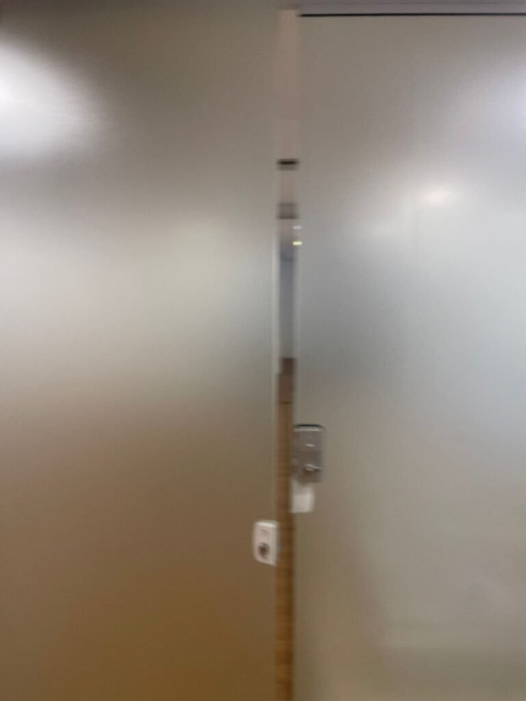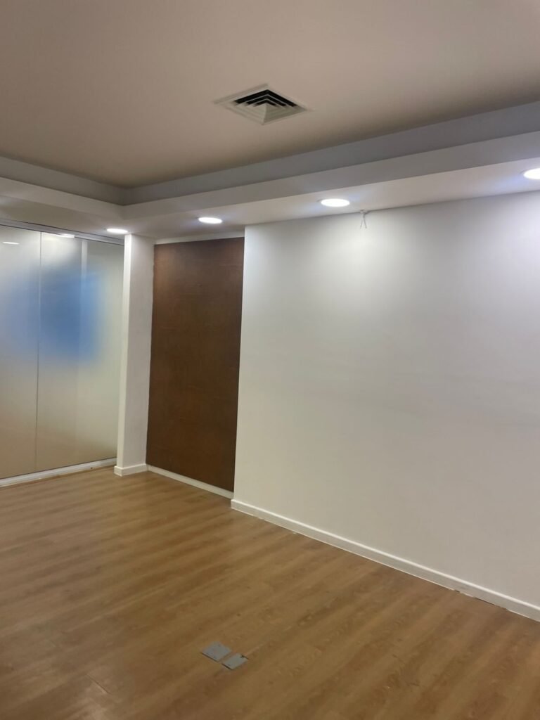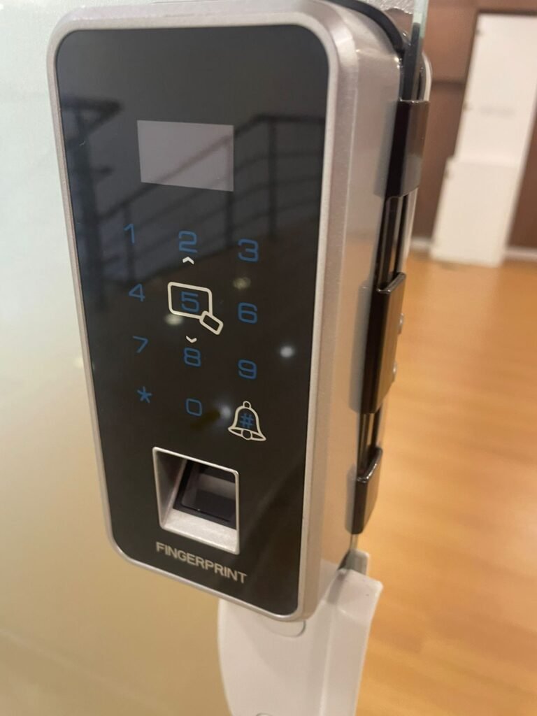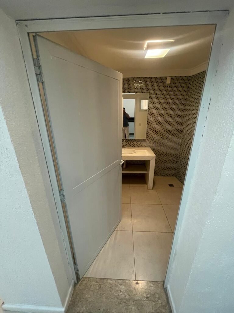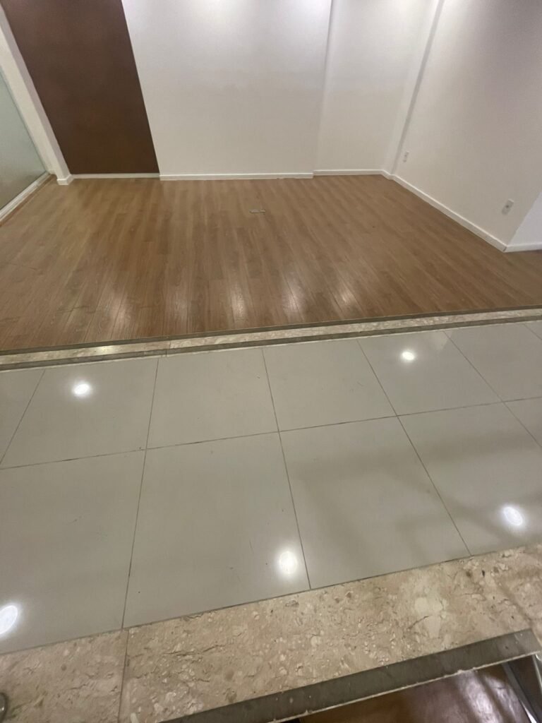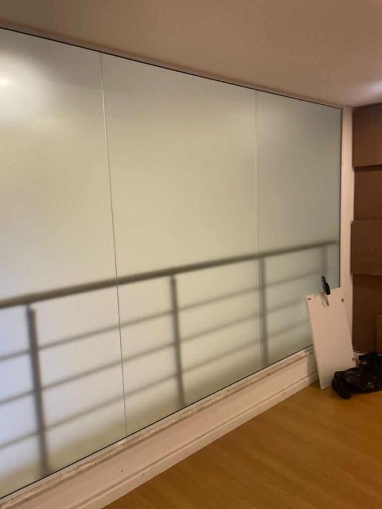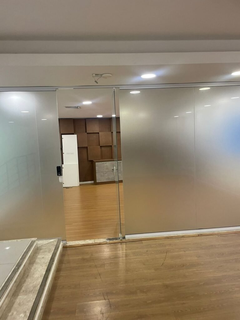 ESCRITÓRIO-: 01 Porta social de vidro temperado em ordem, com 01 fechadura em ordem e com chave, fechadura eletrônica marca Fingerprint não testadas, 08 vidro blindex com insulfilme jateado em ordem, piso revestido em laminado de madeira em ordem, rodapés revestidos de madeira com pintura na cor branco com desgastes naturais e restante em ordem, paredes com pintura na cor branco neve com manchas e desgastes naturais, 01 janela basculante com esquadrias de alumínio na cor branco, com 01 fechadura em ordem, com 02 folhas de vidro blindex em ordem, grade de proteção de ferro em ordem com 01 fechadura com cadeado em ordem, parede com revestimento em MDF em ordem, 01 gabinete de MDF com 04 gavetas em ordem e 02 portas, ambos com puxadores em ordem, 01 porta chaves de Mdf em ordem, 02 interruptores, 02 tomadas, 04 espelho cegos, 01 câmera não testada, 10 luminárias embutidas todas com Led em ordem, 02 trocador de ar não testados, 01 entrada para alçapão.