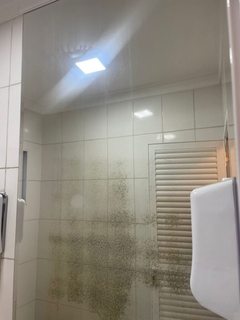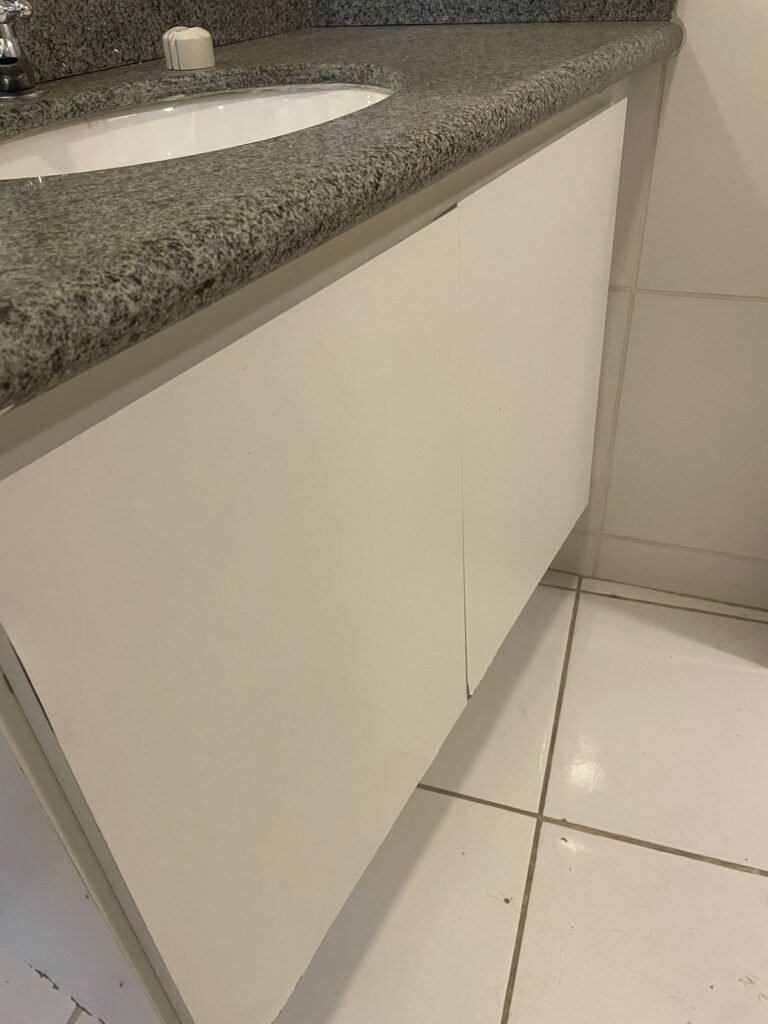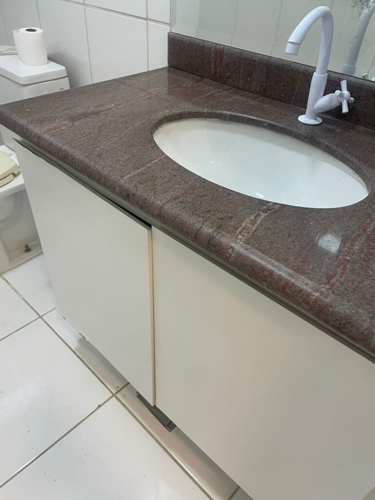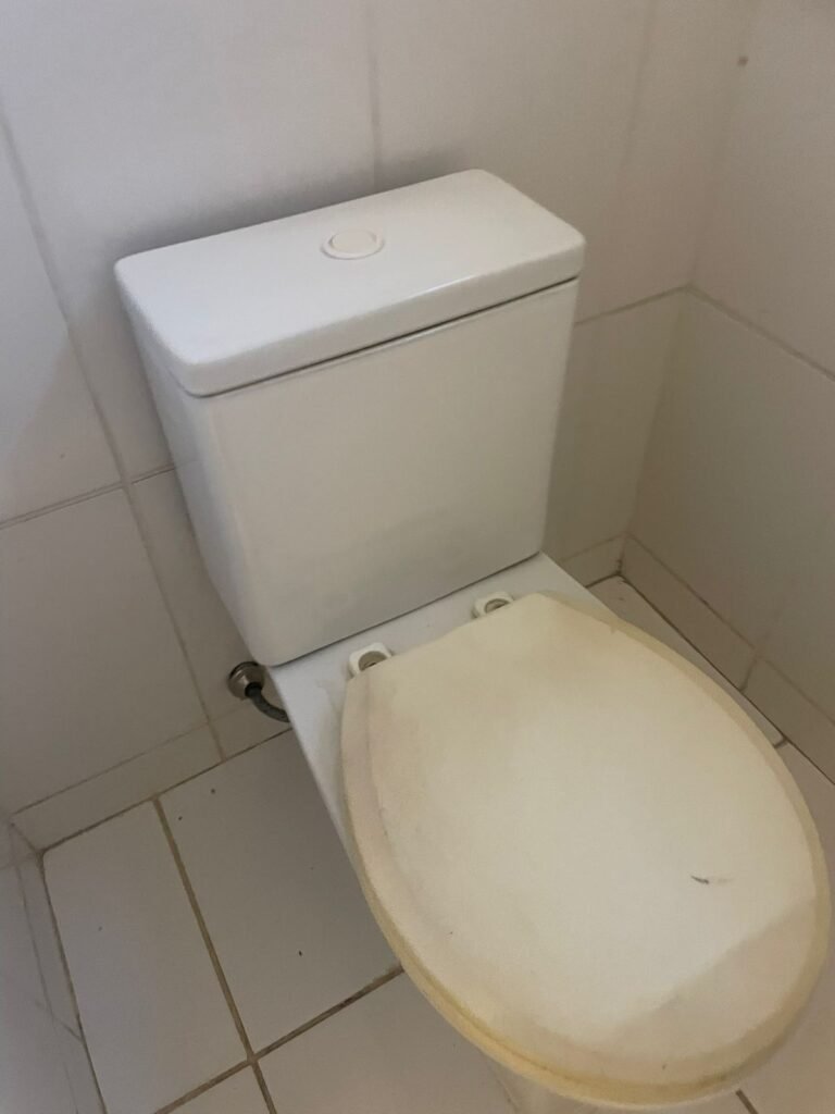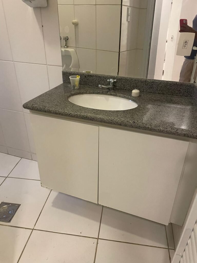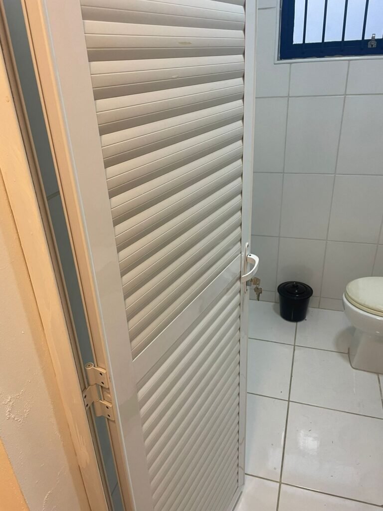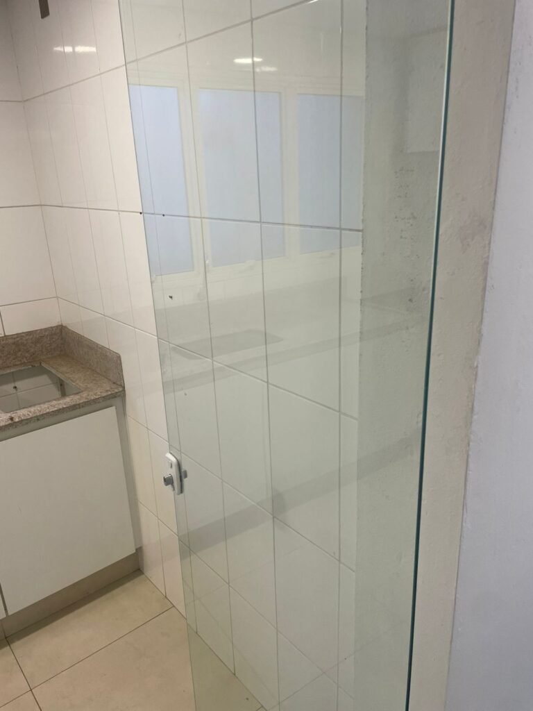 WC 01-: 01 Porta de alumínio cor branco marca Lidinese, com maçaneta danificada, fechadura e chave em ordem, pisos de Porcelanato em ordem, 01 ralo de inox em ordem, 02 paredes revestidas de pastilha de vidro em ordem, restante das paredes com pintura na cor branco neve com manchas de infiltrações e restante em ordem, conjunto sanitário de cerâmica com desgastes naturais, tampa e acento em ordem, e descarga em ordem, pia em granito cor branco em ordem, Cuba de cerâmica marca Lorenzetti com desgastes naturais e restante em ordem, 01 torneira de inox não testada, 01 espelho de reflexo em ordem, 01 suporte de papel em ordem, 02 interruptores sendo que 01 deles está danificado, 01 tomada em ordem, 01 espelho cego, 01 canopla do chuveiro em inox em ordem, teto com gola de gesso e pintura na cor branco neve em ordem, 01 luminária de sobrepor com Led em ordem, 01 vitrô basculante com esquadrias de alumínio na cor branco em ordem e com 01 fechadura em ordem e 01folha de vidro acrílico em ordem.