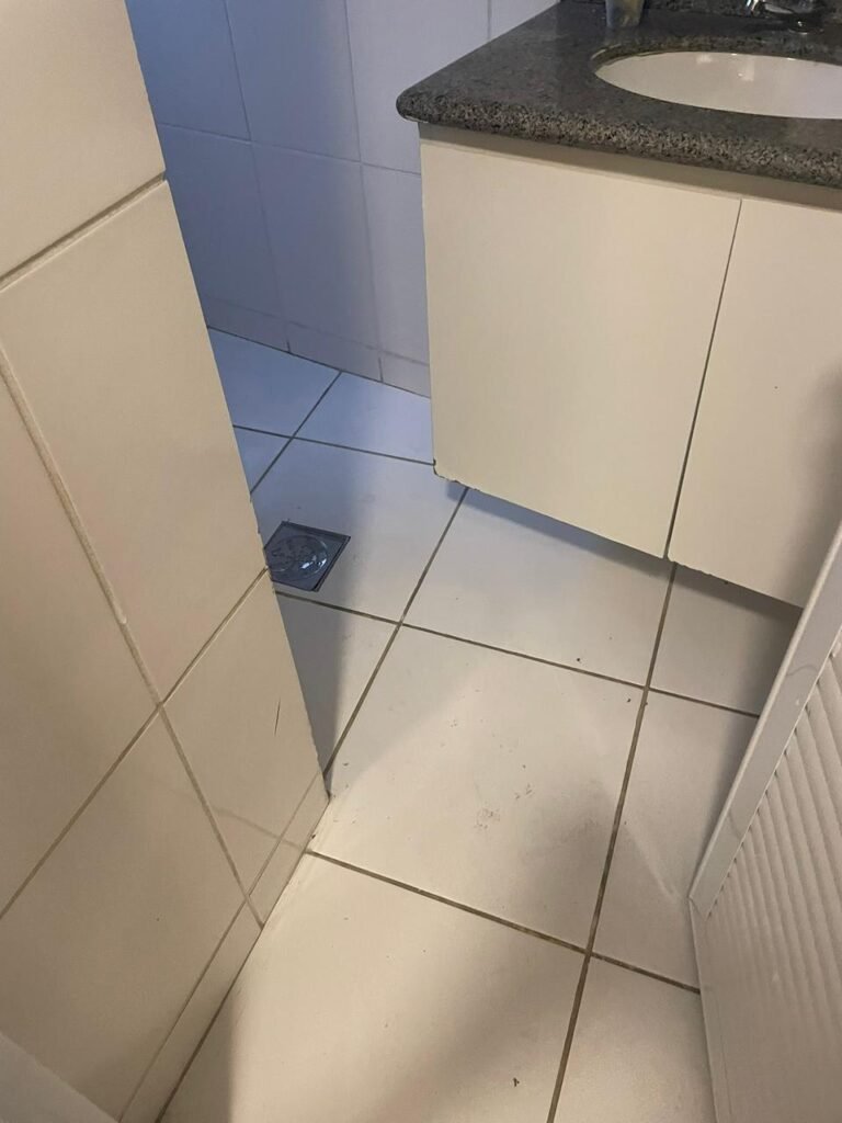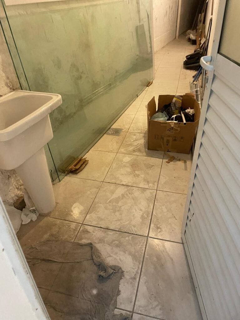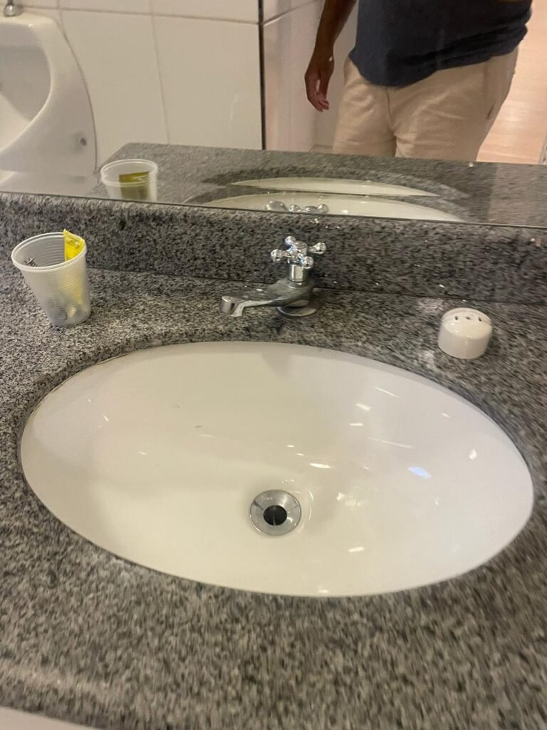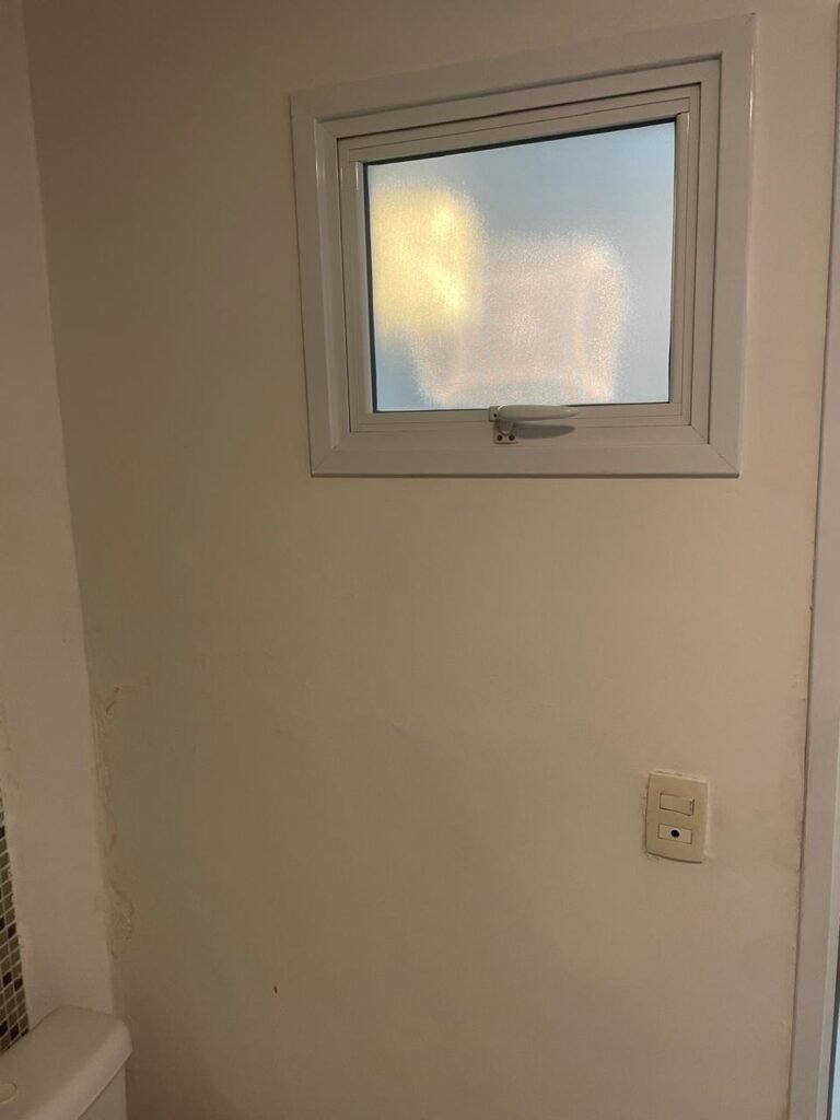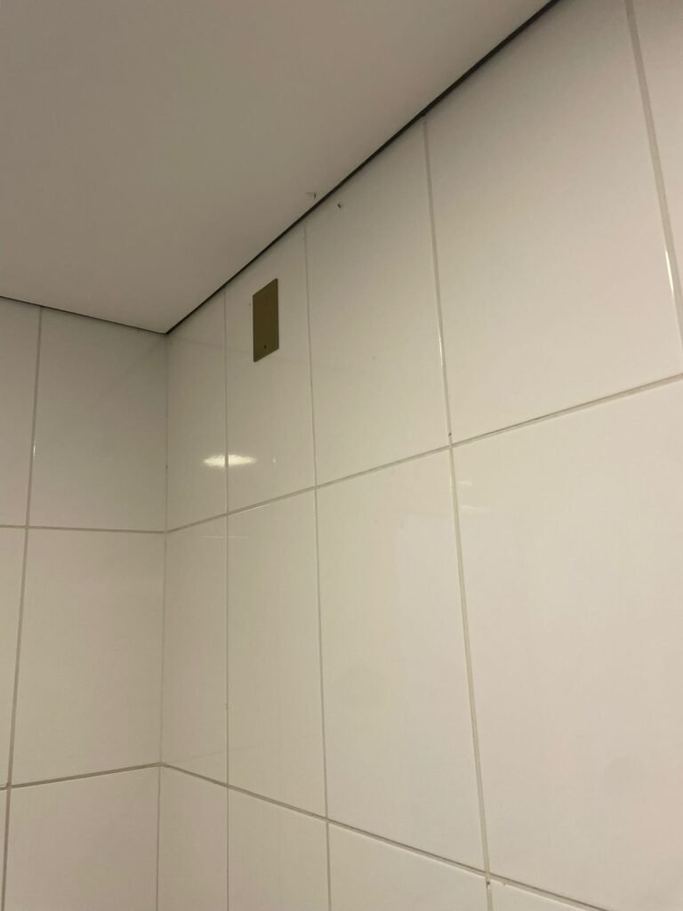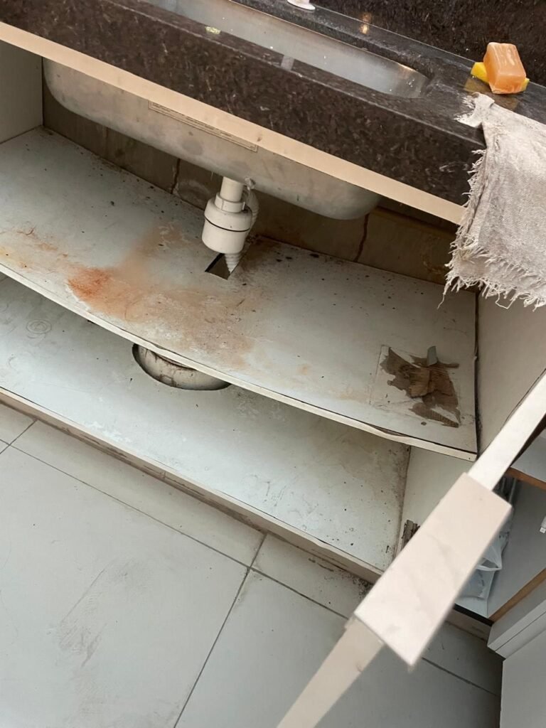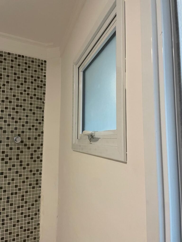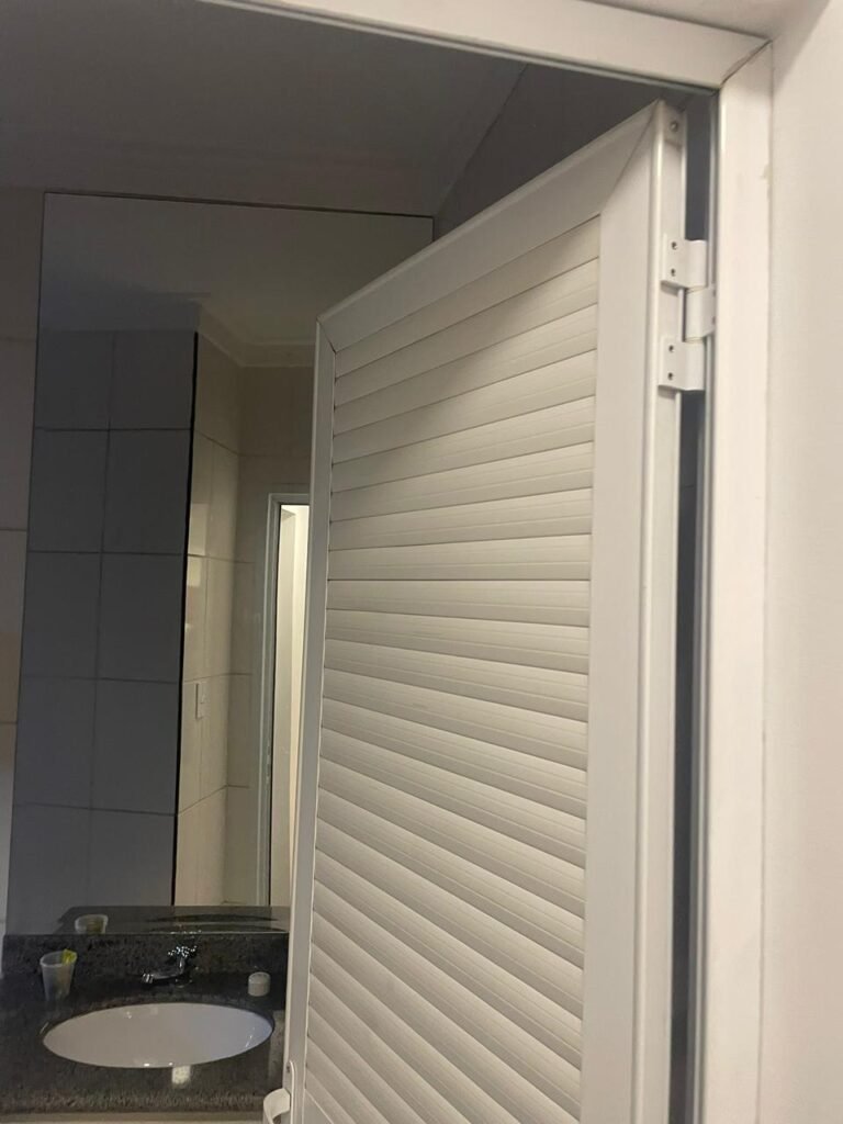 WC 01-: 01 Porta de alumínio cor branco marca Lidinese, com maçaneta danificada, fechadura e chave em ordem, pisos de Porcelanato em ordem, 01 ralo de inox em ordem, 02 paredes revestidas de pastilha de vidro em ordem, restante das paredes com pintura na cor branco neve com manchas de infiltrações e restante em ordem, conjunto sanitário de cerâmica com desgastes naturais, tampa e acento em ordem, e descarga em ordem, pia em granito cor branco em ordem, Cuba de cerâmica marca Lorenzetti com desgastes naturais e restante em ordem, 01 torneira de inox não testada, 01 espelho de reflexo em ordem, 01 suporte de papel em ordem, 02 interruptores sendo que 01 deles está danificado, 01 tomada em ordem, 01 espelho cego, 01 canopla do chuveiro em inox em ordem, teto com gola de gesso e pintura na cor branco neve em ordem, 01 luminária de sobrepor com Led em ordem, 01 vitrô basculante com esquadrias de alumínio na cor branco em ordem e com 01 fechadura em ordem e 01folha de vidro acrílico em ordem.