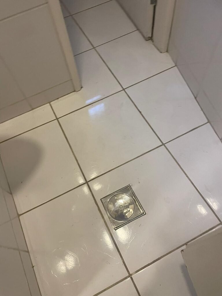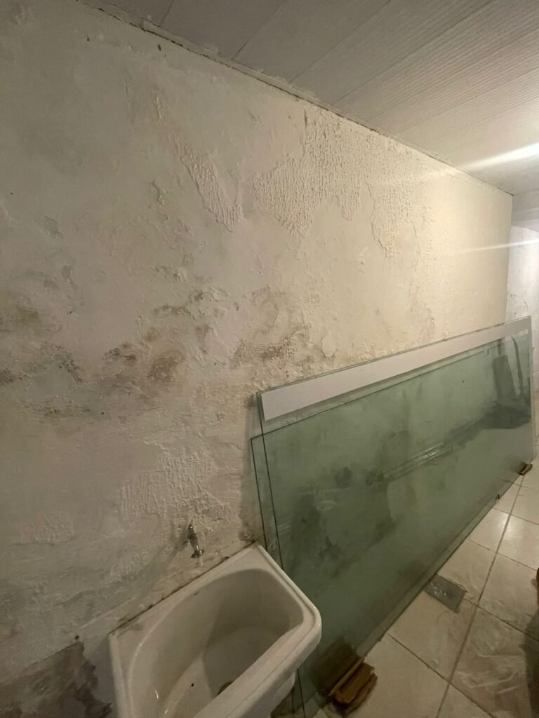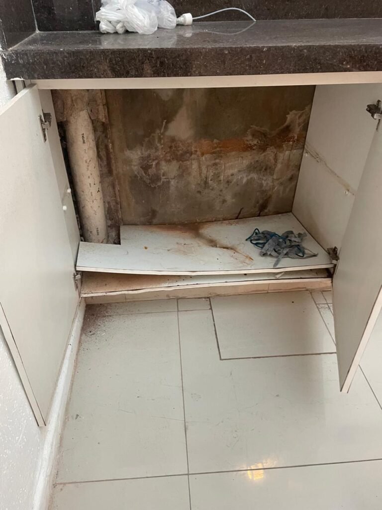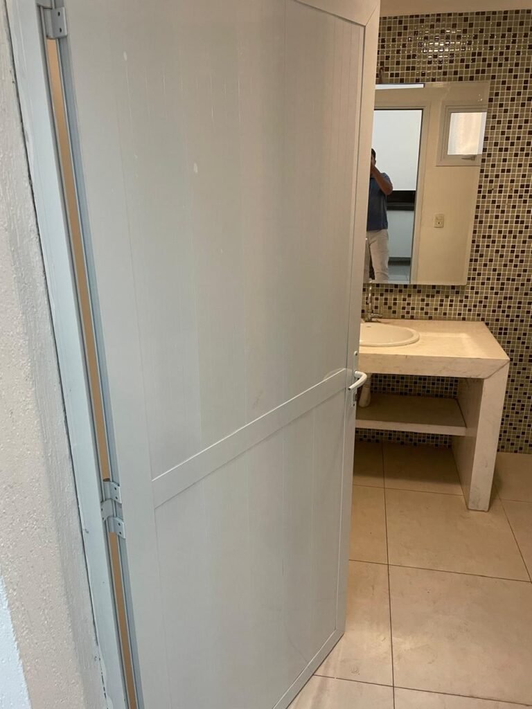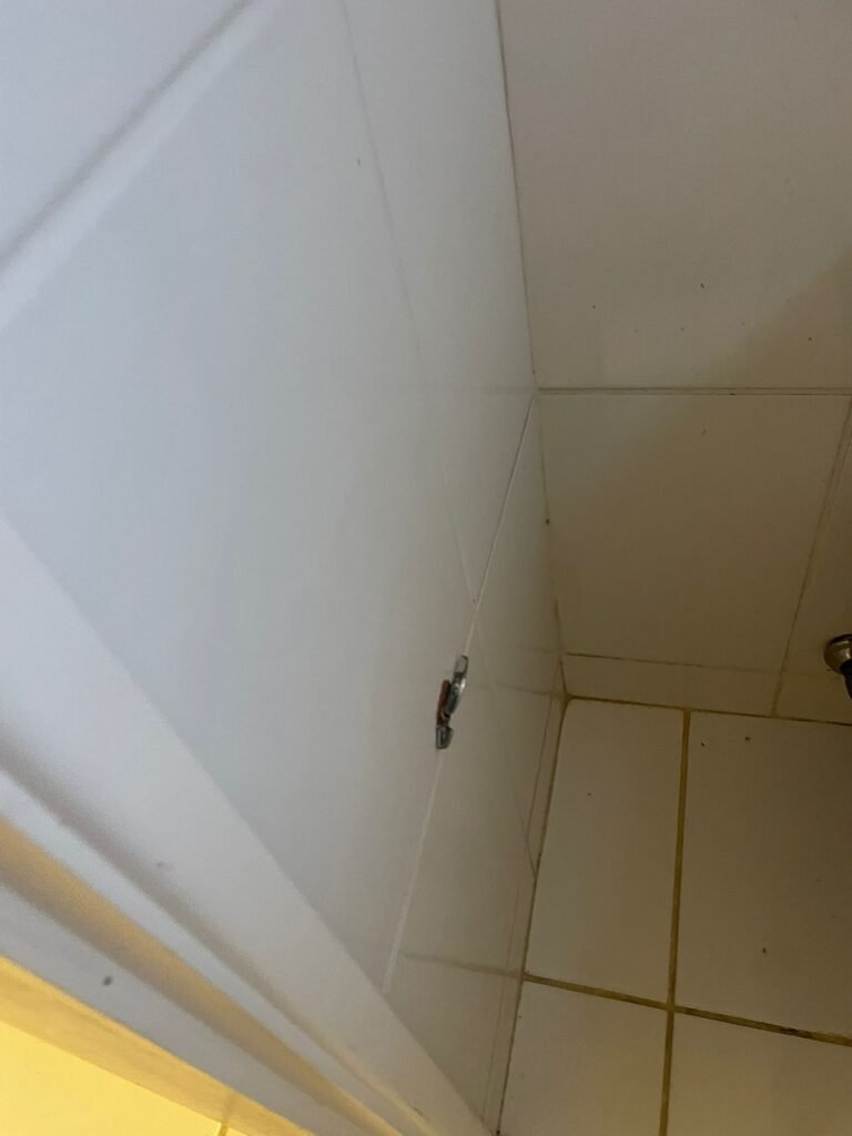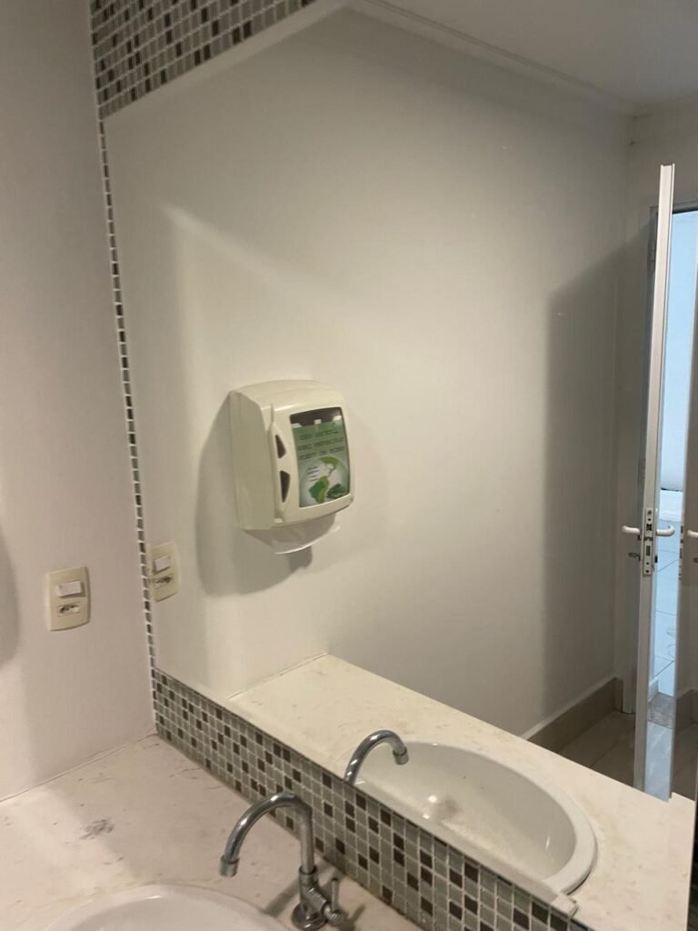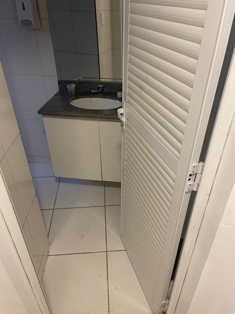 WC 01-: 01 Porta de alumínio cor branco marca Lidinese, com maçaneta danificada, fechadura e chave em ordem, pisos de Porcelanato em ordem, 01 ralo de inox em ordem, 02 paredes revestidas de pastilha de vidro em ordem, restante das paredes com pintura na cor branco neve com manchas de infiltrações e restante em ordem, conjunto sanitário de cerâmica com desgastes naturais, tampa e acento em ordem, e descarga em ordem, pia em granito cor branco em ordem, Cuba de cerâmica marca Lorenzetti com desgastes naturais e restante em ordem, 01 torneira de inox não testada, 01 espelho de reflexo em ordem, 01 suporte de papel em ordem, 02 interruptores sendo que 01 deles está danificado, 01 tomada em ordem, 01 espelho cego, 01 canopla do chuveiro em inox em ordem, teto com gola de gesso e pintura na cor branco neve em ordem, 01 luminária de sobrepor com Led em ordem, 01 vitrô basculante com esquadrias de alumínio na cor branco em ordem e com 01 fechadura em ordem e 01folha de vidro acrílico em ordem.