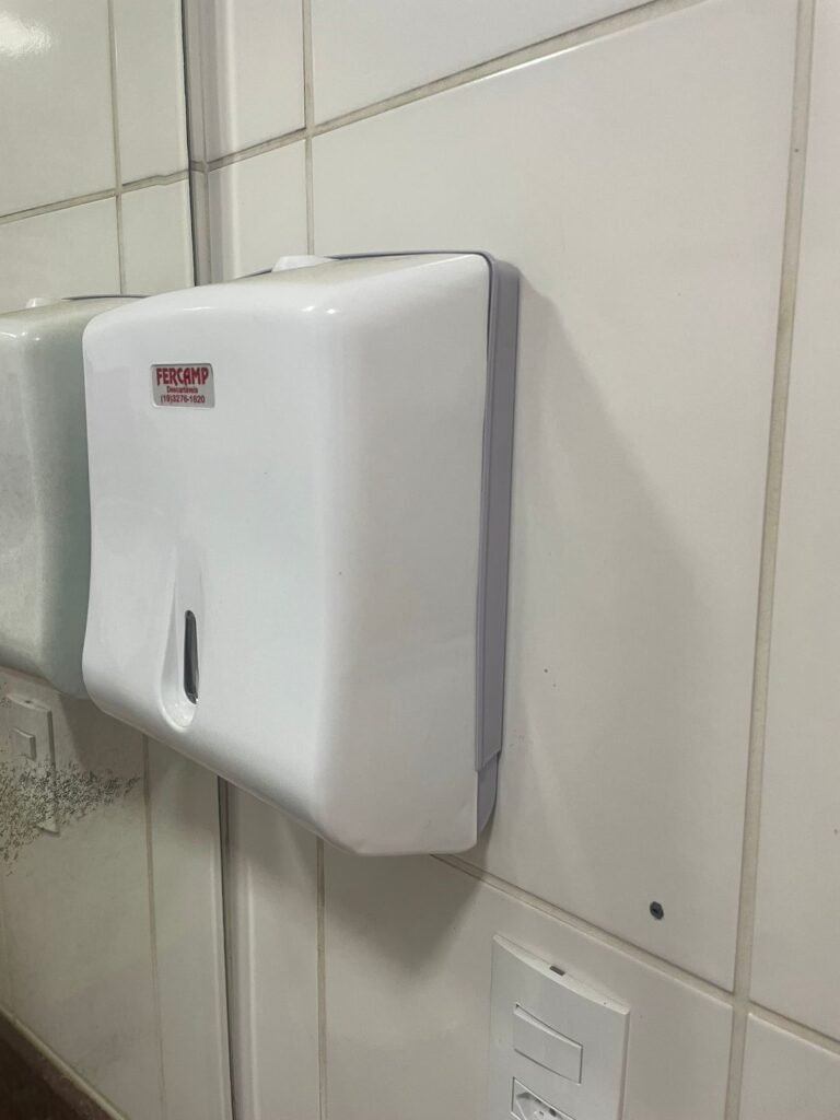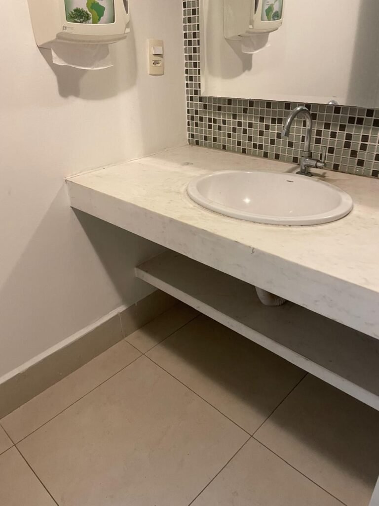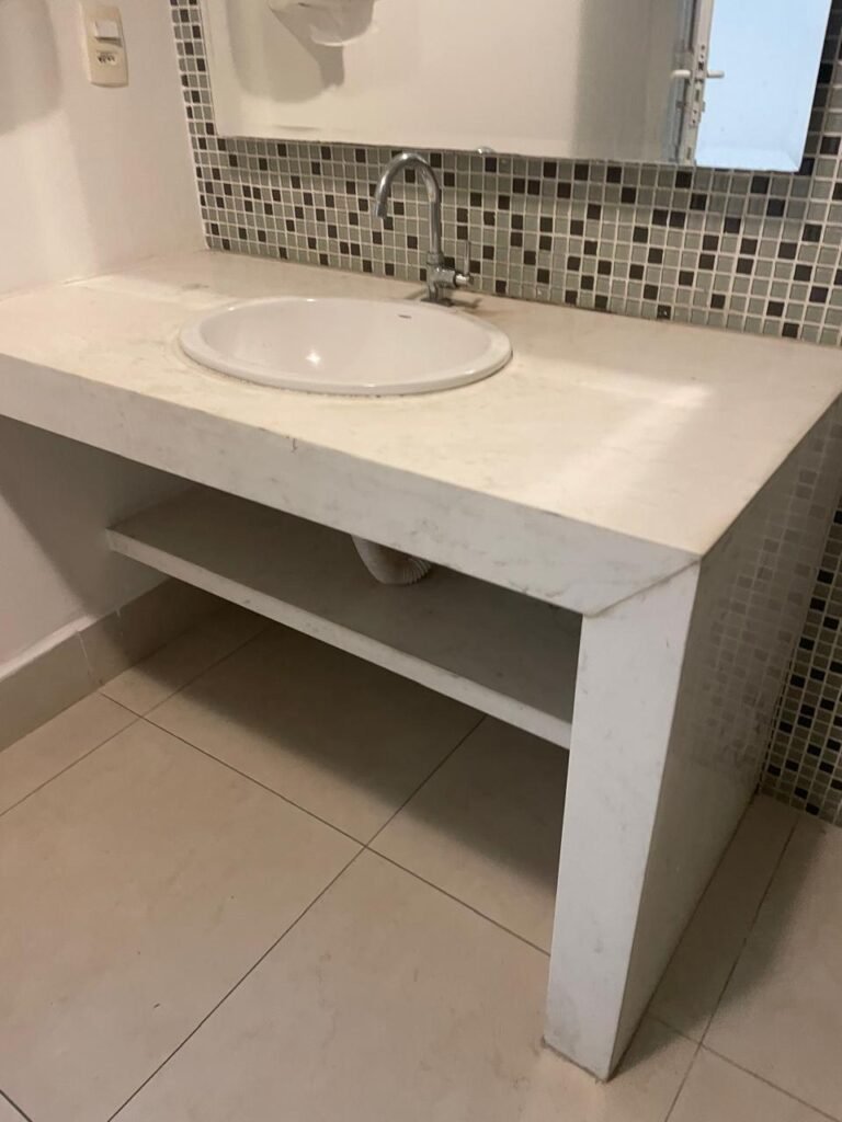 WC SUPERIOR 01-: 01 Porta de alumínio na cor branco em ordem, com maçaneta em ordem, com fechadura em ordem e com chave, piso revestido de pisos frios cerâmicos em ordem, 01 ralo de inox solto, paredes revestidas de azulejos até o teto, com buracos com buchas e restante em ordem, 01 interruptor em ordem, 01 tomada não testada, 01 suporte de sabonete líquido em ordem, 01 suporte de papel toalha para mão em ordem, 01 conjunto sanitário de cerâmica marca Deca na cor branco em ordem, com válvula de descarga embutida e em ordem, com tampa e acento com desgastes naturais e restante em ordem, 01 pia com pedra de granito em ordem, com 01 cuba de cerâmica cor branco em ordem, 01 torneira de plástica na cor branco não testada, 01 gabinete embutido com 02 portas com desgastes naturais, estufados, saindo lascas e sem puxadores, sifão não testado, 01 espelho de reflexo com manchas de desgastes naturais, 01 vitrô basculante com esquadrias de ferro na cor azul, com fechadura em ordem, com grades de ferro de proteção em ordem e com 01 folha de acrílico em ordem, teto com gola de gesso em ordem e com pintura na cor branco neve em ordem, 01 luminária de sobrepor com led em ordem.