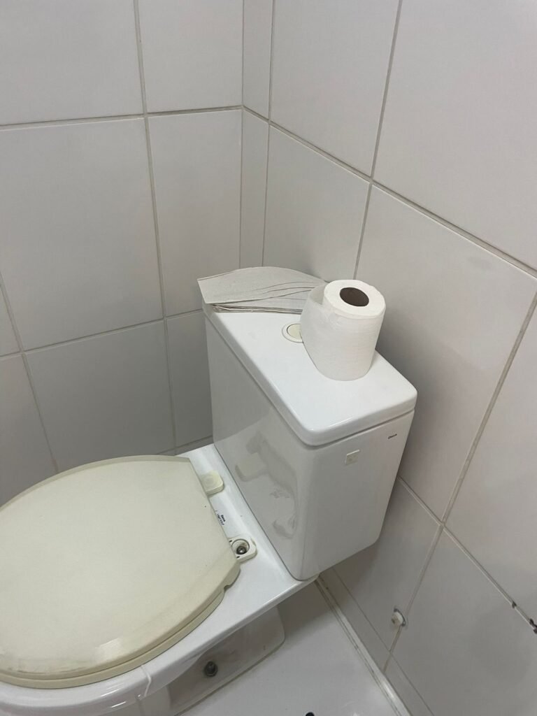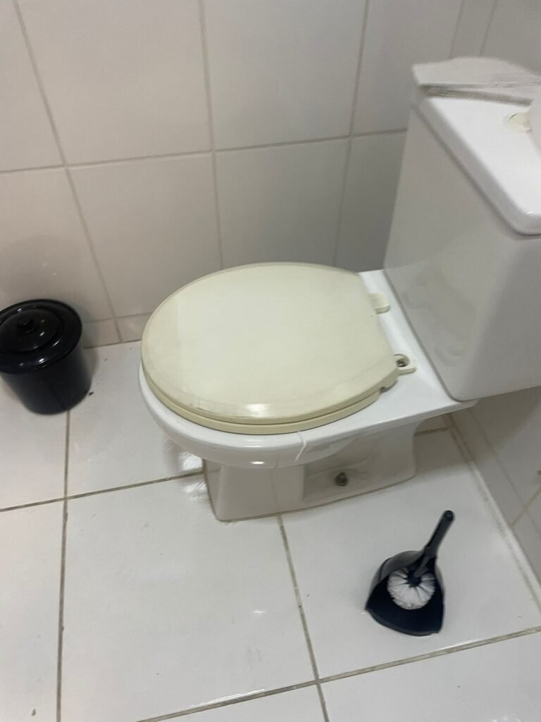 WC SUPERIOR 02-: 01 Porta de alumínio cor branco em ordem, com maçaneta em ordem, com fechadura em ordem e com chave, piso revestido de pisos frios cerâmicos em ordem, 01 ralo de inox solto, paredes revestidas de azulejos até o teto, com buracos com buchas e restante em ordem, 01 interruptor em ordem, 01 suporte de sabonete líquido em ordem, 01 pia com pedra de granito em ordem, com 01 cuba de cerâmica cor branco em ordem, 01 torneira em inox não testada, 01 gabinete embutido com 02 portas com desgastes naturais, estufados, saindo lascas e sem puxadores, sifão não testado, 01 espelho de reflexo em ordem, com 01 tomada embutida não testada, 01 mictório de cerâmica cor branco, marca Incepa com válvula de descarga em ordem, 02 canoplas de registro de água de plástico na cor branco, 01 porta de madeira com pintura na cor branca com desgastes natural e restante em ordem, com maçaneta em inox em ordem, com fechadura em ordem com chave embutida, 01 conjunto sanitário de cerâmica cor branco em ordem, marca Deca, com válvula de descarga embutida e em ordem, com tampa e acento com desgastes naturais, desencaixado, 01 vitrô basculante com esquadrias de ferro na cor azul, com fechadura em ordem, com grades de ferro de proteção em ordem e com 01 folha de acrílico em ordem, teto com gola de gesso em ordem e com pintura na cor branco neve em ordem, 01 luminária de sobrepor com led em ordem.