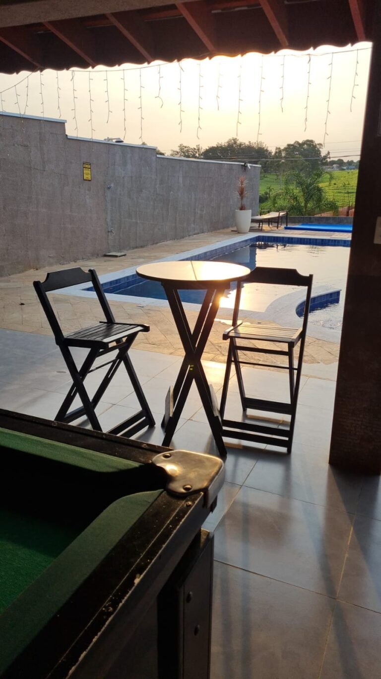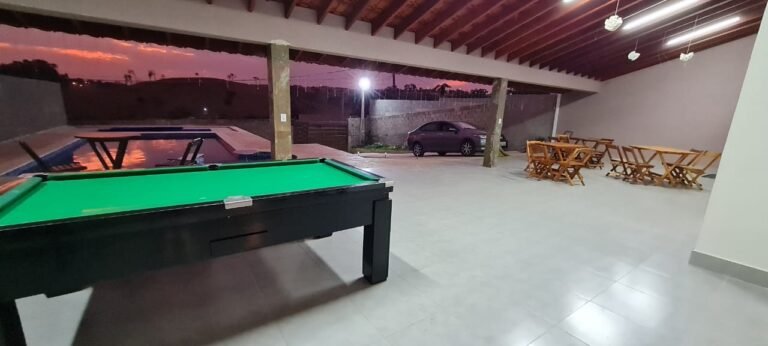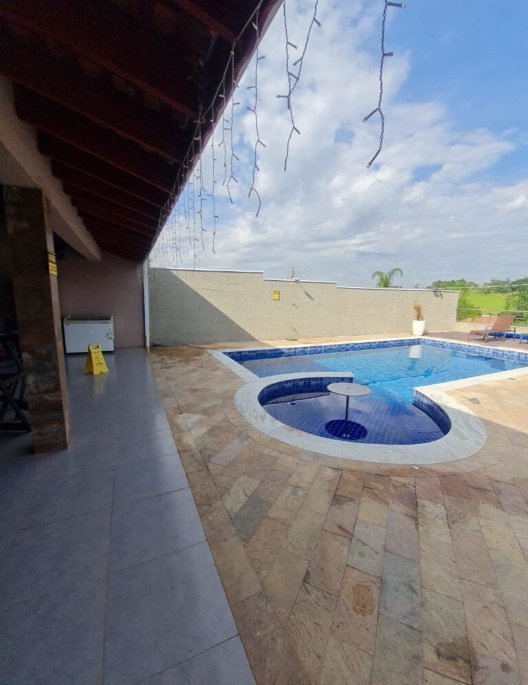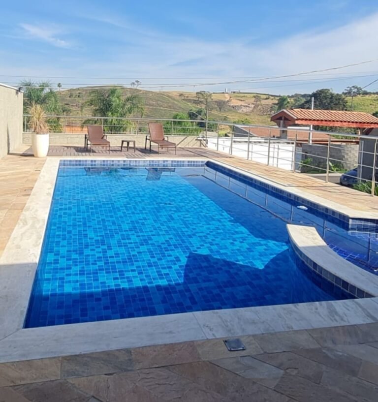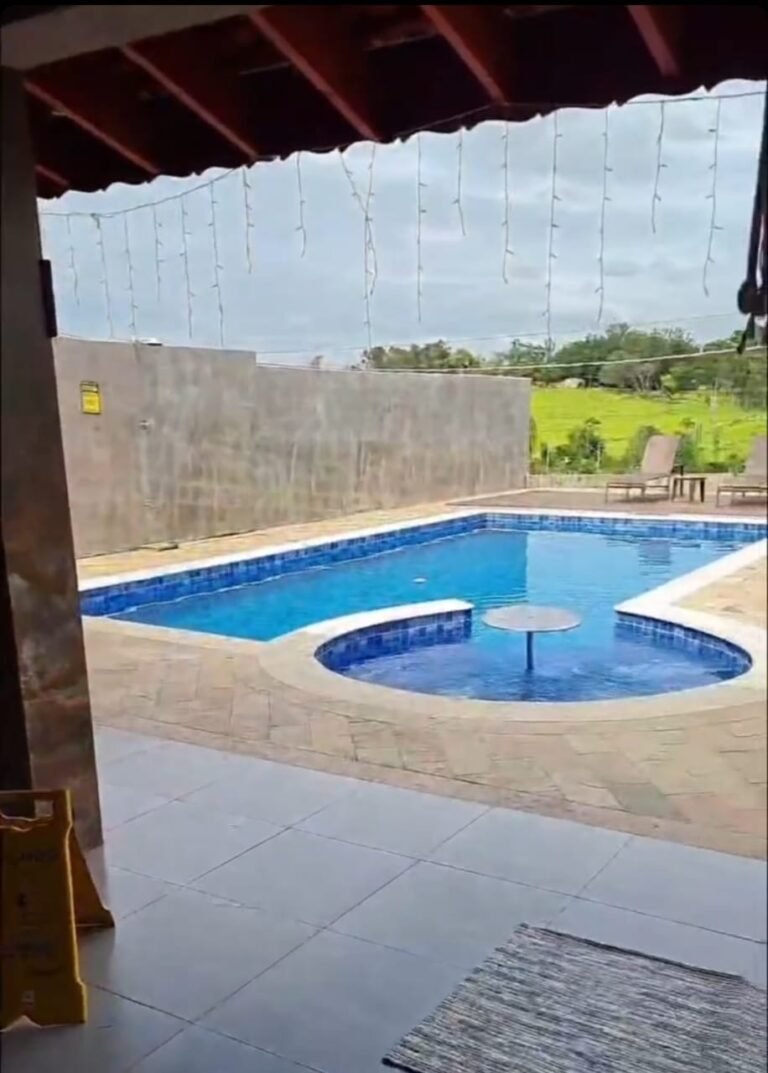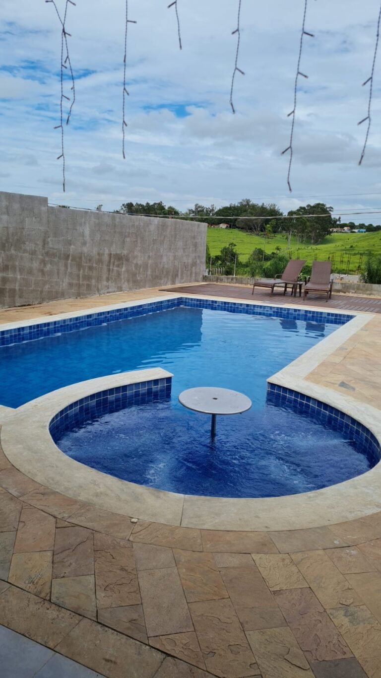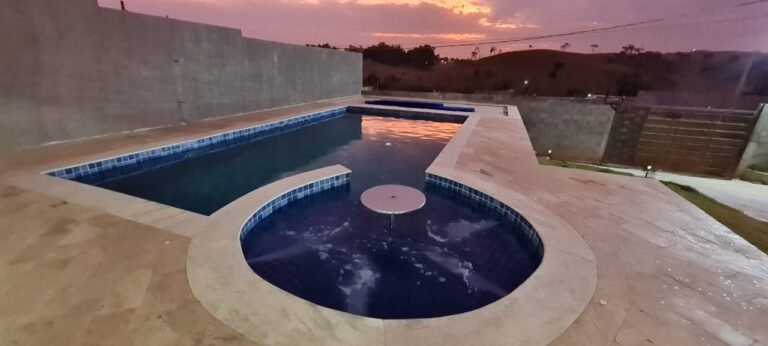 Piscina:-01 piscina de alvenaria na medida 8×4 com spa na medida de 3×3 com a profundidade de 1,5 em ordem, azulejos Noronha mar Mesh azul marca Eliana em ordem, bordas da piscina em mármore branco rustico com acabamento boleado em ordem, 04 ralos de fundo em ordem, 06 refl etores led 9w em ordem, 01 controlador para funcionamento do led em ordem, 03 bicos de hidromassagem em ordem, 12 placas aquecedor solar marca Girassol em ordem, 01 painel controlador Girassol em ordem, 01 bomba natulilus hm 1 cv emordem, 01 bomba Hm de 1cv hidro em ordem, 01 fi ltro Ap 75 c/bomba ¾+ areia Albacete em ordem, 01 skmmer completo em ordem, piso pedra São Tome mesclado em ordem, parede com grafiato em ordem,01 chuveirão de piscina em ordem, 02 Espreguiçadeiras em fi bra sintética cor Carvalho, 28 peças Deckmodular 86×86 IPÊ Texturizado, 01 Mesa de Apoio Plástica redonda Miami 38x45cm, 17 metros de corrião guarda corpo em aço inox recém instalados em ordem,
