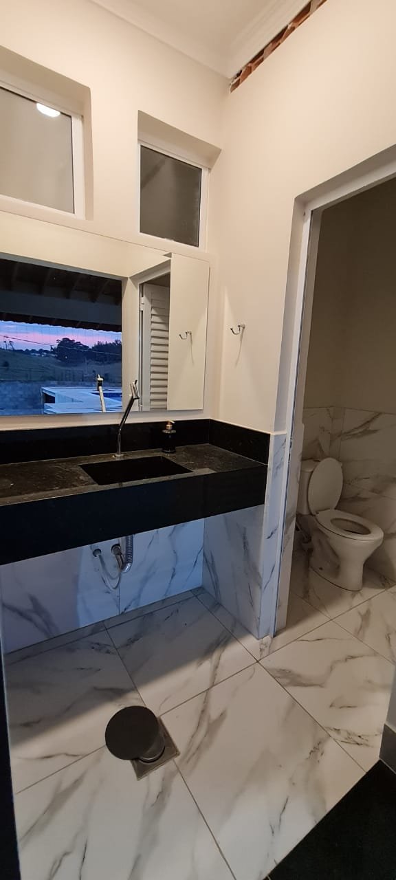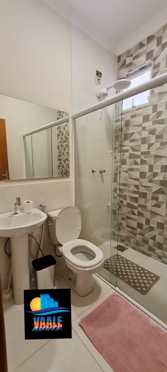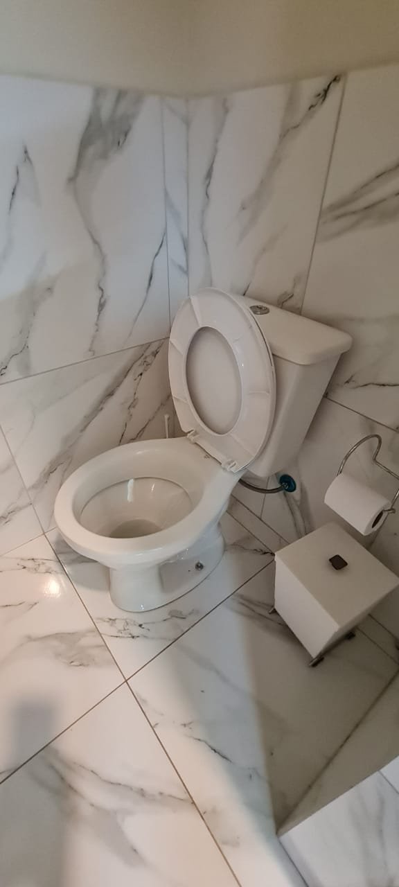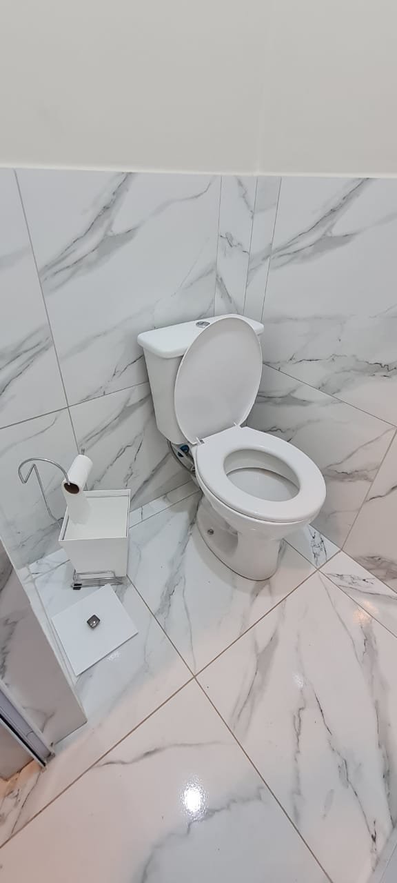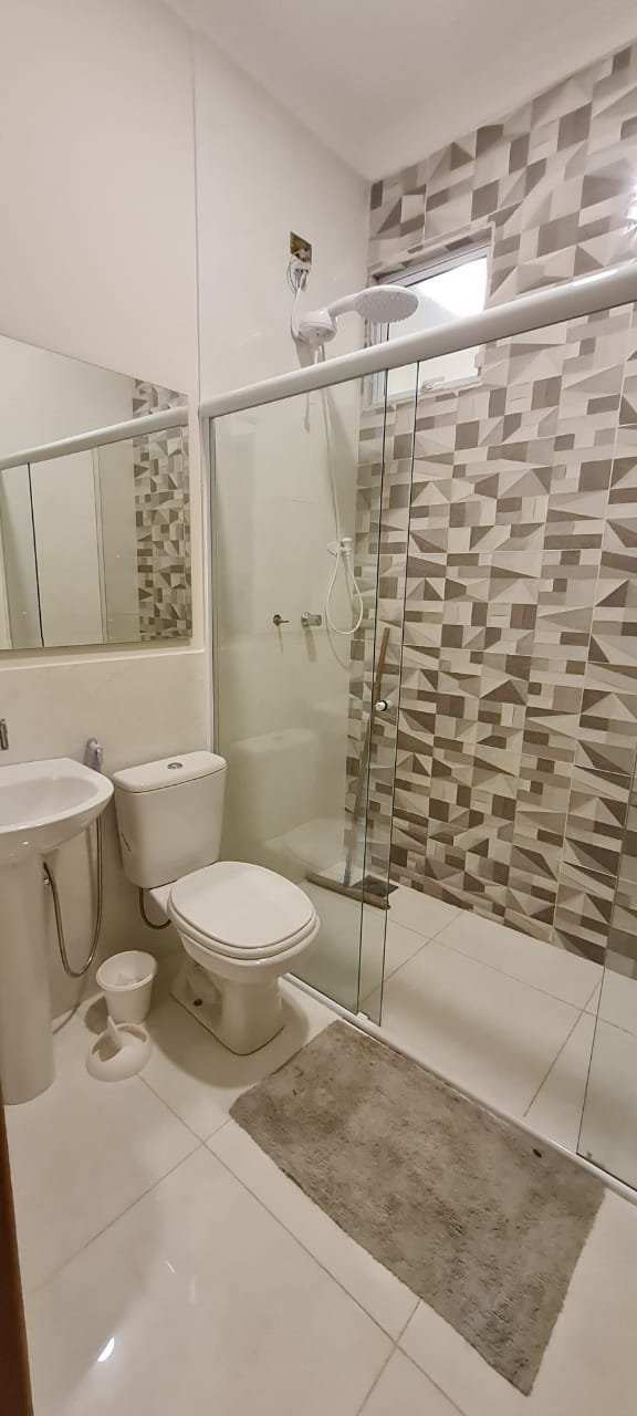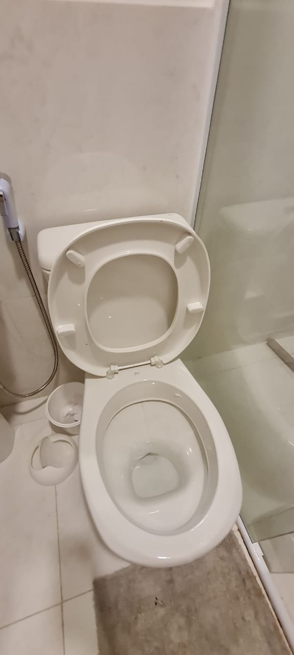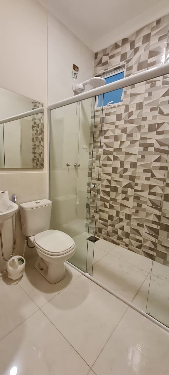 WC interno:- Piso porcelanato em ordem, meia parede com piso porcelanato em ordem, restante da meia parede com a pintura na cor algodão egípcio da marca Suvinil recém-pintado em ordem, parede do box com azulejos 3D em ordem, 01 janela basculante de alumínio escovado com a pintura na cor branco em ordem,01 box blidex de vidro temperado com 03 folhas sendo uma de correr em ordem, 01 kit de vaso sanitário cerâmica branca com caixa acoplada da marca Deca em ordem, uma tampa de vaso de marca Deca em ordem, uma pia com coluna de cerâmica branca em ordem, uma torneira cromada da marca Docol emordem, uma válvula em ordem, um sifão desentupido em ordem, um chuveiro ducha higiênica em ordem, um chuveiro marca Hidra Spacc Power 04 estações 220 v em ordem, 01 canopla em ordem, 01 luminária painelled plafon sobrepor redondo 25 w amarelo em ordem, um ralo de inox desentupido em ordem, 01 espelhocom dois módulos sendo um de luz e outro energia em ordem.