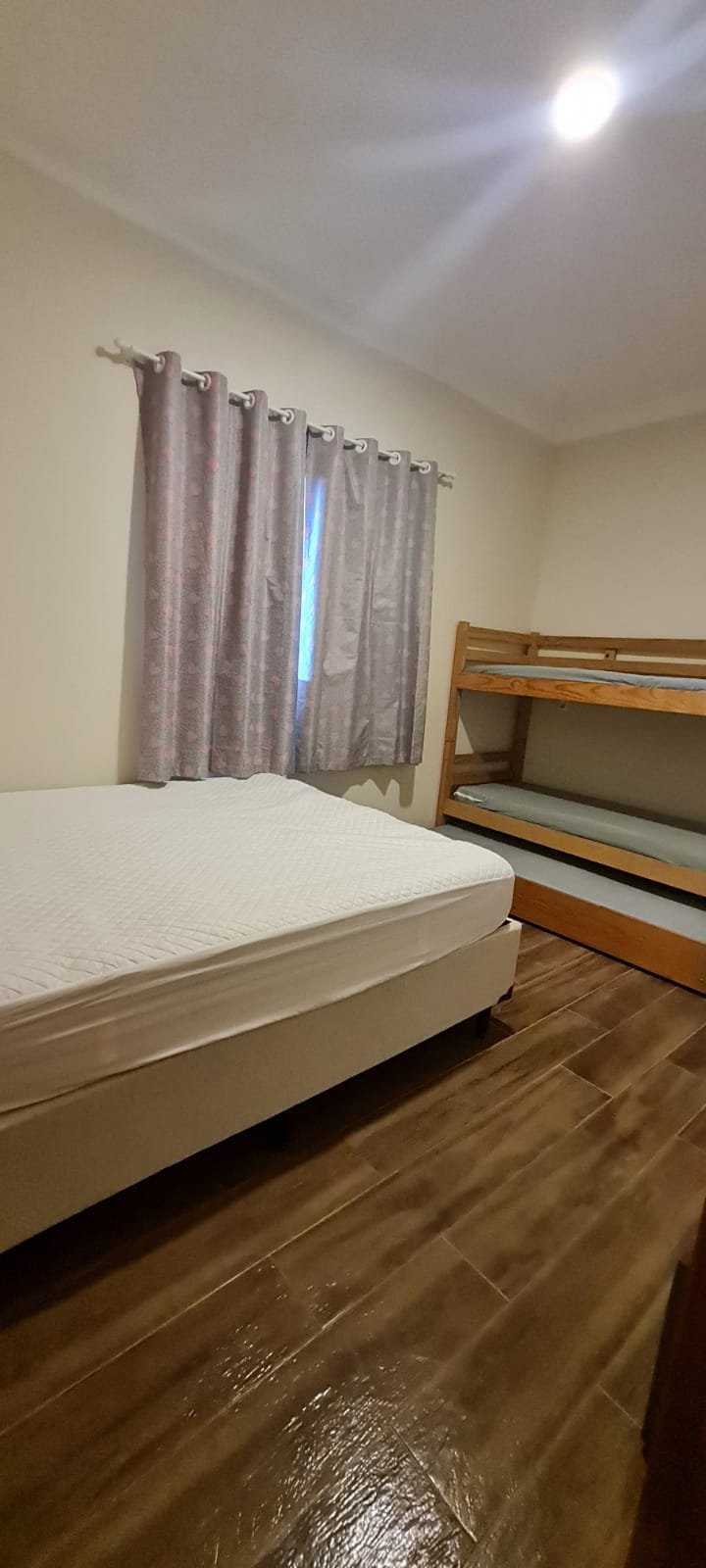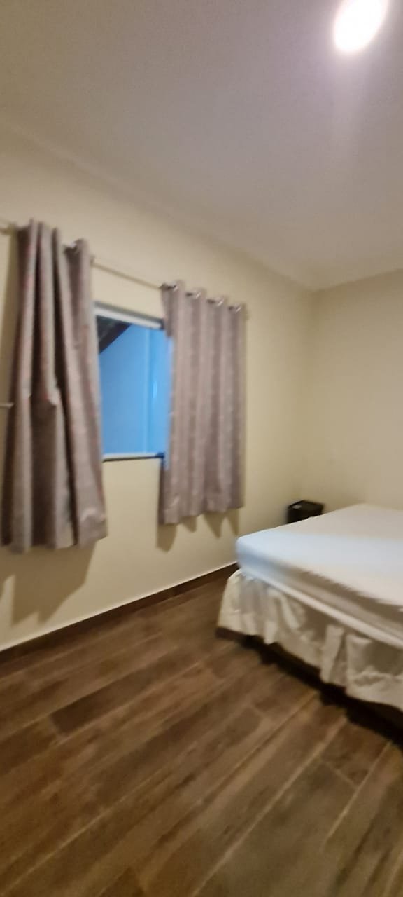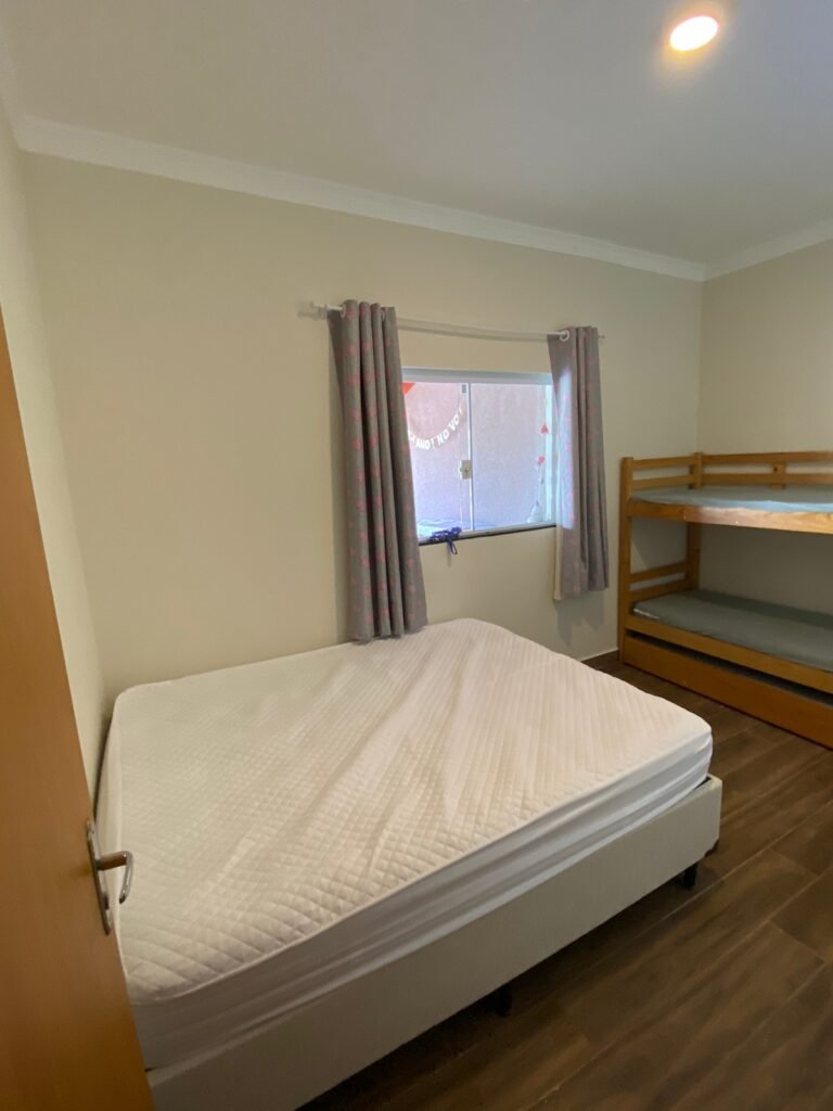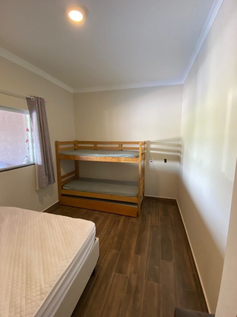 Dormitório 01:- Piso cerâmico em ordem, rodapés em ordem, teto com a pintura na cor branco marca Suvinil recém-pintado em ordem, gola de gesso com a pintura na cor branco marca Suvinil recém-pintado em ordem, paredes com a pintura na cor algodão egípcio marca Suvinil recém-pintado em ordem, uma portade madeira com maçaneta em ordem, chave em ordem, dobradiças em ordem, guarnição em ambos oslados em ordem, uma janela de alumínio de vidro temperado de correr com fechadura e chaves em ordem,01 espelho com modulo de luz em ordem, 01 espelho com modulo de energia em ordem, 01 espelho com 02 módulos de energia um sendo 220 v e outro normal em ordem, 01 espelho com dois módulos sendo um deluz e outro energia em ordem, 01 luminária painel led plafon sobrepor redondo 25 w amarelo em ordem, 01 cortina blackout em ordem, um varão e ordem, uma treliche de madeira em ordem, 04 colchoes de solteiro em ordem, uma cama box com um colchão de casal em ordem, 01 colchão avulso Queem em ordem, todos os colchões com capa em ordem, 01 espelho instalado atraz da porta em ordem,