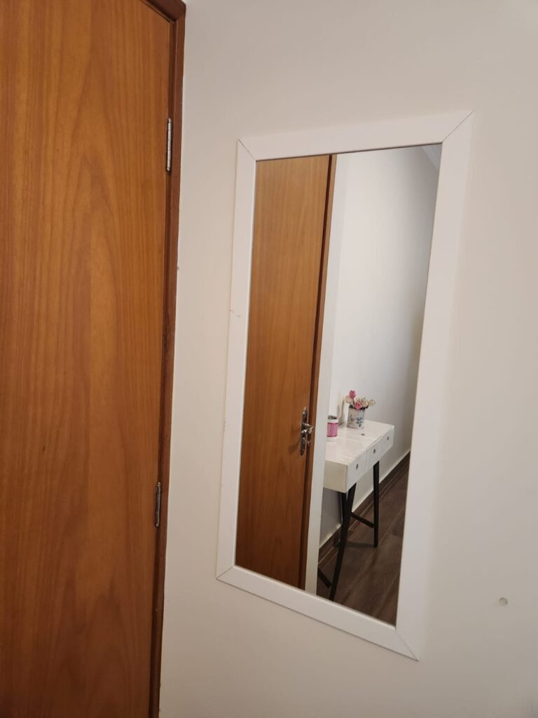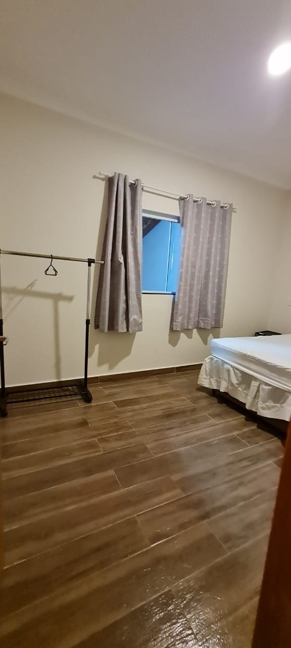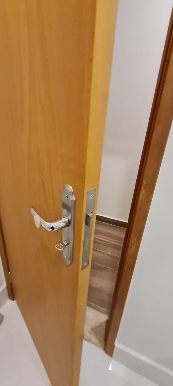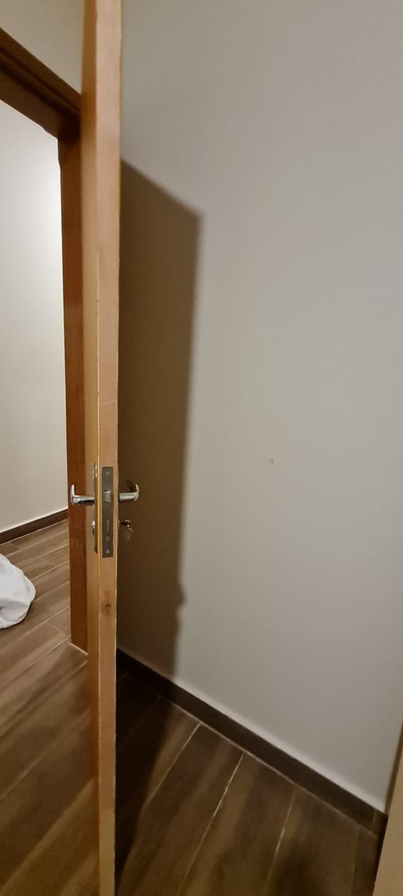 Dormitório 01:- Piso cerâmico em ordem, rodapés em ordem, teto com a pintura na cor branco marca Suvinil recém-pintado em ordem, gola de gesso com a pintura na cor branco marca Suvinil recém-pintado em ordem, paredes com a pintura na cor algodão egípcio marca Suvinil recém-pintado em ordem, uma portade madeira com maçaneta em ordem, chave em ordem, dobradiças em ordem, guarnição em ambos oslados em ordem, uma janela de alumínio de vidro temperado de correr com fechadura e chaves em ordem,01 espelho com modulo de luz em ordem, 01 espelho com modulo de energia em ordem, 01 espelho com 02 módulos de energia um sendo 220 v e outro normal em ordem, 01 espelho com dois módulos sendo um deluz e outro energia em ordem, 01 luminária painel led plafon sobrepor redondo 25 w amarelo em ordem, 01 cortina blackout em ordem, um varão e ordem, uma treliche de madeira em ordem, 04 colchoes de solteiro em ordem, uma cama box com um colchão de casal em ordem, 01 colchão avulso Queem em ordem, todos os colchões com capa em ordem, 01 espelho instalado atraz da porta em ordem,