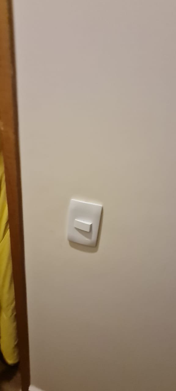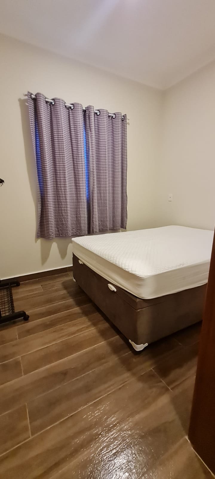 Dormitório 02:- Piso cerâmico em ordem, rodapés em ordem, teto com a pintura na cor branco marca Suvinil recém-pintado em ordem, gola de gesso com a pintura na cor branco marca Suvinil recém-pintado em ordem, paredes com a pintura na cor algodão egípcio marca Suvinil recém-pintado em ordem, uma porta de madeira com maçaneta em ordem, chave em ordem, dobradiças em ordem, guarnição em ambos os ladosem ordem, uma janela de alumínio de vidro temperado de correr com fechadura e chaves em ordem, 01espelho com modulo de luz em ordem, 01 espelho com modulo de energia em ordem, 01 espelho com 02 módulos de energia um sendo 220 v e outro normal em ordem, 01 espelho com dois módulos sendo um deluz e outro energia em ordem, 01 luminária painel led plafon sobrepor redondo 25 w amarelo em ordem, 01 cortina blackout em ordem, um varão e ordem, 01 cama Box baú de casal em ordem, 01 cama box com um colchão de casal em ordem, uma capa para colchão em ordem, 01 cabideiro em ordem.