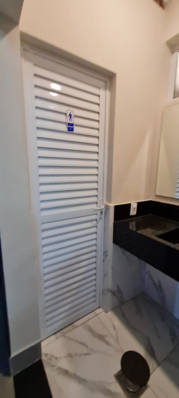 WC Masculino:-Piso cerâmico em ordem, teto com a pintura na cor branco marca Suvinil recém-pintado em ordem, gola de gesso com a pintura na cor branco marca Suvinil recém-pintado em ordem, um spot de luz deled em ordem, meia parede de piso cerâmico em ordem com o restante da meia parede com a pintura na coralgodão egípcio Suvinil recém-pintado em ordem, um kit de vaso sanitário cerâmica branco com caixa acoplada marca Icasa em ordem, uma tampa de vaso sanitário marca Icasa em ordem, uma lixeira debanheiro com tampa e porta papel higiênico em ordem, um espelho de luz em ordem, uma porta de alumínio escovado com a pintura na cor branco em ordem, maçaneta com chaves em ordem, dobradiças em ordem.