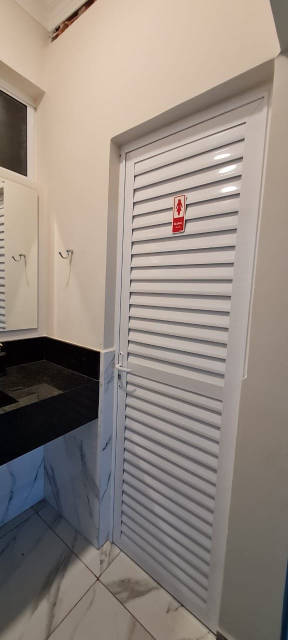 WC Feminino:-Piso cerâmico em ordem, teto com a pintura na cor branco marca Suvinil recém-pintado emordem, gola de gesso com a pintura na cor branco marca Suvinil recém-pintado em ordem, um spot de luz deled em ordem, meia parede de piso cerâmico em ordem com o restante da meia parede com a pintura na coralgodão egípcio Suvinil recém-pintado em ordem, um kit de vaso sanitário cerâmica branco com caixaacoplada marca Icasa em ordem, uma tampa de vaso sanitário marca Icasa em ordem, uma lixeira debanheiro com tampa e porta papel higiênico em ordem, um espelho de luz em ordem, uma porta de alumínioescovado com a pintura na cor branco em ordem, maçaneta com chaves em ordem, dobradiças em ordem.
