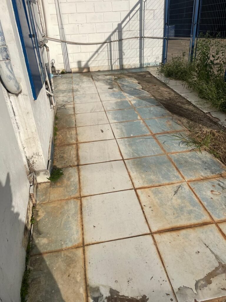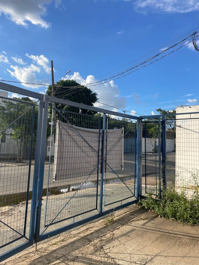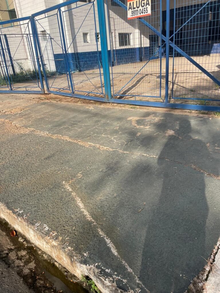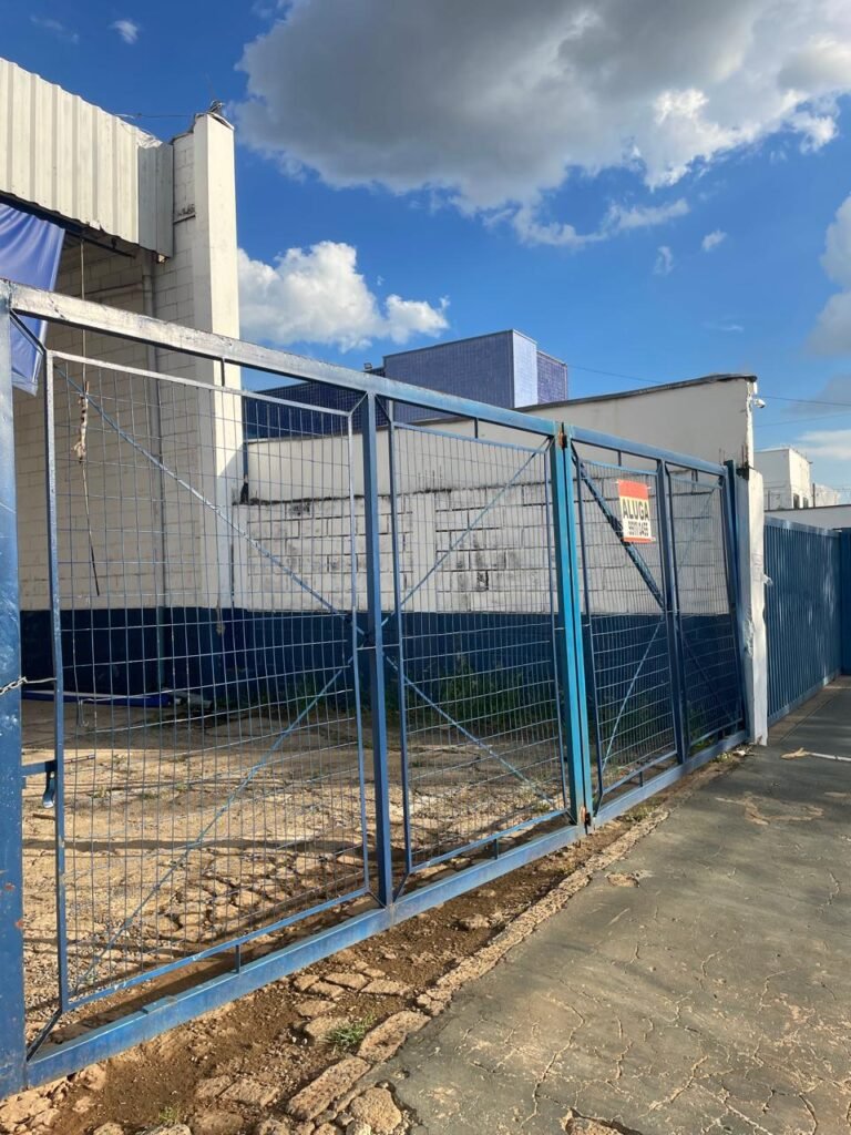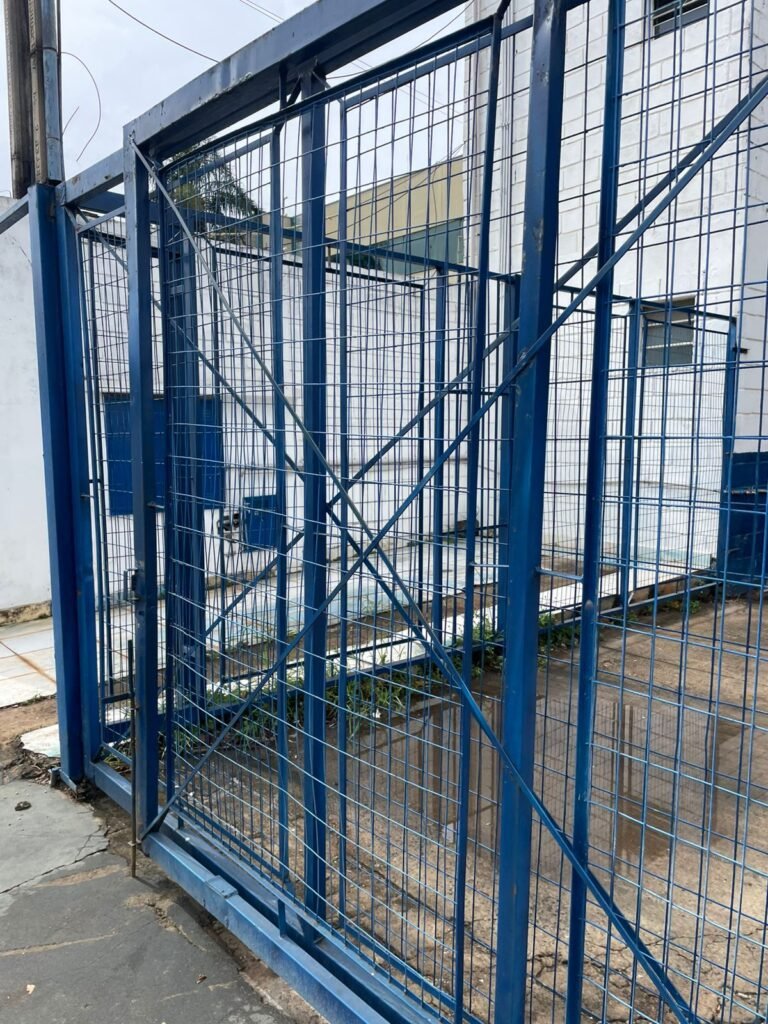 FACHADA:- Calçada piso concreto desempenado e parte revestida de pisos frio cerâmico, com buracos, sem matos para aparar, remendos e restante em ordem, portões de grade de ferro com pintura na cor azul em ordem, corrente com cadeado em ordem, padrão de forças em ordem, cavalete d’agua em ordem, 01 torneira de jardim em ordem, fachada do galpão com pintura na cor branco neve e azul com desgastes naturais em ordem, muros e paredes do escritório de blocos aparente com pintura barrado tinta óleo na cor azul e restante tinta pva na cor branco neve com desgastes naturais e restante em ordem, piso do pátio de concreto desempenado com buracos, desgastes naturais e mato alto, escada de ferro de 04 degraus, com guarda corpo em ordem, com pintura na cor azul com desgastes naturais e restante em ordem, estrutura do telhado de ferro e e fechamento em telhas galvanizadas com pintura na cor branco com desgastes naturais e restante em ordem, 06 trocadores de ar em ordem, condutores de água em pvc em ordem, 05 luminárias duplas com 09 lâmpadas em ordem, 02 toldos vinil na cor azul novos e em ordem.