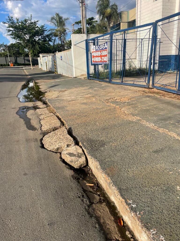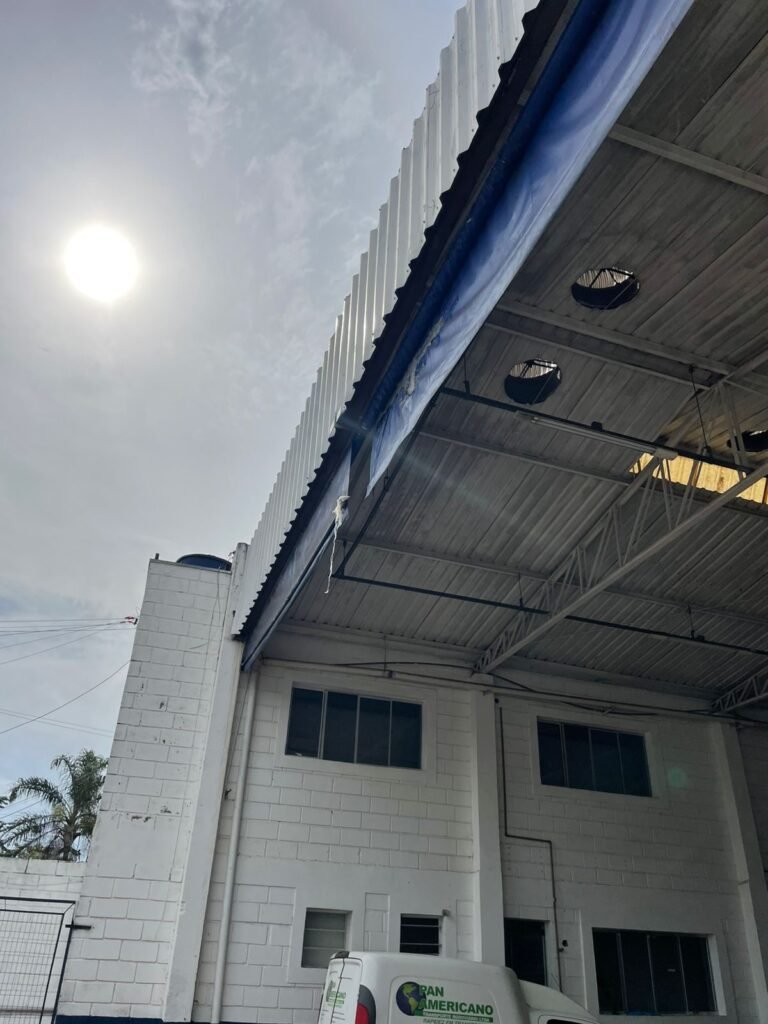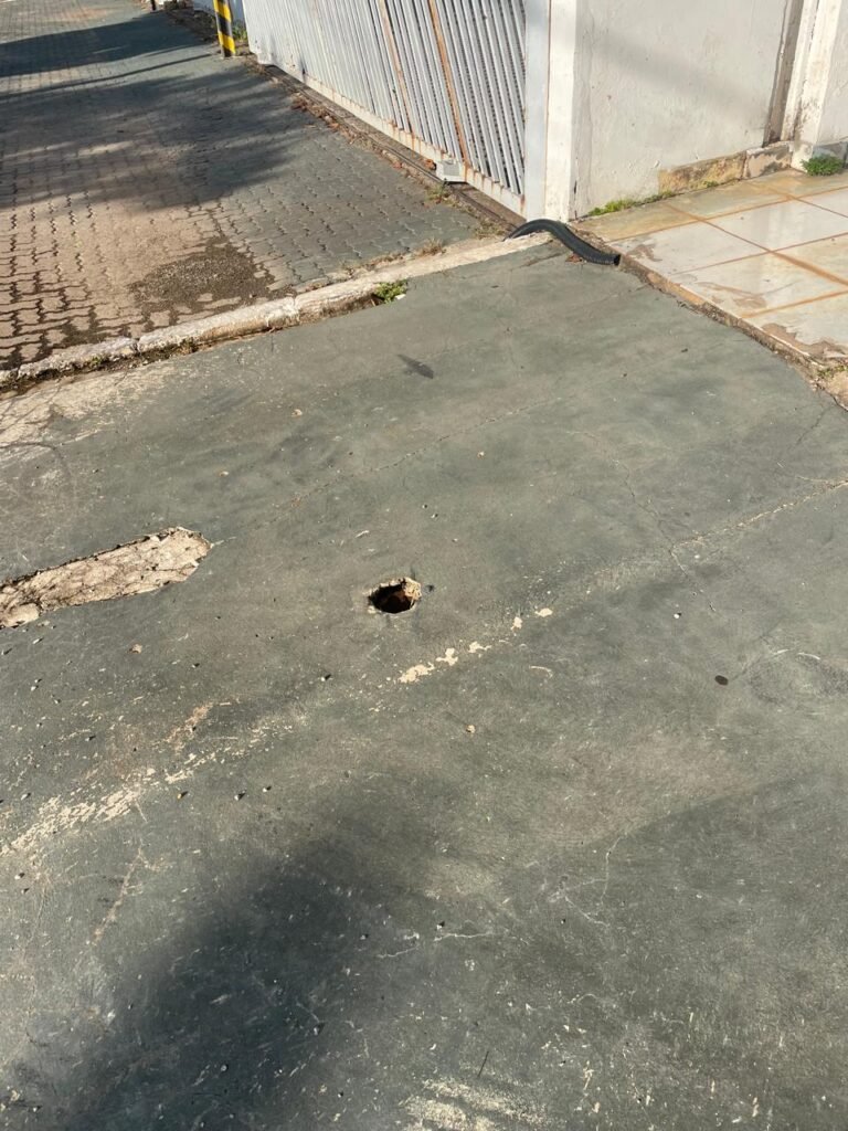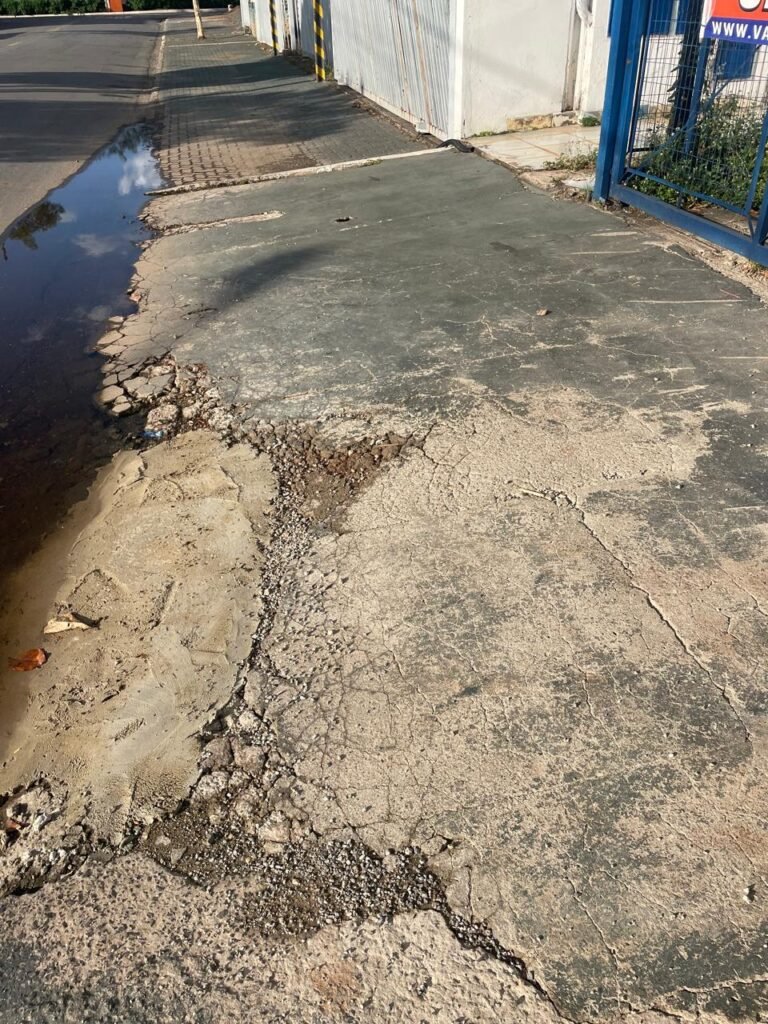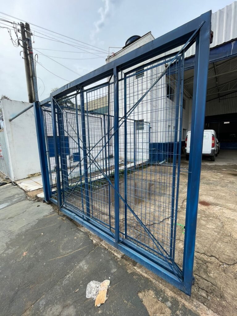 FACHADA:- Calçada piso concreto desempenado e parte revestida de pisos frio cerâmico, com buracos, sem matos para aparar, remendos e restante em ordem, portões de grade de ferro com pintura na cor azul em ordem, corrente com cadeado em ordem, padrão de forças em ordem, cavalete d’agua em ordem, 01 torneira de jardim em ordem, fachada do galpão com pintura na cor branco neve e azul com desgastes naturais em ordem, muros e paredes do escritório de blocos aparente com pintura barrado tinta óleo na cor azul e restante tinta pva na cor branco neve com desgastes naturais e restante em ordem, piso do pátio de concreto desempenado com buracos, desgastes naturais e mato alto, escada de ferro de 04 degraus, com guarda corpo em ordem, com pintura na cor azul com desgastes naturais e restante em ordem, estrutura do telhado de ferro e e fechamento em telhas galvanizadas com pintura na cor branco com desgastes naturais e restante em ordem, 06 trocadores de ar em ordem, condutores de água em pvc em ordem, 05 luminárias duplas com 09 lâmpadas em ordem, 02 toldos vinil na cor azul novos e em ordem.