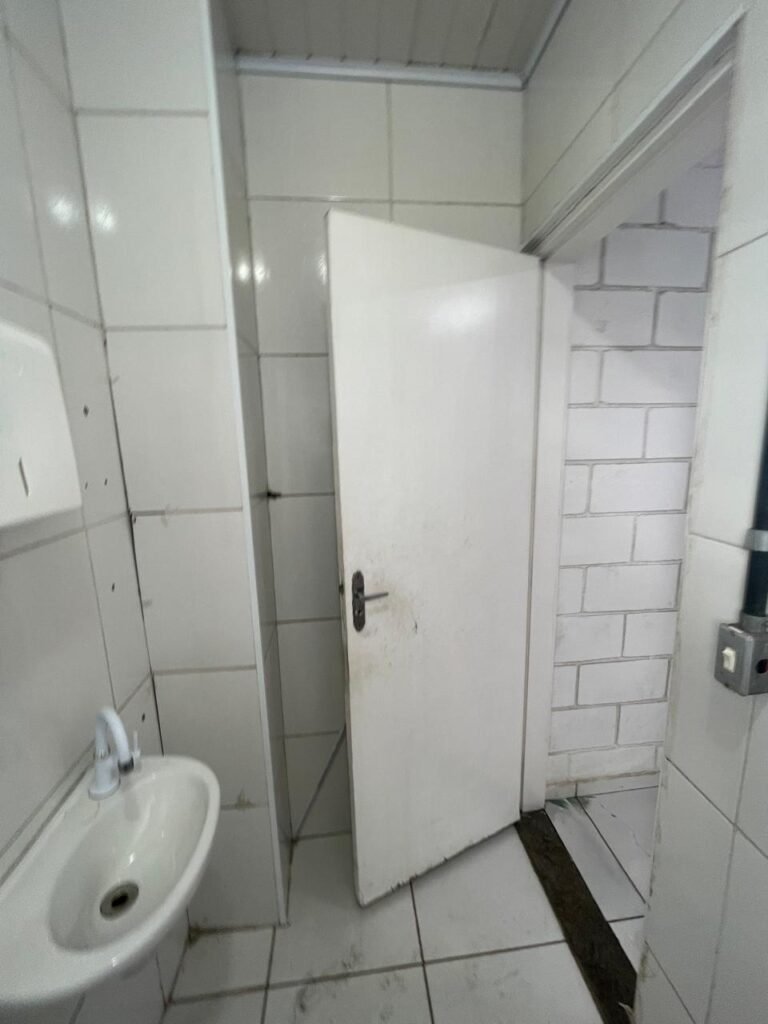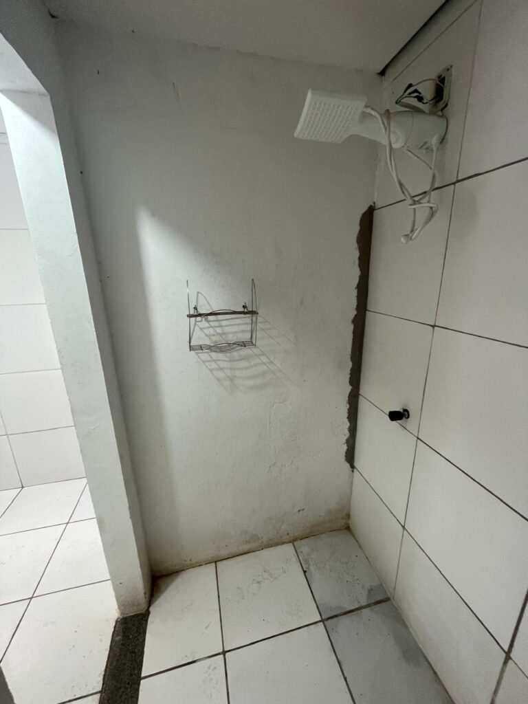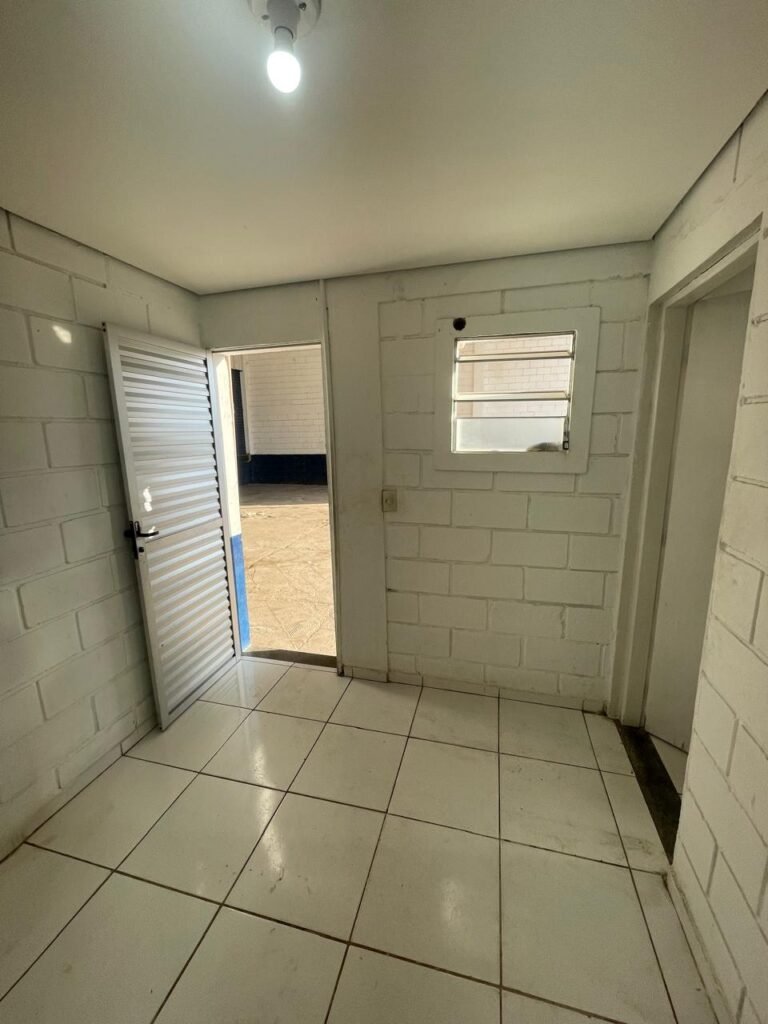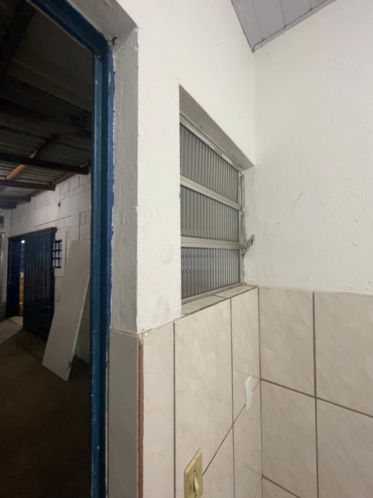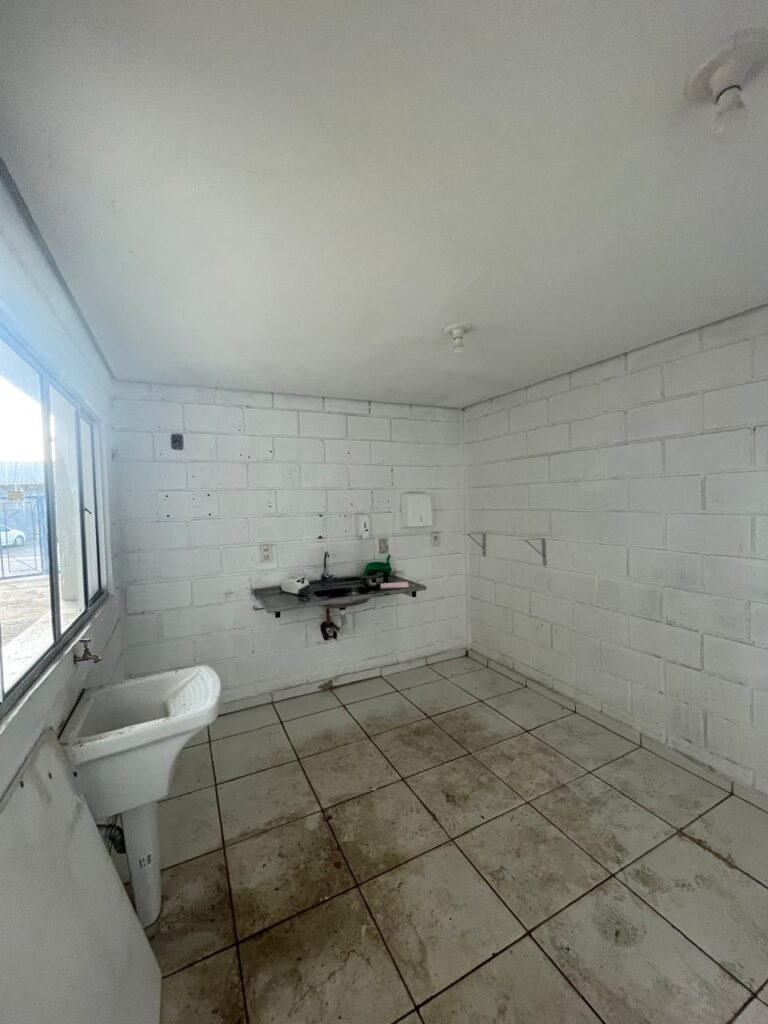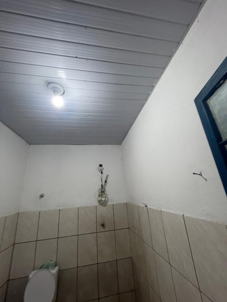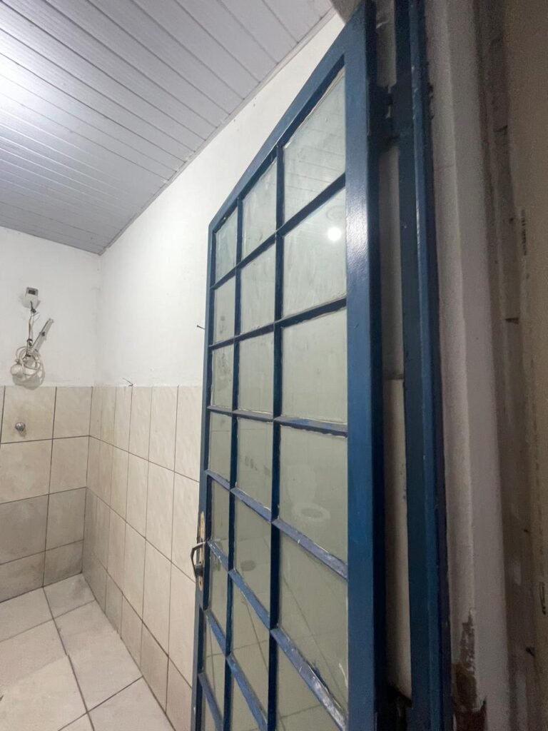 FUNDOS:- Piso de concreto, 01 porta de correr de ferro na cor azul com vidros em ordem 01 taque de concreto, 01 troneia de inox em ordem, 01 registo de plástico na cor laranja em ordem, 01 bocal com lâmpada em ordem, teto com estrutura de madeira e telha Brasilit, 01 interruptor em ordem.
