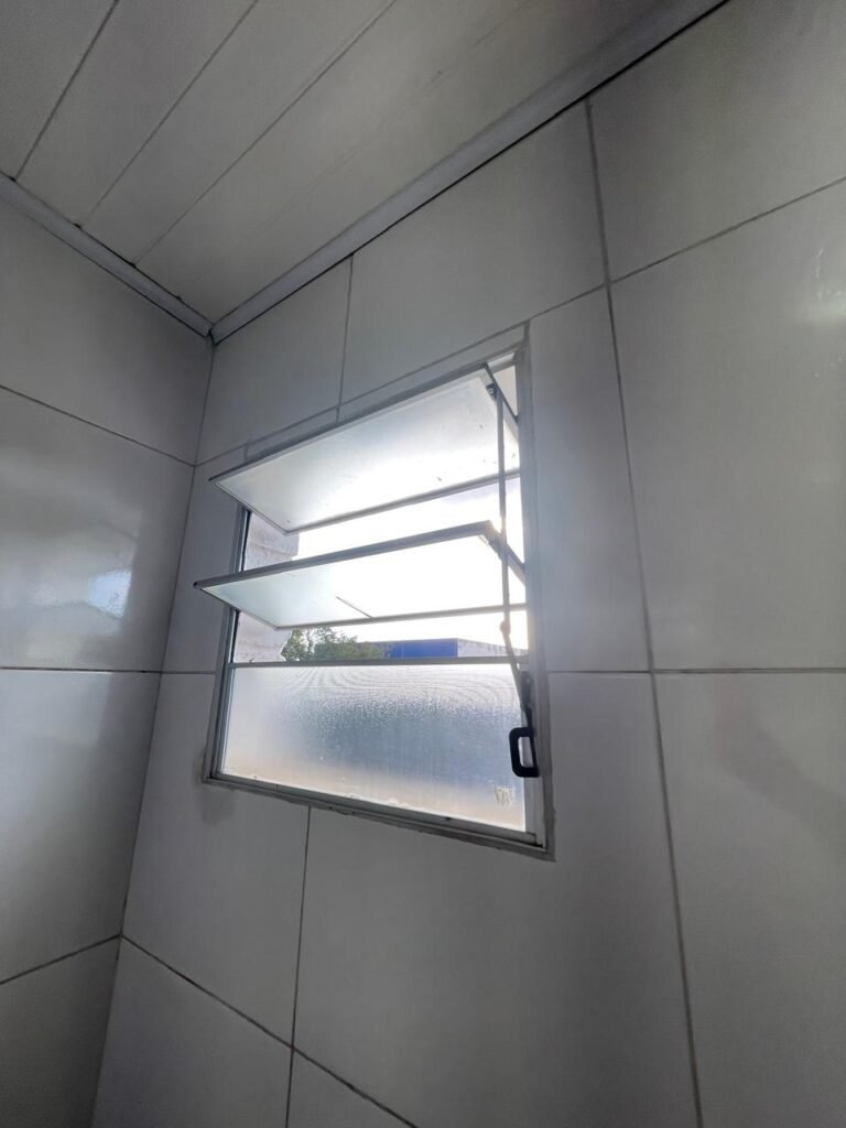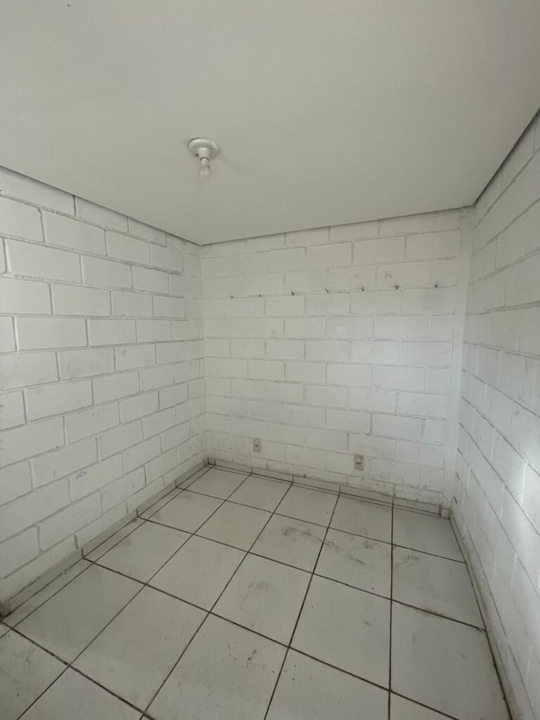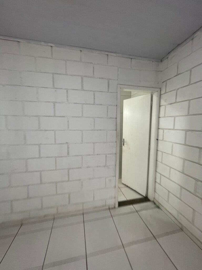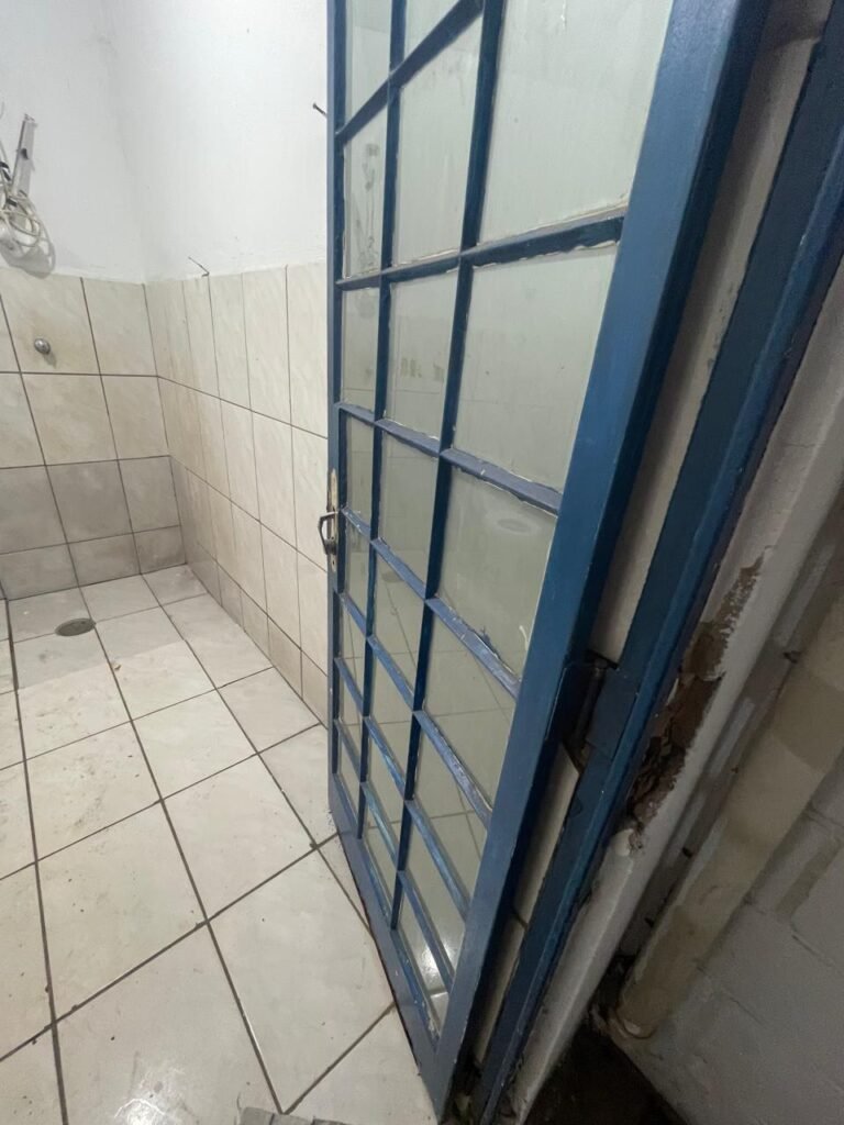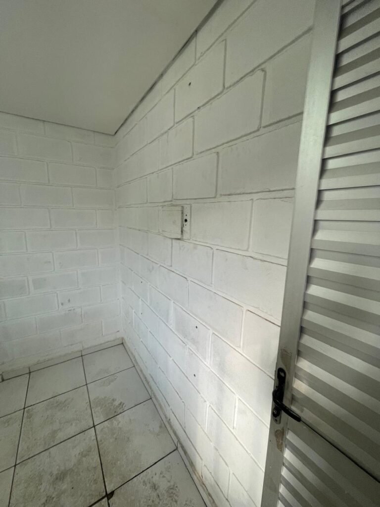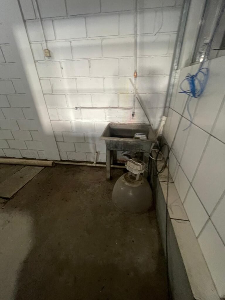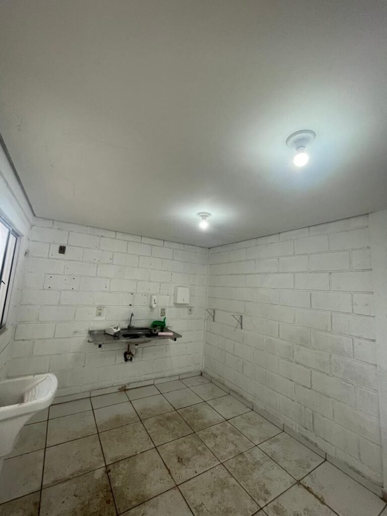FUNDOS:- Piso de concreto, 01 porta de correr de ferro na cor azul com vidros em ordem 01 taque de concreto, 01 troneia de inox em ordem, 01 registo de plástico na cor laranja em ordem, 01 bocal com lâmpada em ordem, teto com estrutura de madeira e telha Brasilit, 01 interruptor em ordem.