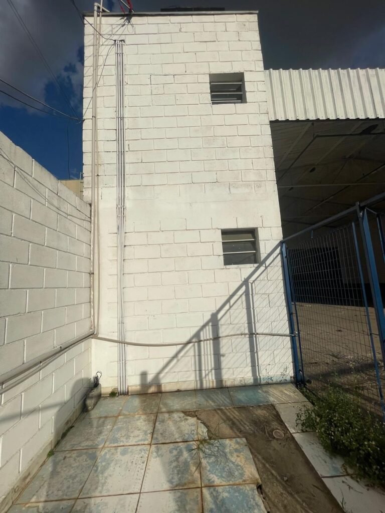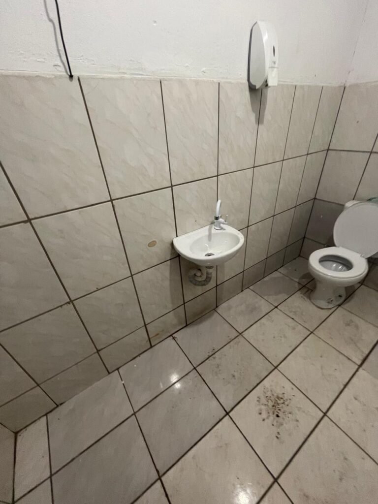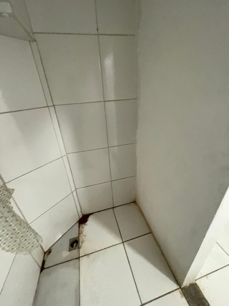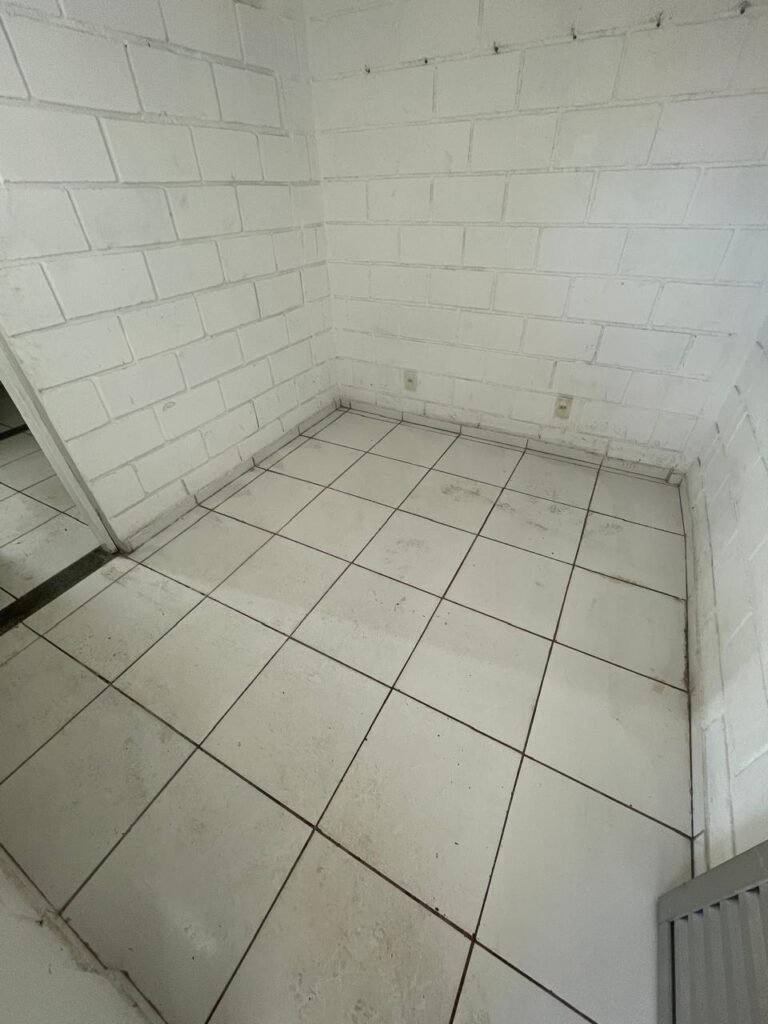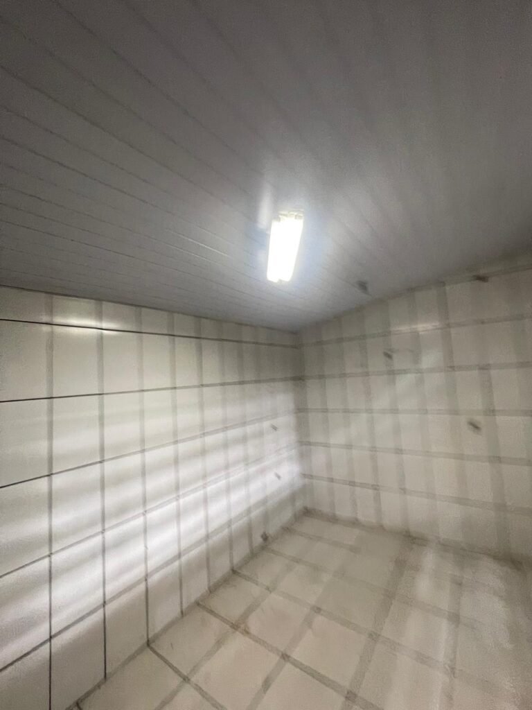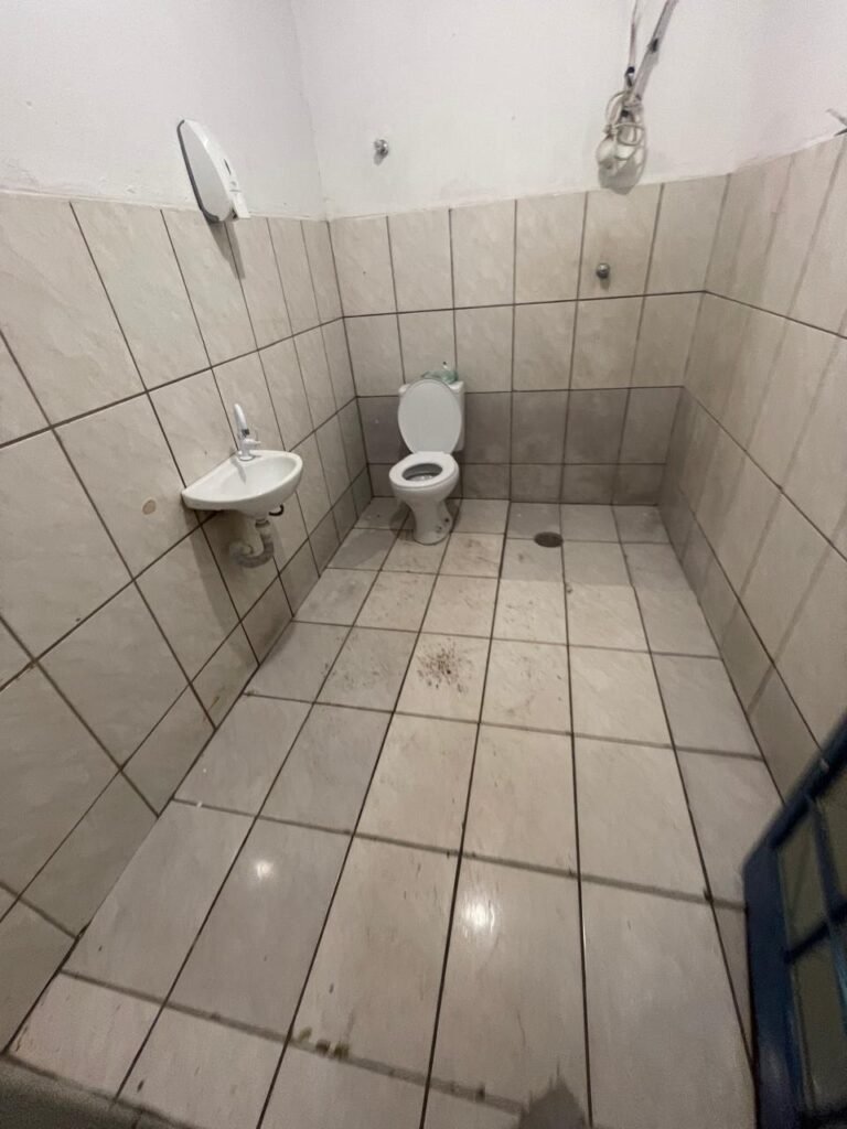 FUNDOS:- Piso de concreto, 01 porta de correr de ferro na cor azul com vidros em ordem 01 taque de concreto, 01 troneia de inox em ordem, 01 registo de plástico na cor laranja em ordem, 01 bocal com lâmpada em ordem, teto com estrutura de madeira e telha Brasilit, 01 interruptor em ordem.