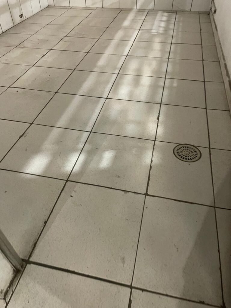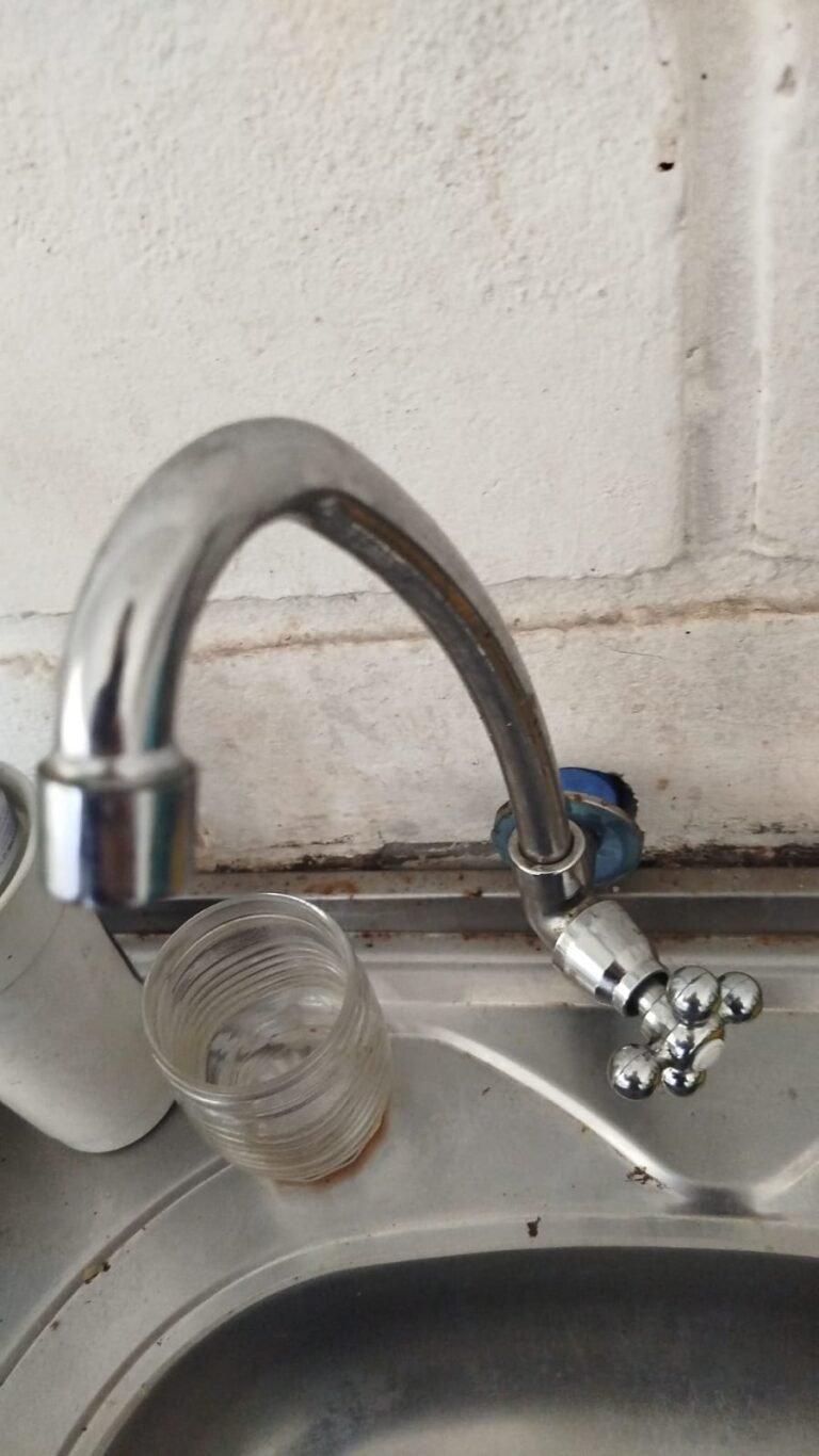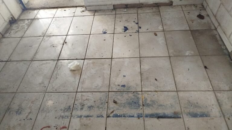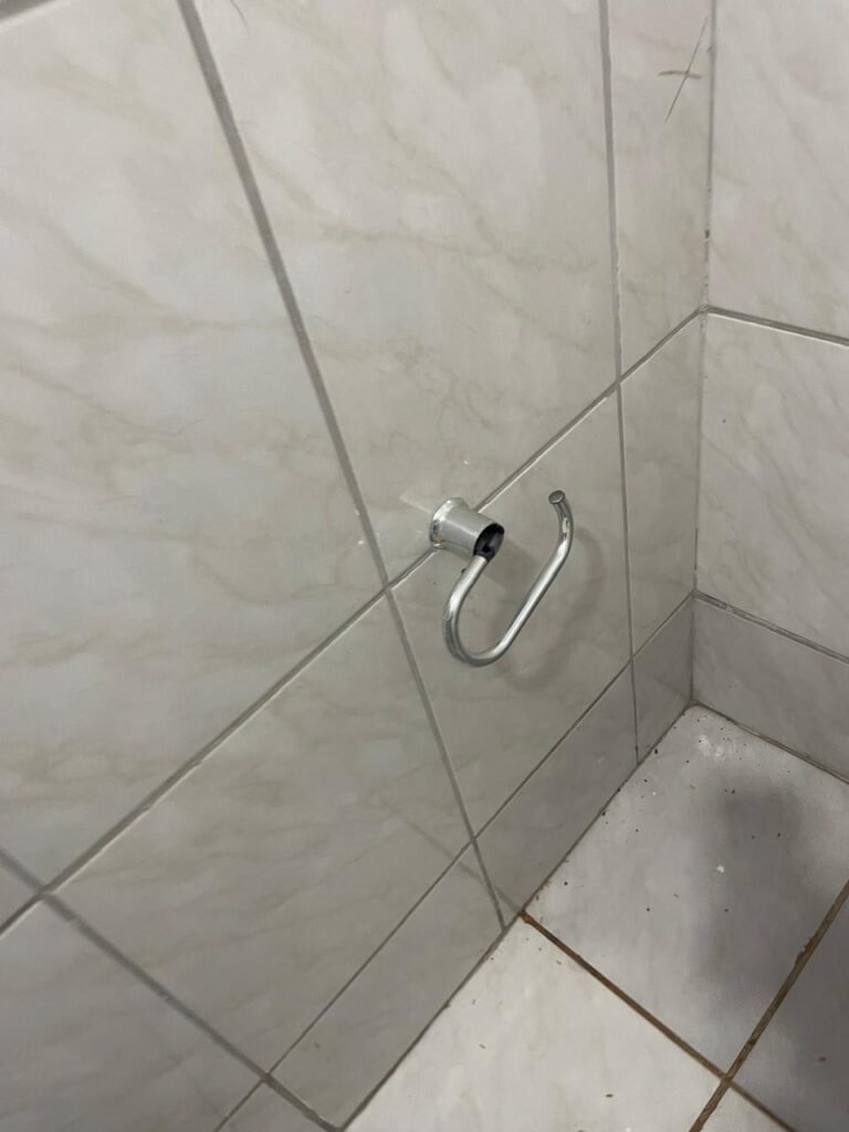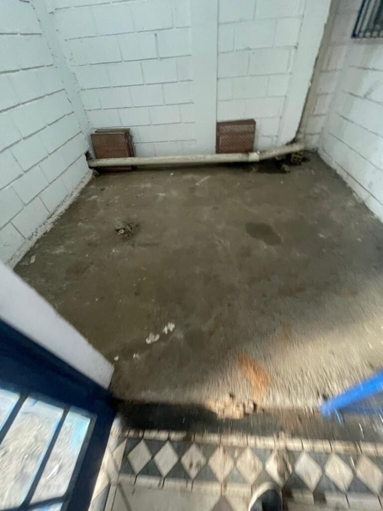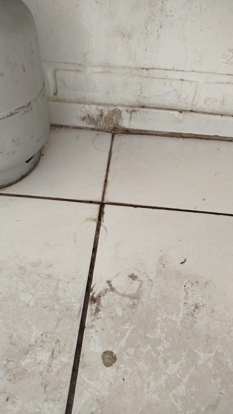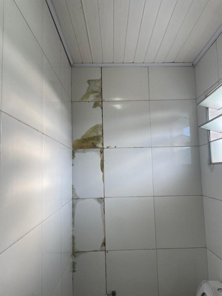 FUNDOS:- Piso de concreto, 01 porta de correr de ferro na cor azul com vidros em ordem 01 taque de concreto, 01 troneia de inox em ordem, 01 registo de plástico na cor laranja em ordem, 01 bocal com lâmpada em ordem, teto com estrutura de madeira e telha Brasilit, 01 interruptor em ordem.