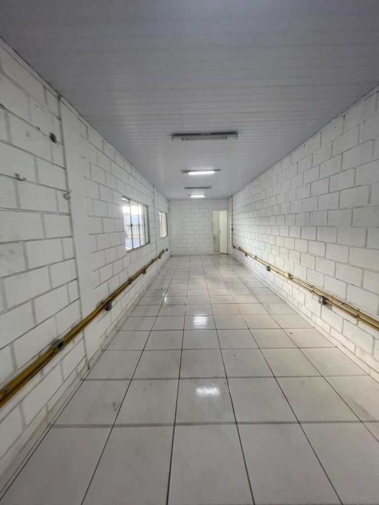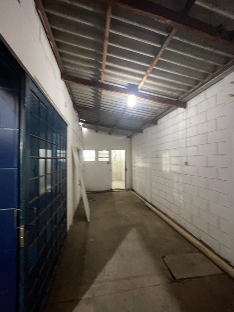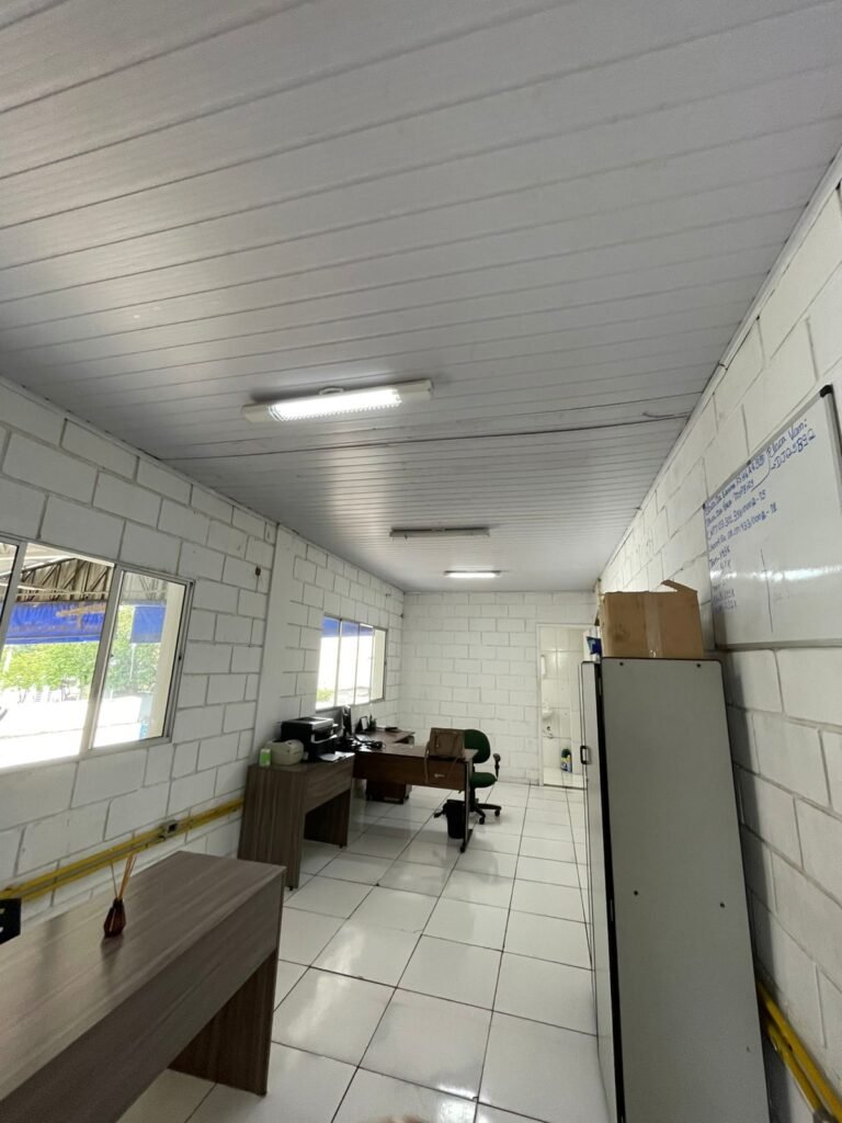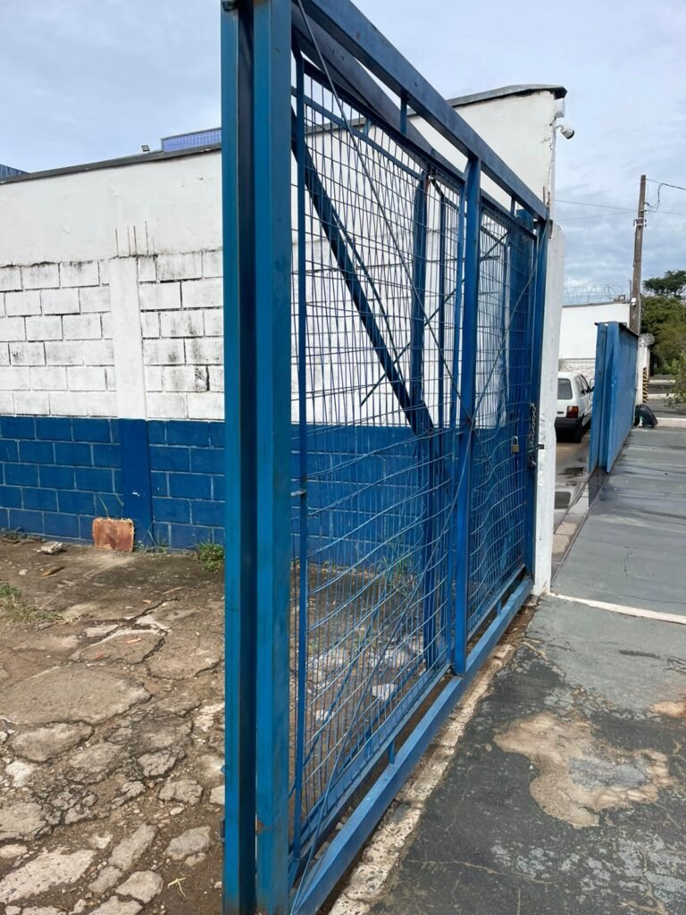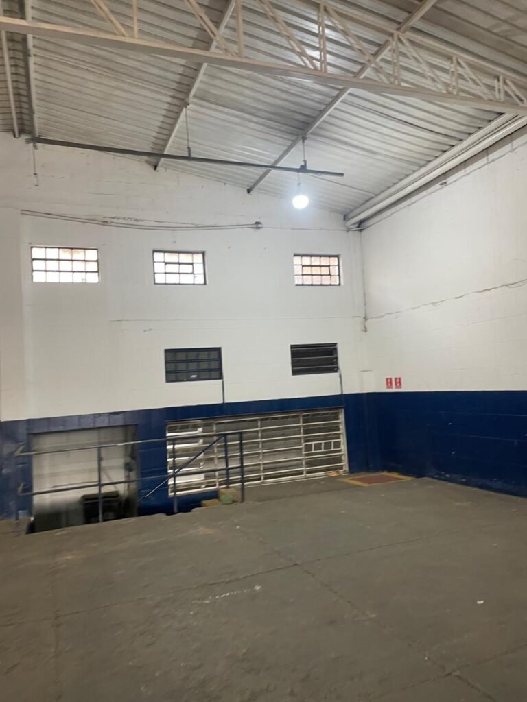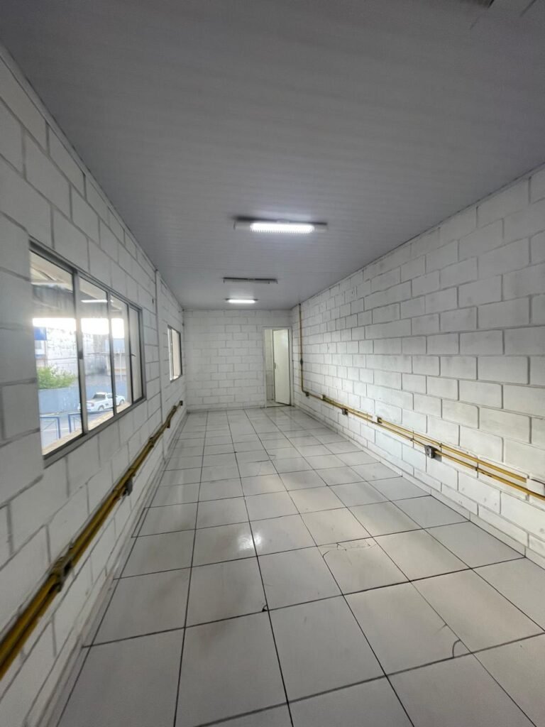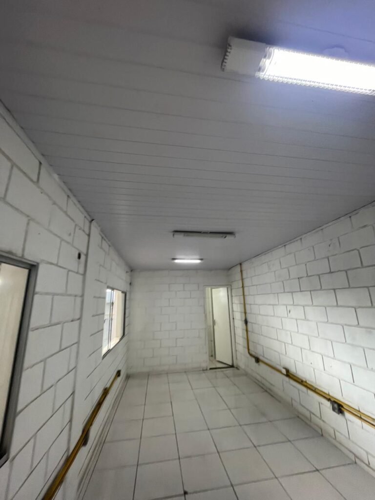 GALPÃO:- piso concreto desempenado com desgaste natural restante em ordem, paredes parte com azulejo e restante blocos aparentes ambos com pintura sendo barrado na cor azul e restante na cor branco neve em ordem, 08 vitrôs em ordem, telhado com estrutura de ferro com pintura na cor branco com desgaste e sujeira restante em ordem, 06 trocadores de ar em ordem, 02 lustres em ordem, 02 lâmpadas mistas 400 watts, 09 vitrô de ferro com pintura na cor azul, 217 vidros lisos transparentes sendo que 02 vidros estão quebrados restante em ordem, 05 portas de aço de enrolar em ordem, molas em ordem, 01 fechadura com 02 chaves tetra com travas tipo ferrolho em ordem, guarda-corpo de ferro com pintura na cor azul em ordem, quadro de disjuntores, 06 disjuntores sendo Siemens 55×12 03 tomadas em ordem, 02 interruptores em ordem, escada de ferro em chapa xadrez com corrimão e guarda corpo com pintura na cor azul em ordem.