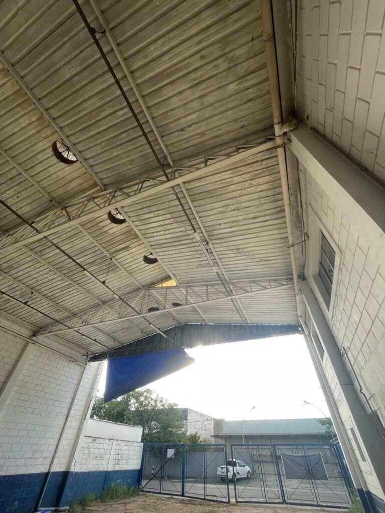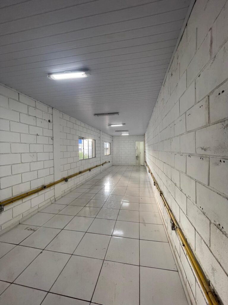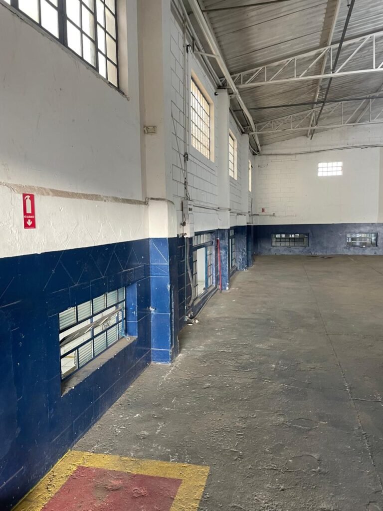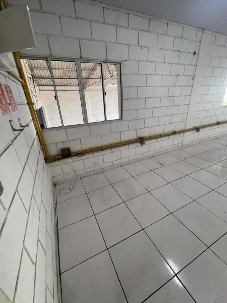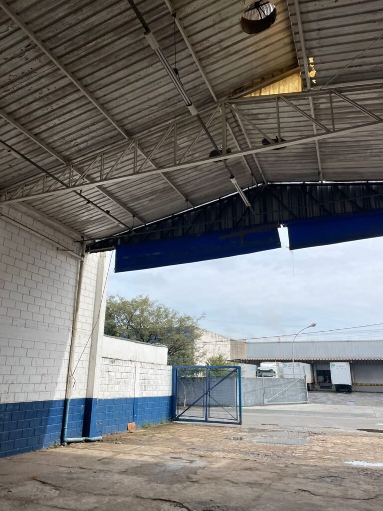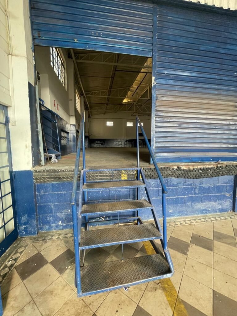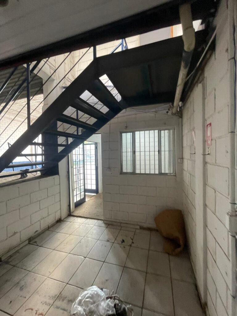 GALPÃO:- piso concreto desempenado com desgaste natural restante em ordem, paredes parte com azulejo e restante blocos aparentes ambos com pintura sendo barrado na cor azul e restante na cor branco neve em ordem, 08 vitrôs em ordem, telhado com estrutura de ferro com pintura na cor branco com desgaste e sujeira restante em ordem, 06 trocadores de ar em ordem, 02 lustres em ordem, 02 lâmpadas mistas 400 watts, 09 vitrô de ferro com pintura na cor azul, 217 vidros lisos transparentes sendo que 02 vidros estão quebrados restante em ordem, 05 portas de aço de enrolar em ordem, molas em ordem, 01 fechadura com 02 chaves tetra com travas tipo ferrolho em ordem, guarda-corpo de ferro com pintura na cor azul em ordem, quadro de disjuntores, 06 disjuntores sendo Siemens 55×12 03 tomadas em ordem, 02 interruptores em ordem, escada de ferro em chapa xadrez com corrimão e guarda corpo com pintura na cor azul em ordem.